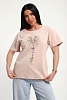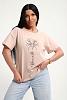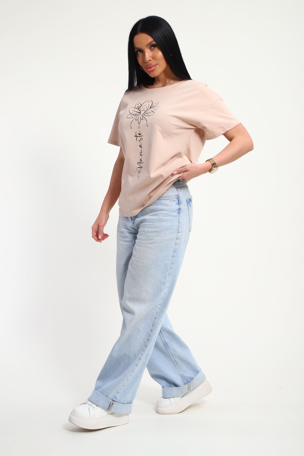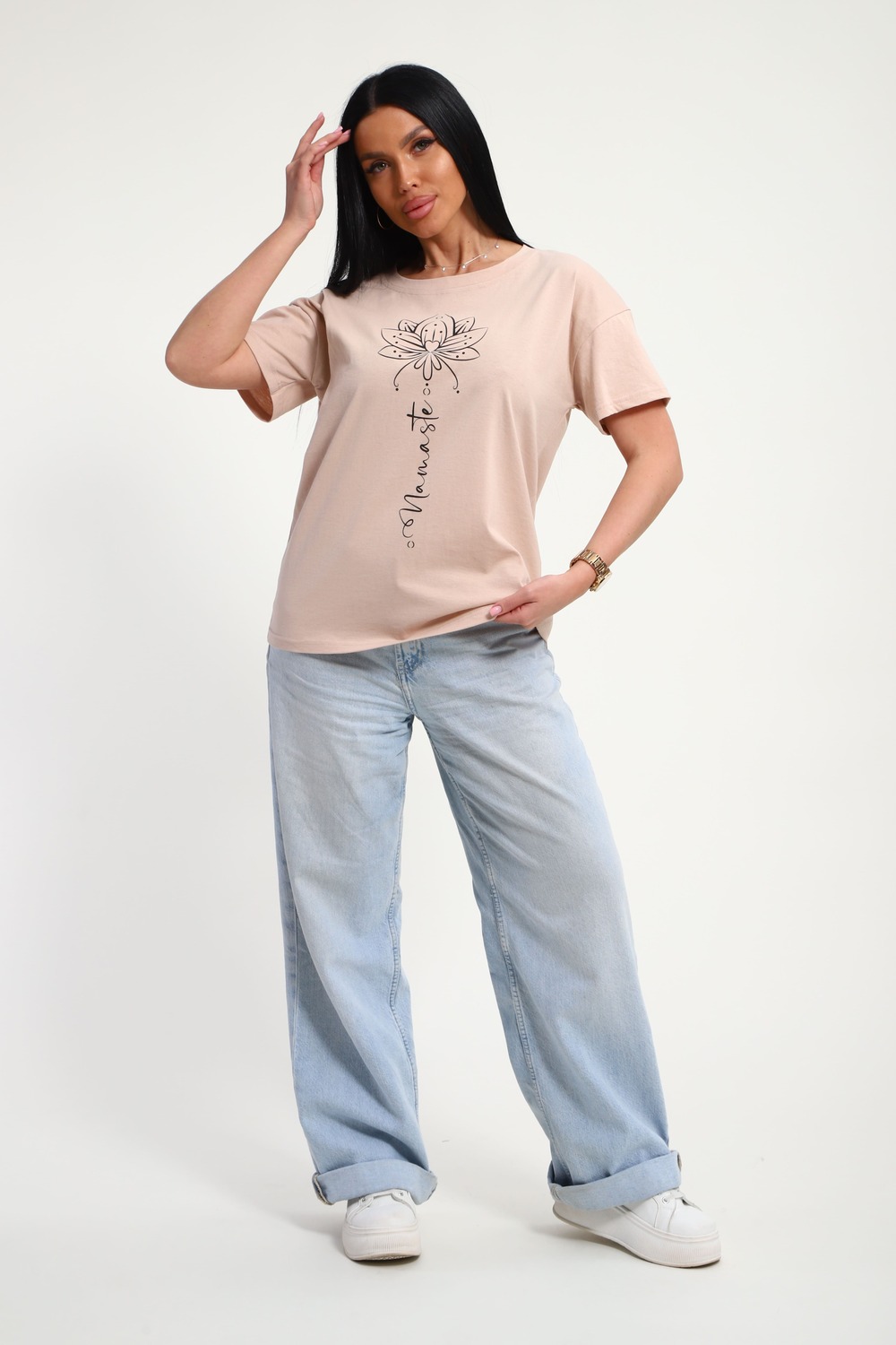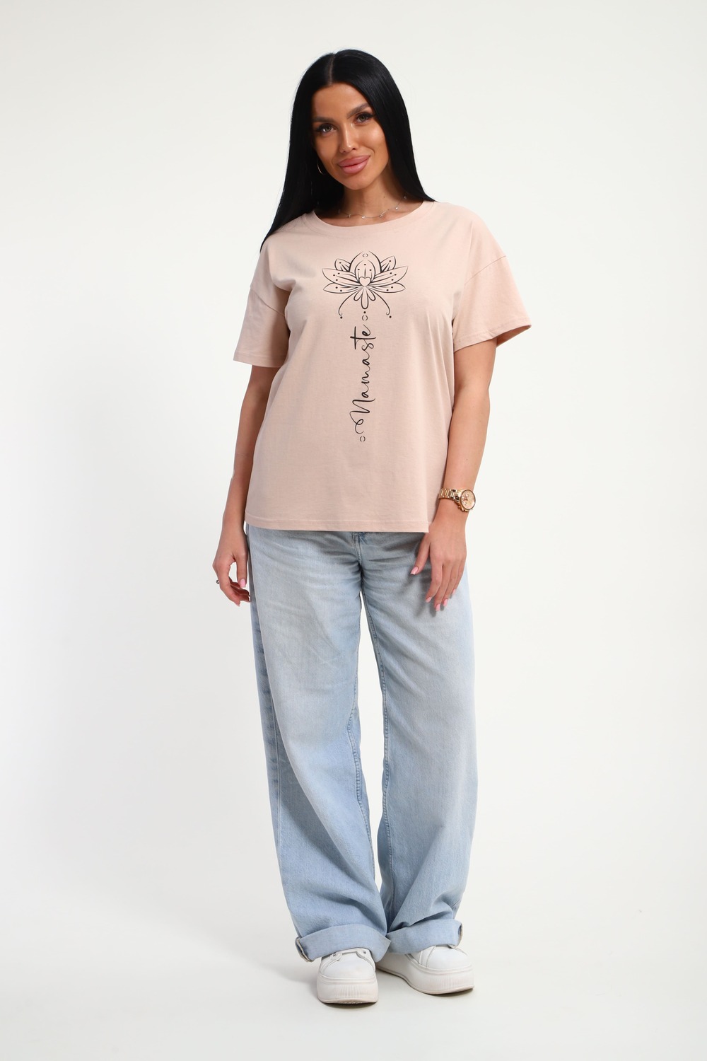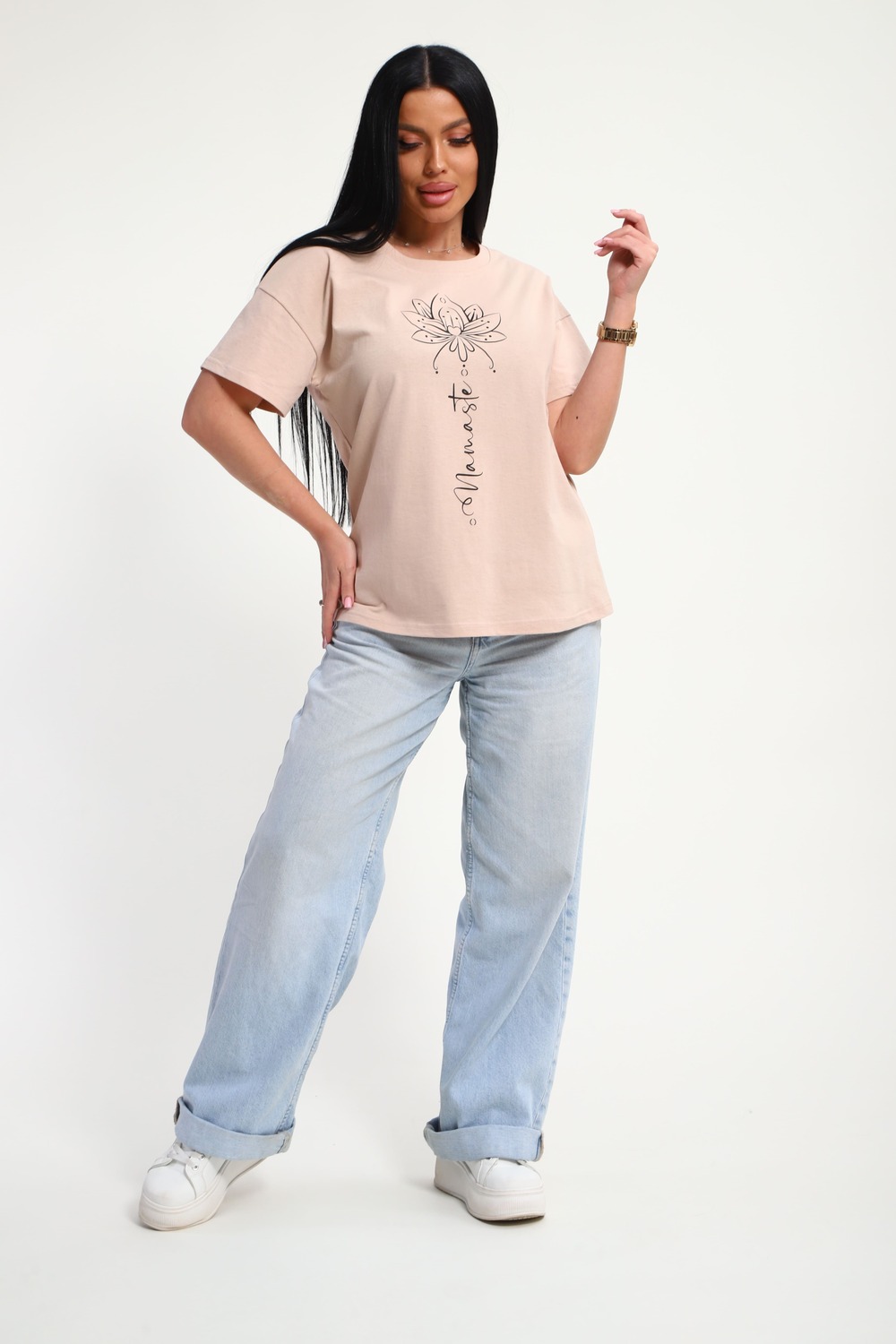 Футболка женская из гладкокрашеного трикотажа, хлопок 100%. Прямого силуэта, свободного облегания. горловина круглой формы. Рукав короткий. Низ изделия прямой. На полочке принт, шелкография.