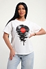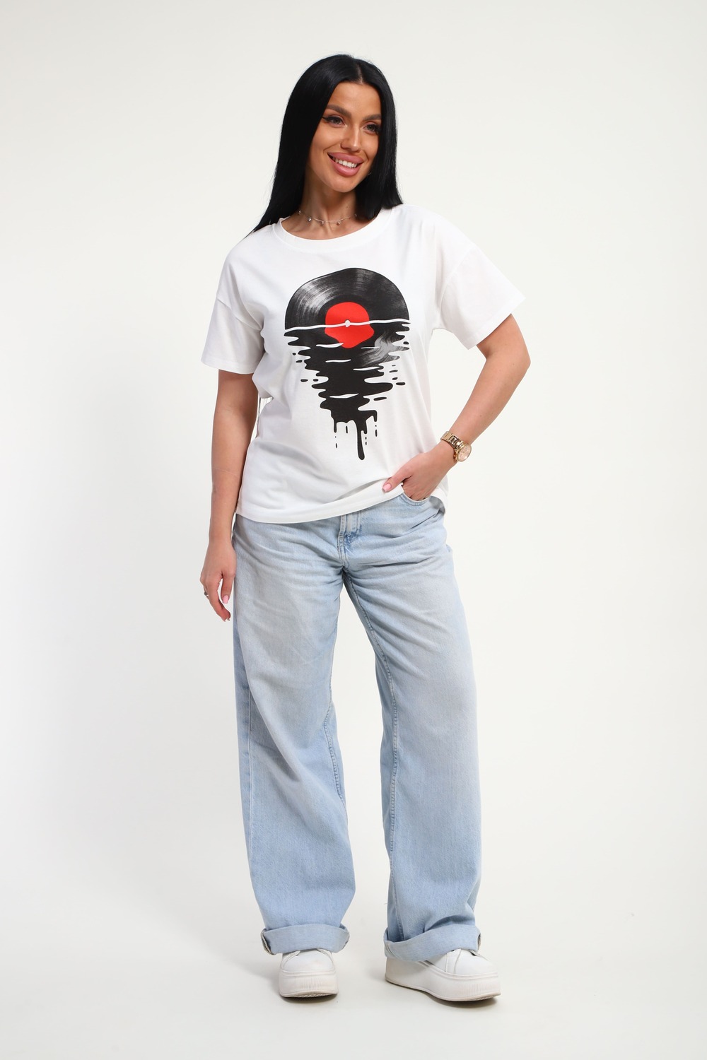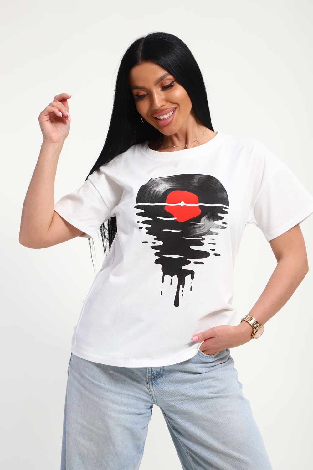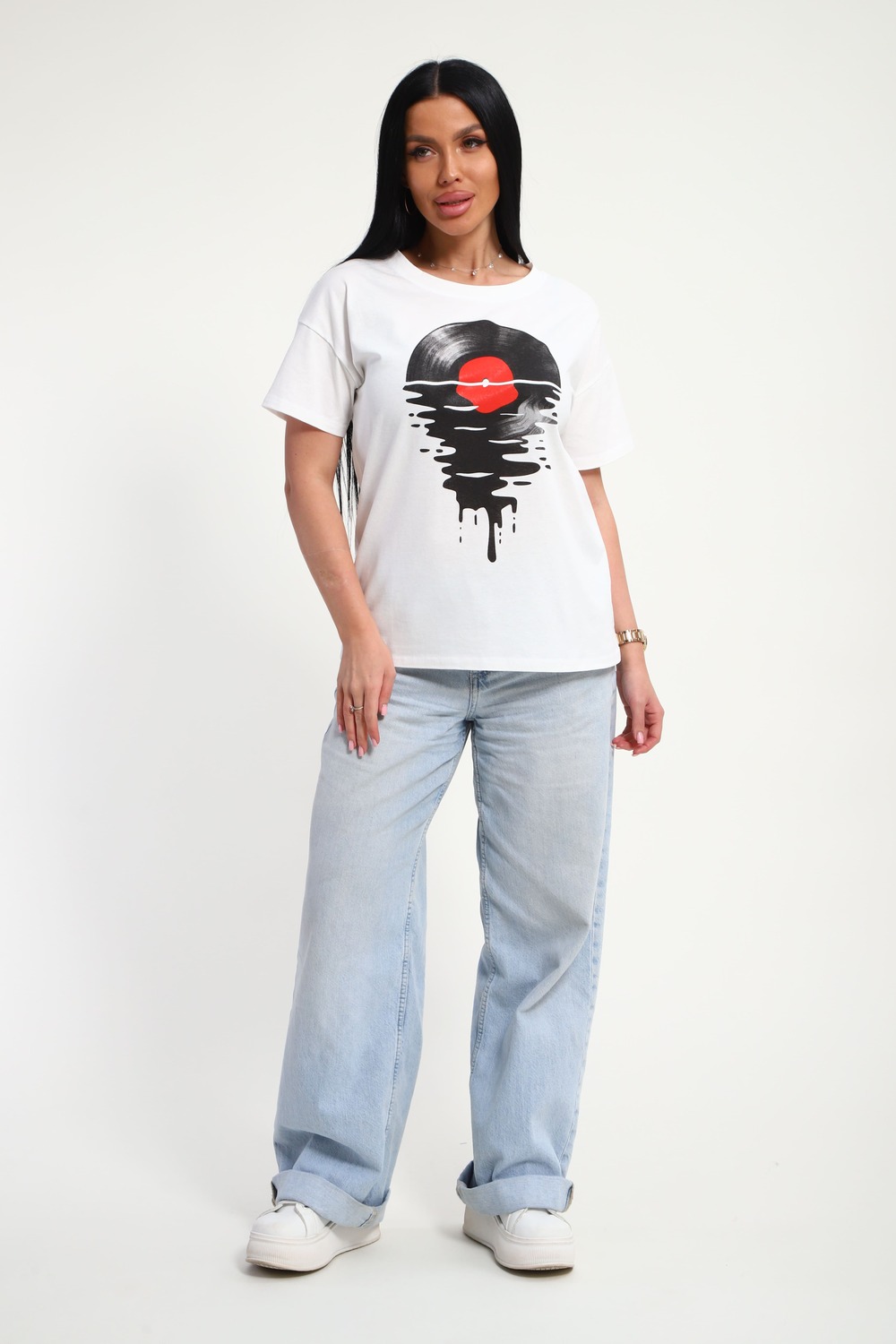 Футболка женская из гладкокрашеного трикотажа, хлопок 100%. Прямого силуэта, свободного облегания. горловина круглой формы. Рукав короткий. Низ изделия прямой. На полочке принт, шелкография.