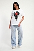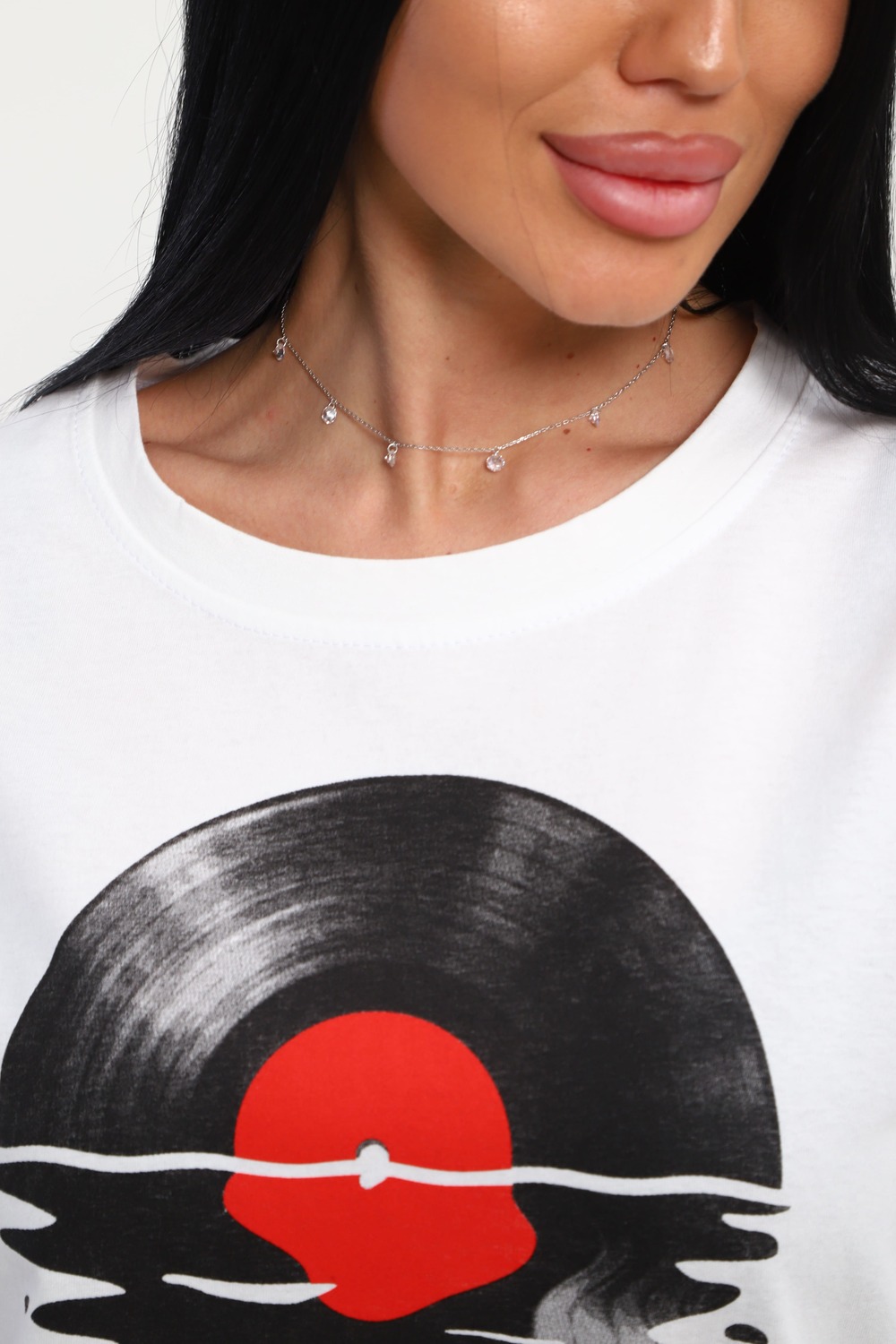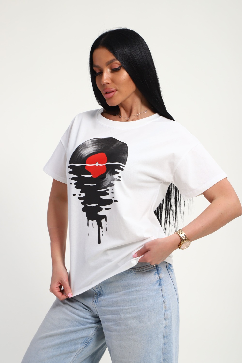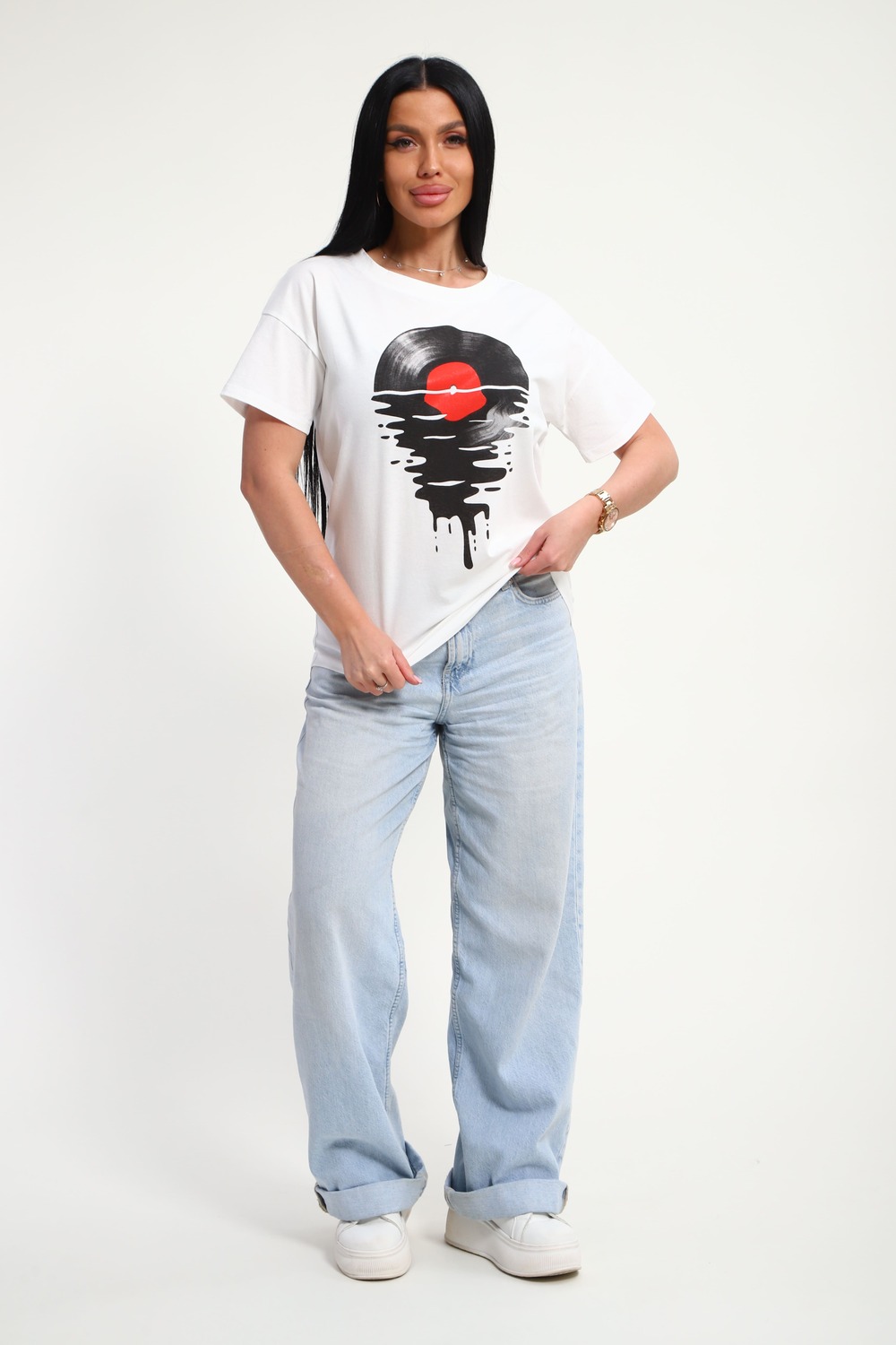 Футболка женская из гладкокрашеного трикотажа, хлопок 100%. Прямого силуэта, свободного облегания. горловина круглой формы. Рукав короткий. Низ изделия прямой. На полочке принт, шелкография.
