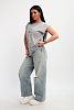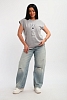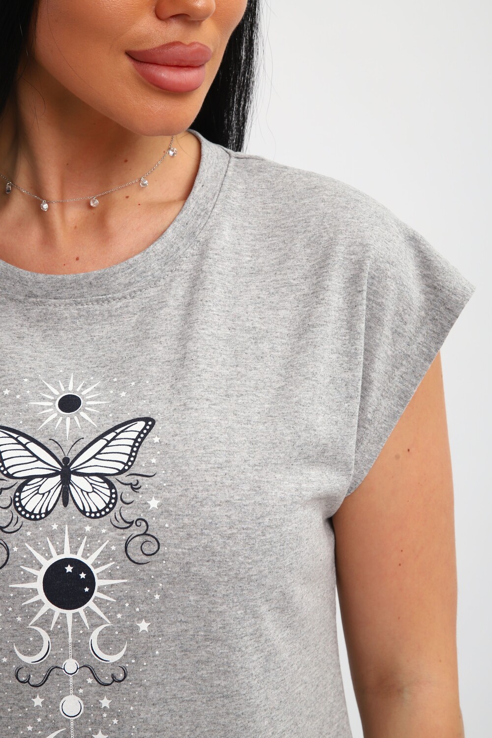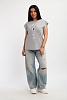 Футболка женская, изготовлена из меланжированного трикотажа. Горловина круглой формы, плечо спущено, без рукава. Низ изделия прямой. На полочке эффектный принт, выполненный методом шелкографии.