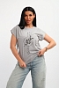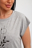 Футболка женская, изготовлена из меланжированного трикотажа. Горловина круглой формы, плечо спущено, без рукава. Низ изделия прямой. На полочке эффектный принт, выполненный методом шелкографии.