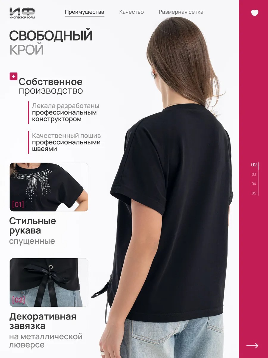 Модель выполнена из дышащего материала (97% хлопок, 3% лайкра) и комфортно сидит на фигуре, подчеркивая достоинства. Декоративные стразы и милый бант в виде принта добавляют образу праздничный шик. Футболка прекрасно подойдет для беременных и женщин с пышными формами, обеспечивая комфорт и стиль в любой ситуации.