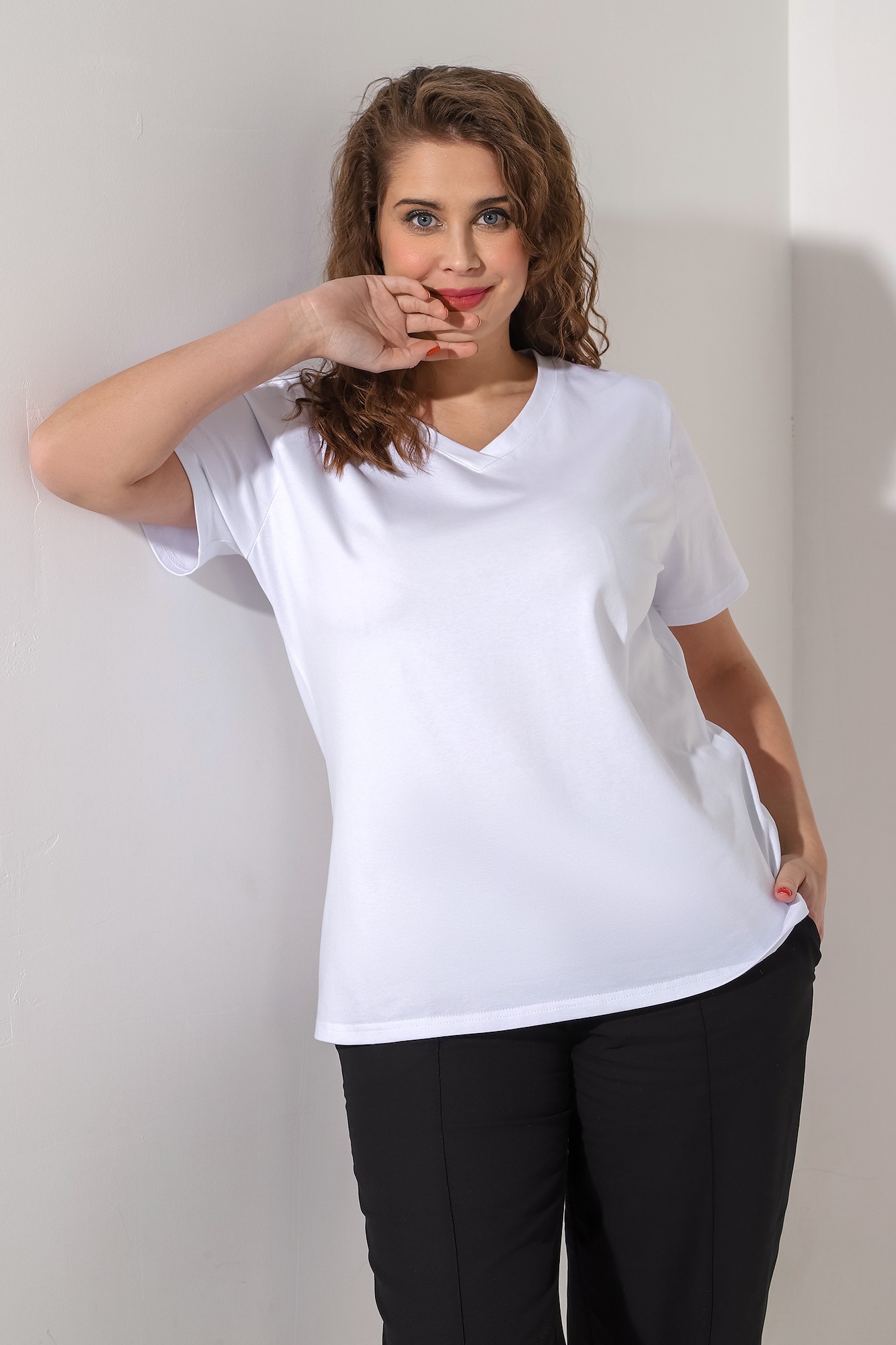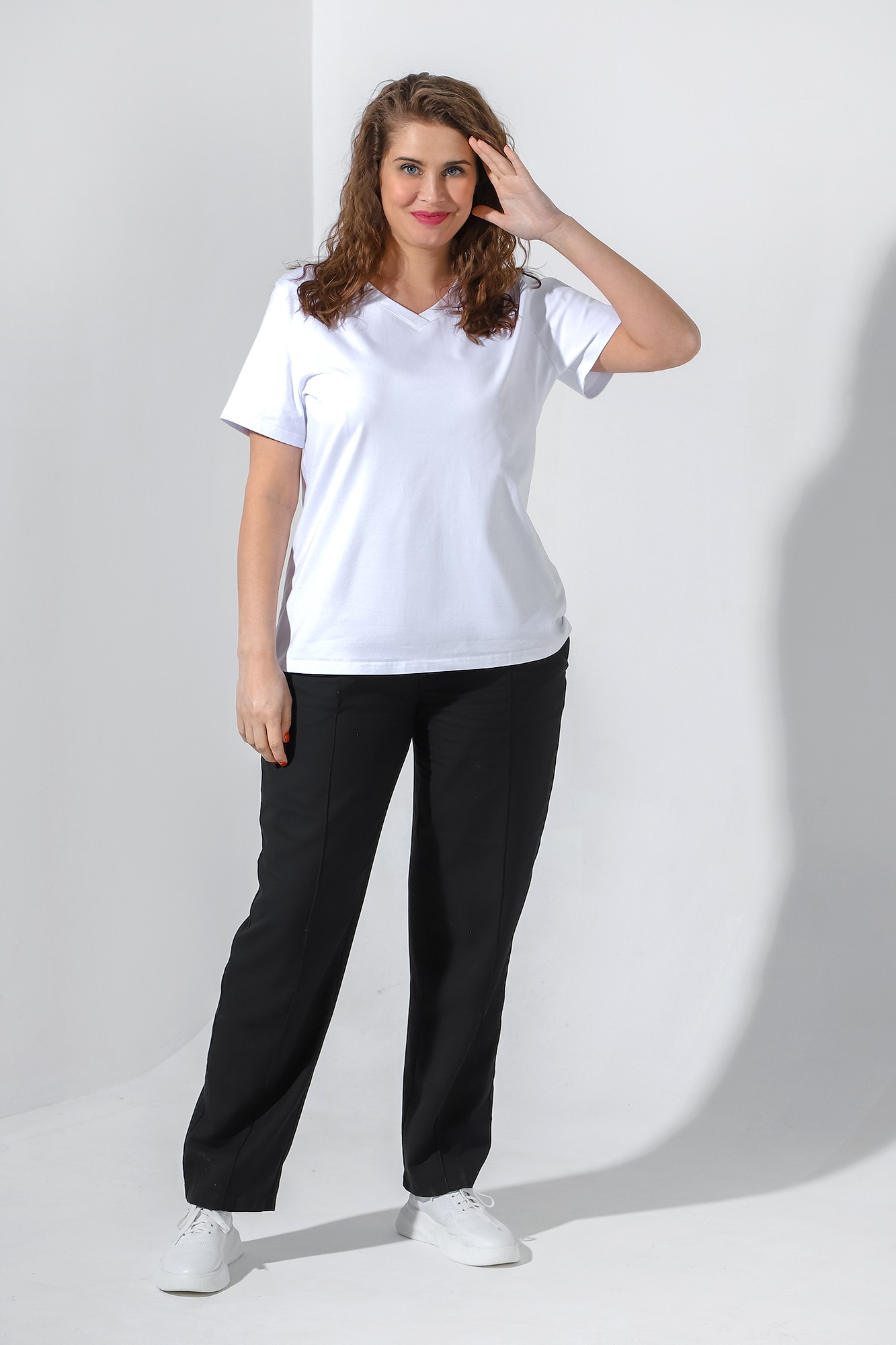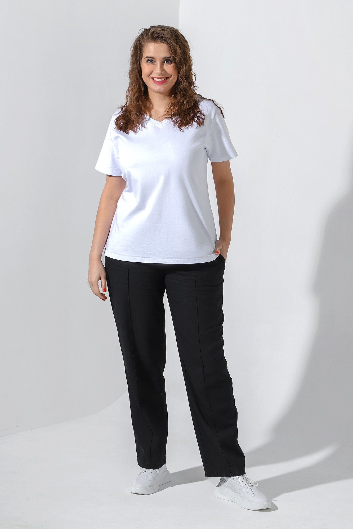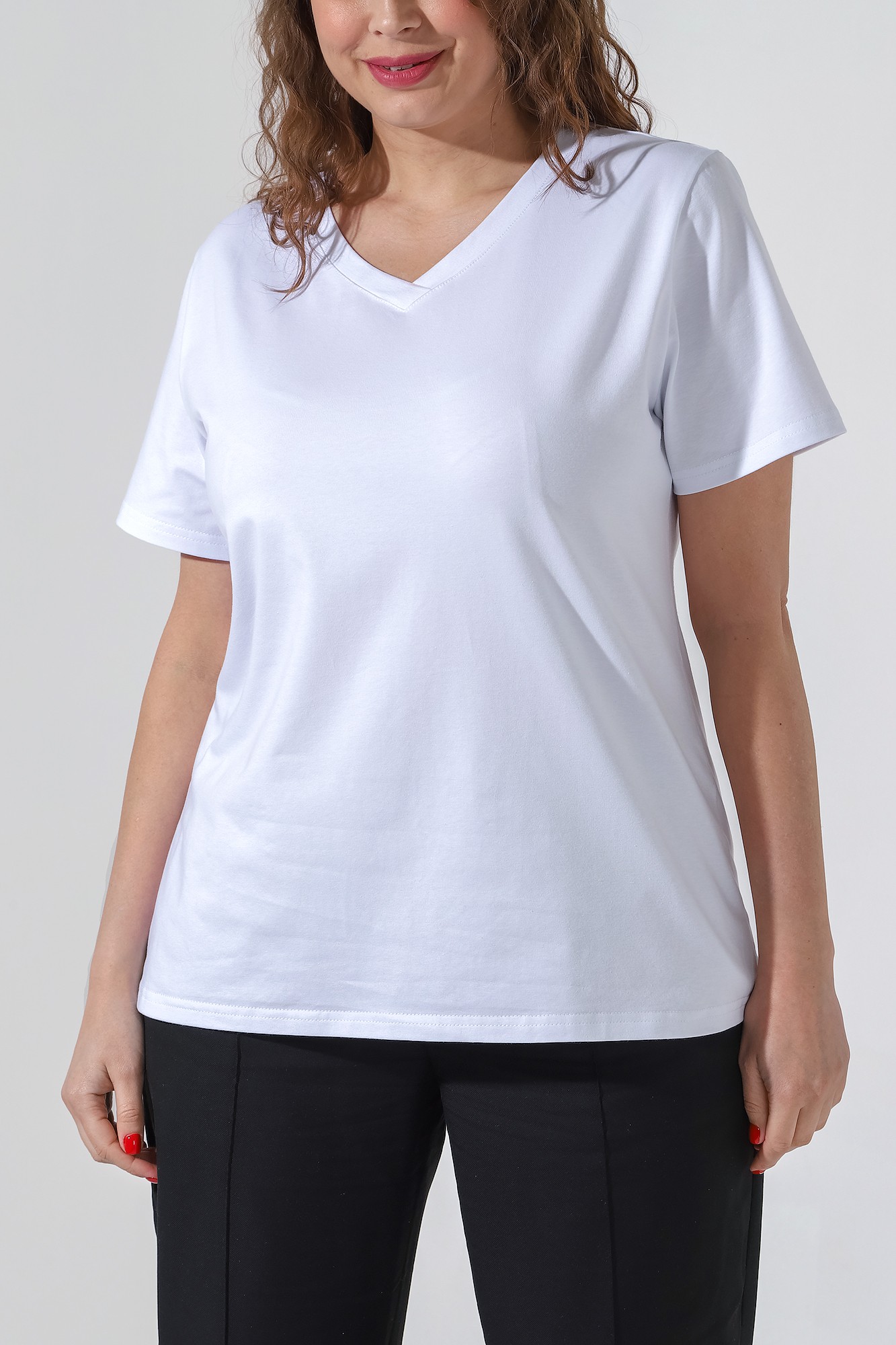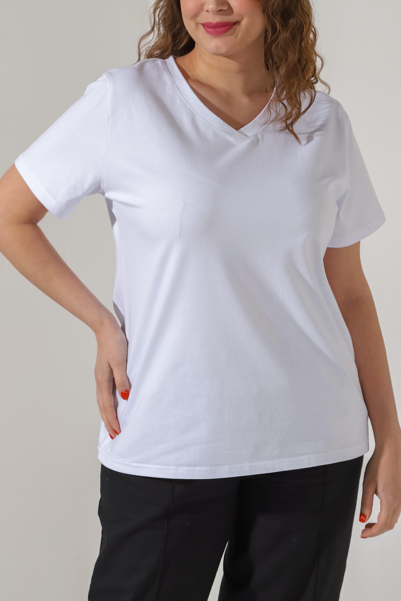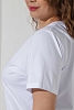 Футболка из гладкокрашеного трикотажного полотна «кулирка с лайкрой» классического покроя, с короткими втачными рукавами, горловиной V-образной формы, обработанной втачной планкой и принтом на полочке.