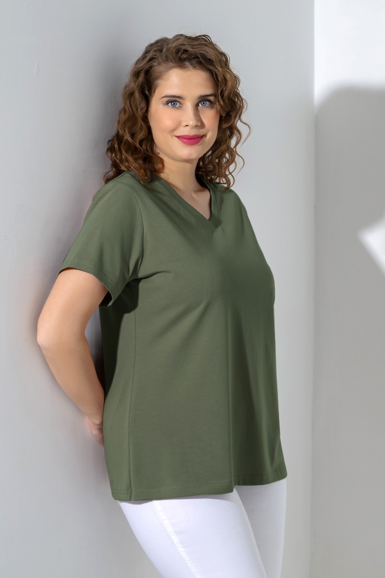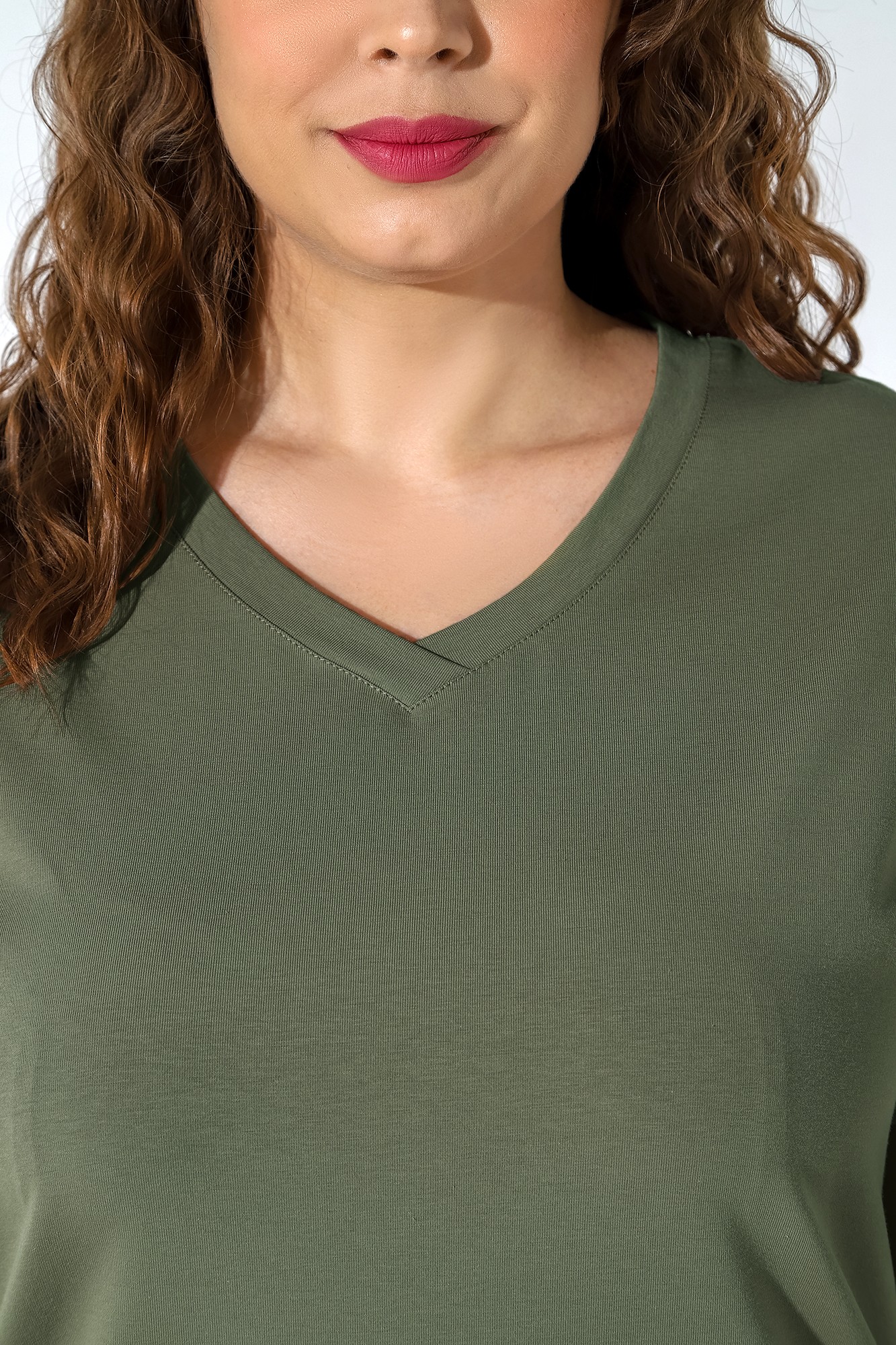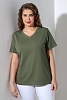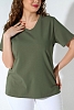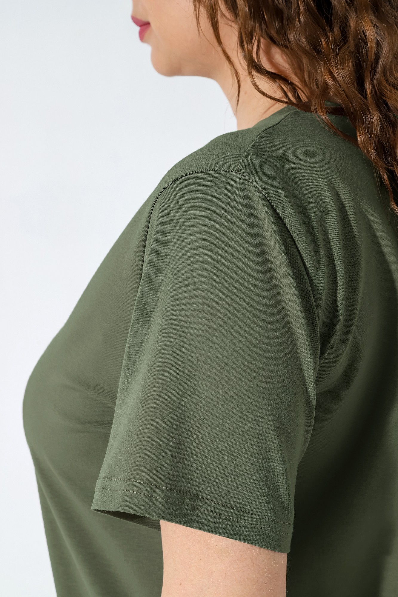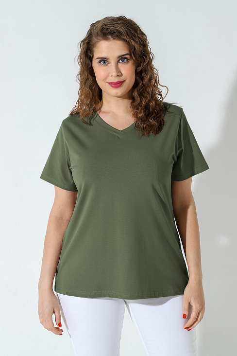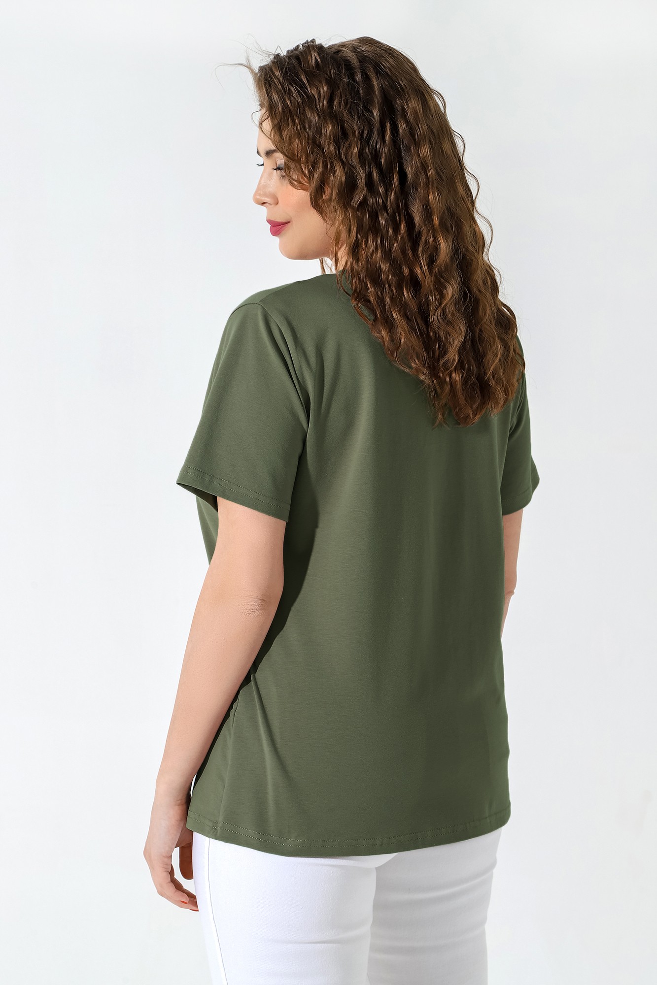 Футболка из гладкокрашеного трикотажного полотна «кулирка с лайкрой» классического покроя, с короткими втачными рукавами, горловиной V-образной формы, обработанной втачной планкой и принтом на полочке.