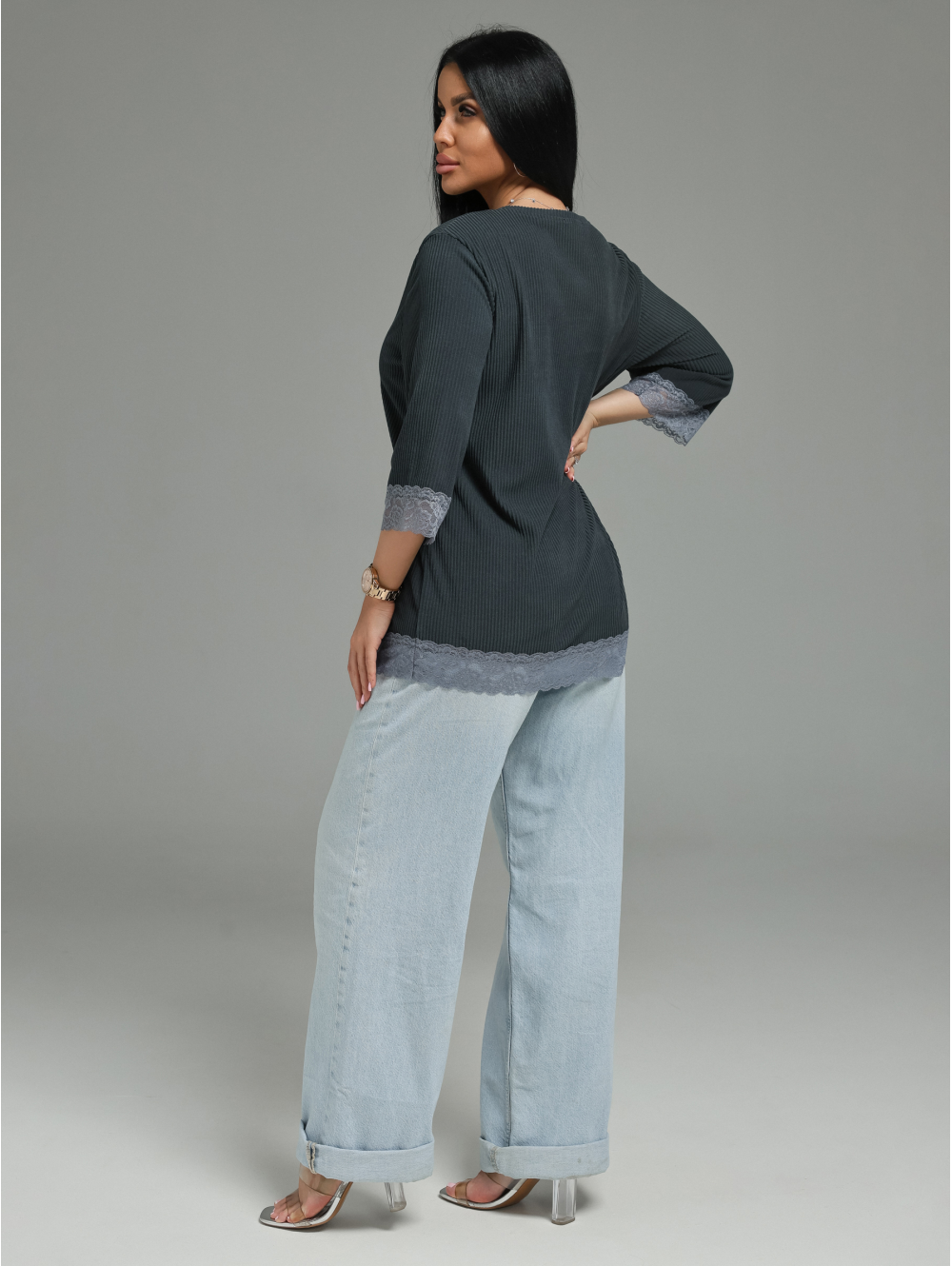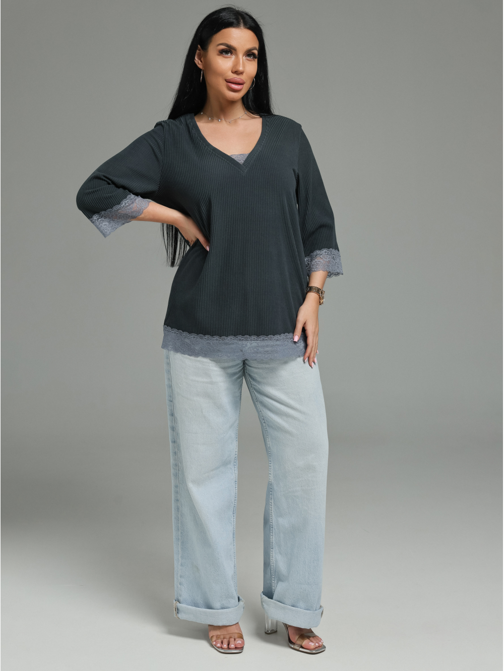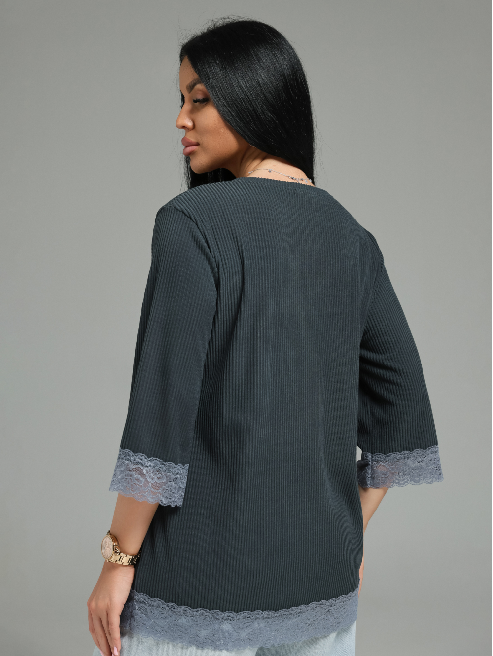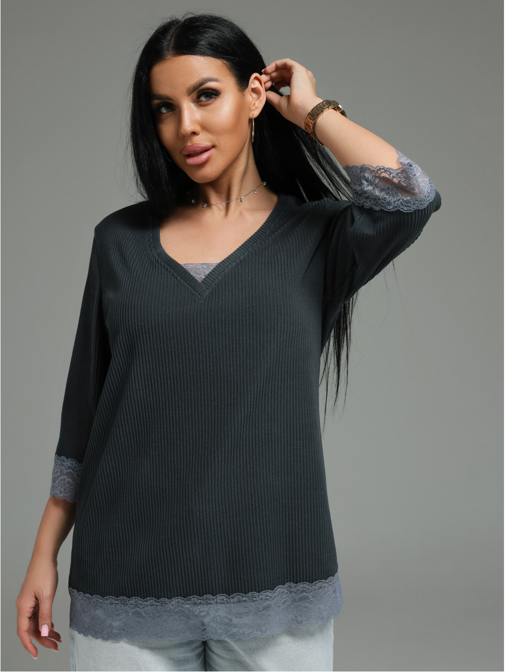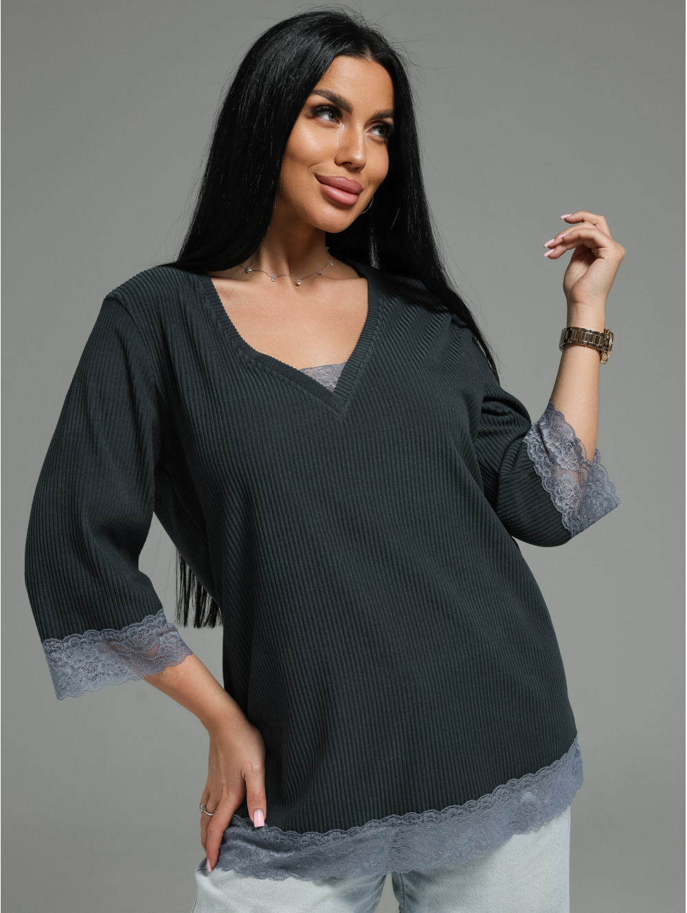 Женская футболка из кашемира «лапша» с кружевной отделкой.