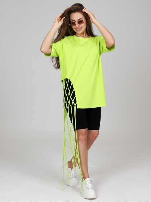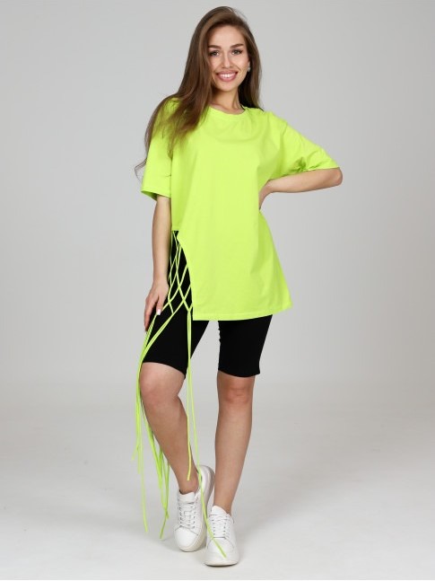 Яркая удлиненная футболка с декоративным плетением. Выполнена из 100% хлопка.