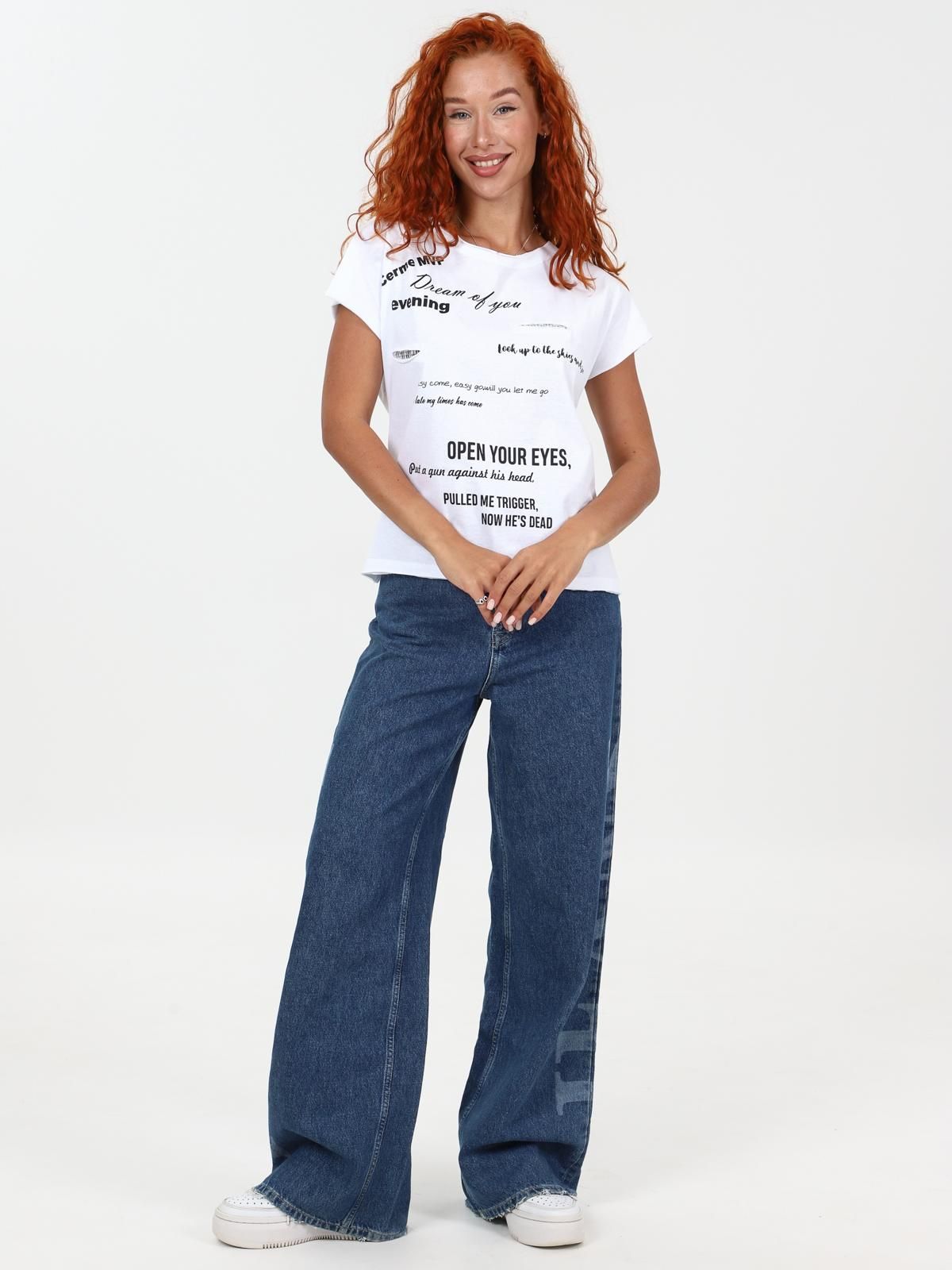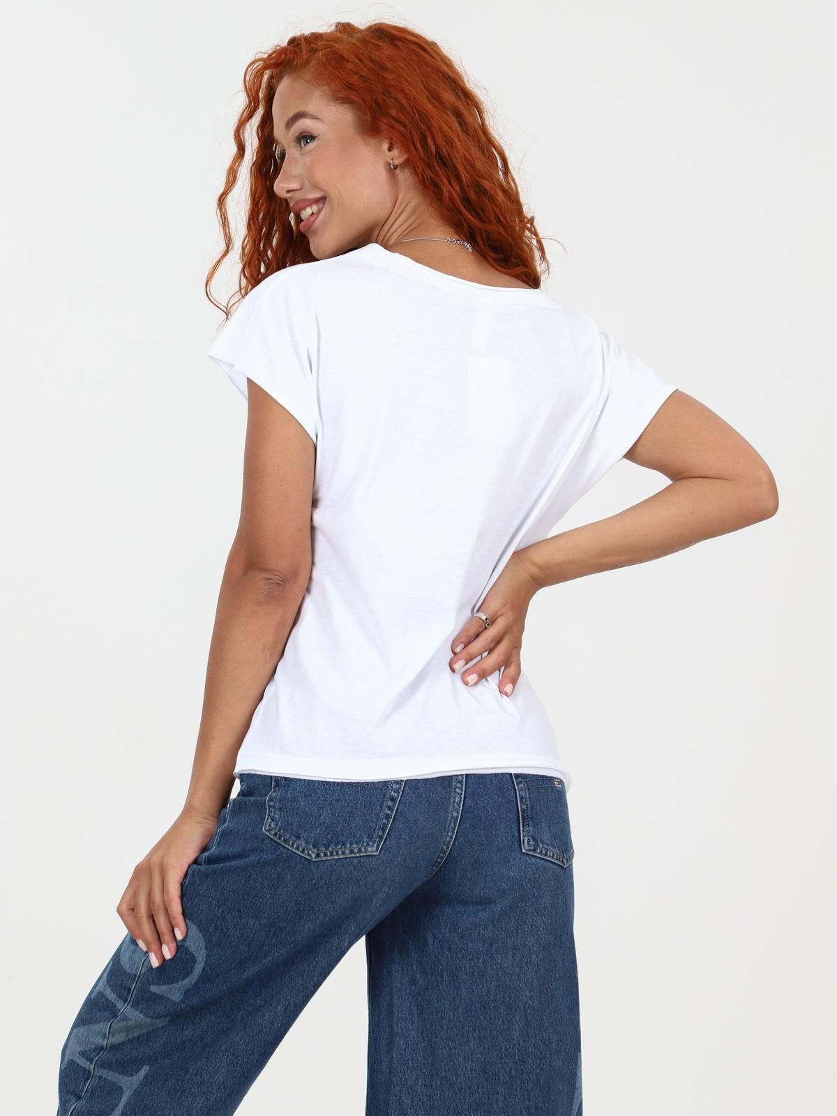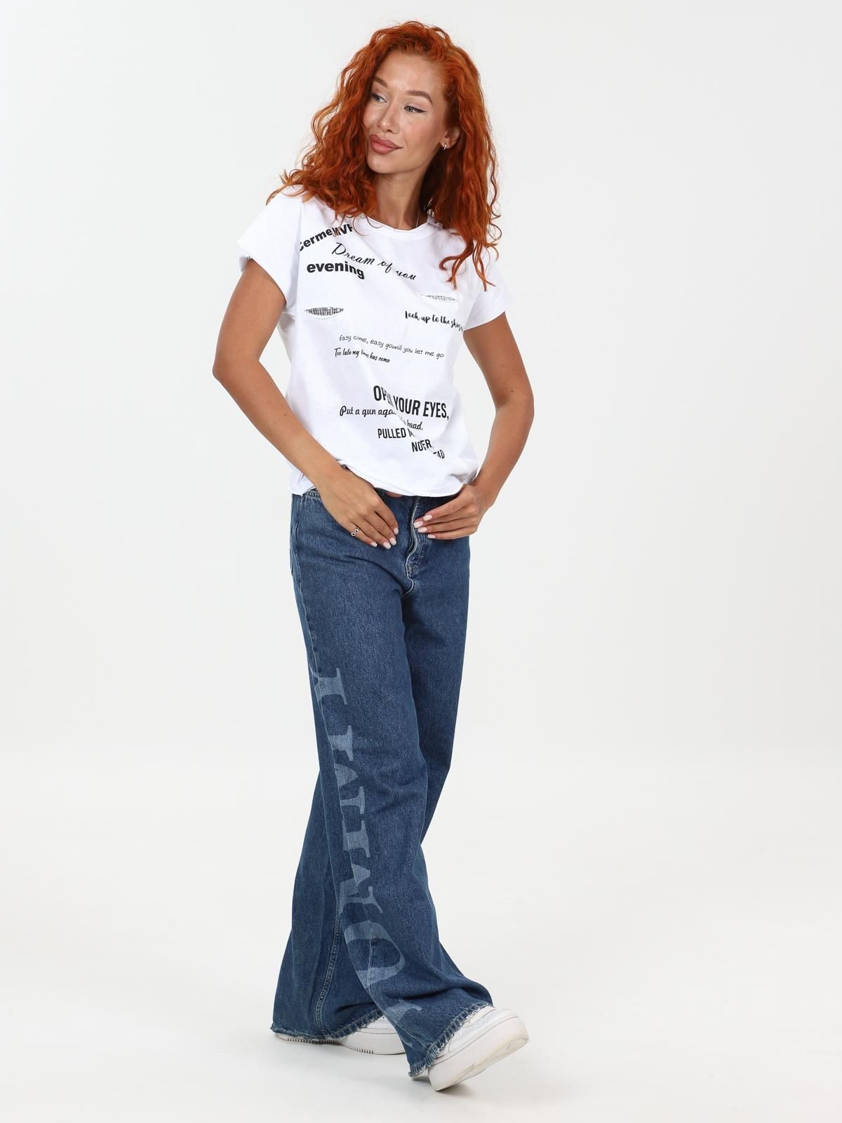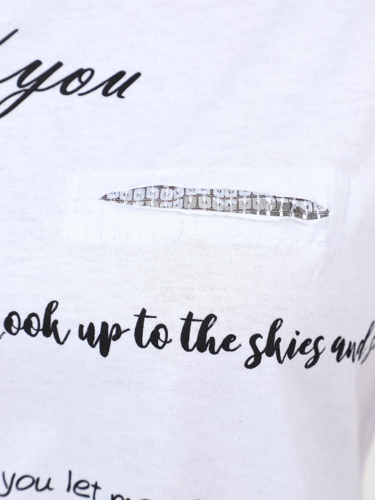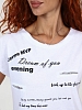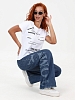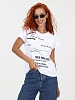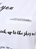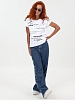 Женская футболка выполнена из трикотажного полотна "кулирка". Футболка свободная, без рукавов, со спущенным плечом, низ футболки, рукава и горловина с не заработанными краями, укрепленными обтачками, на передней части футболки принт с декоративными элементами-тесьма с пайетками, закрепленная в разрезах.