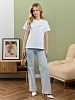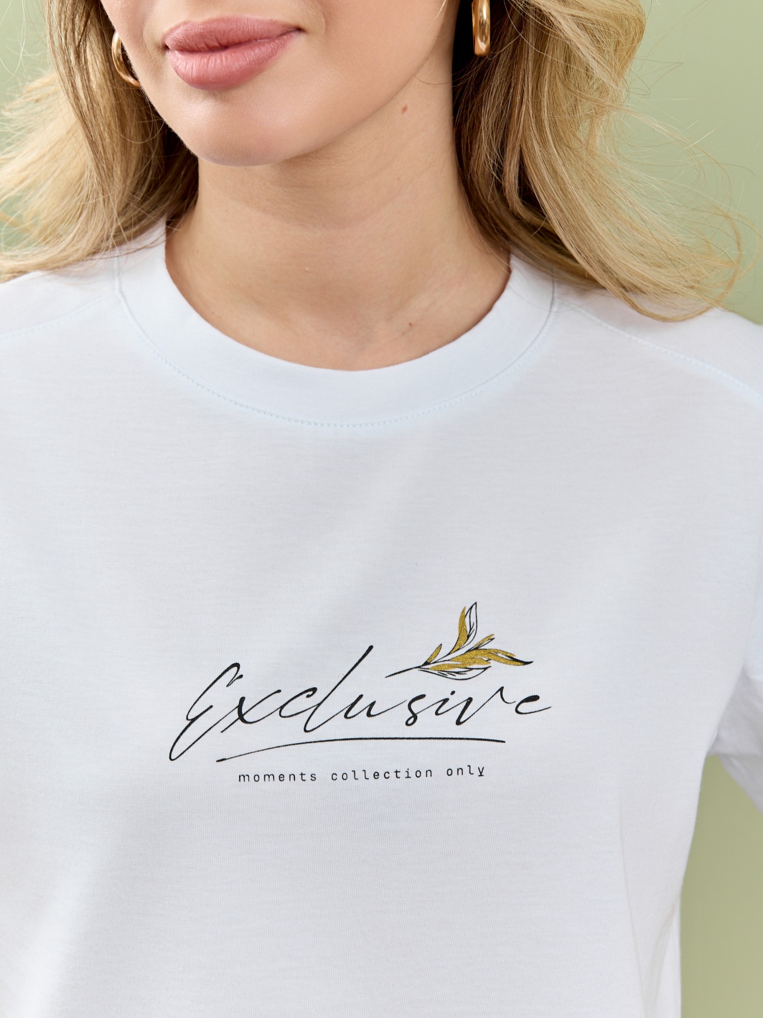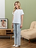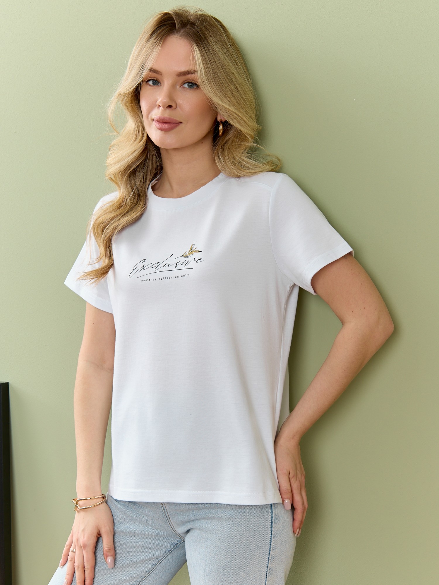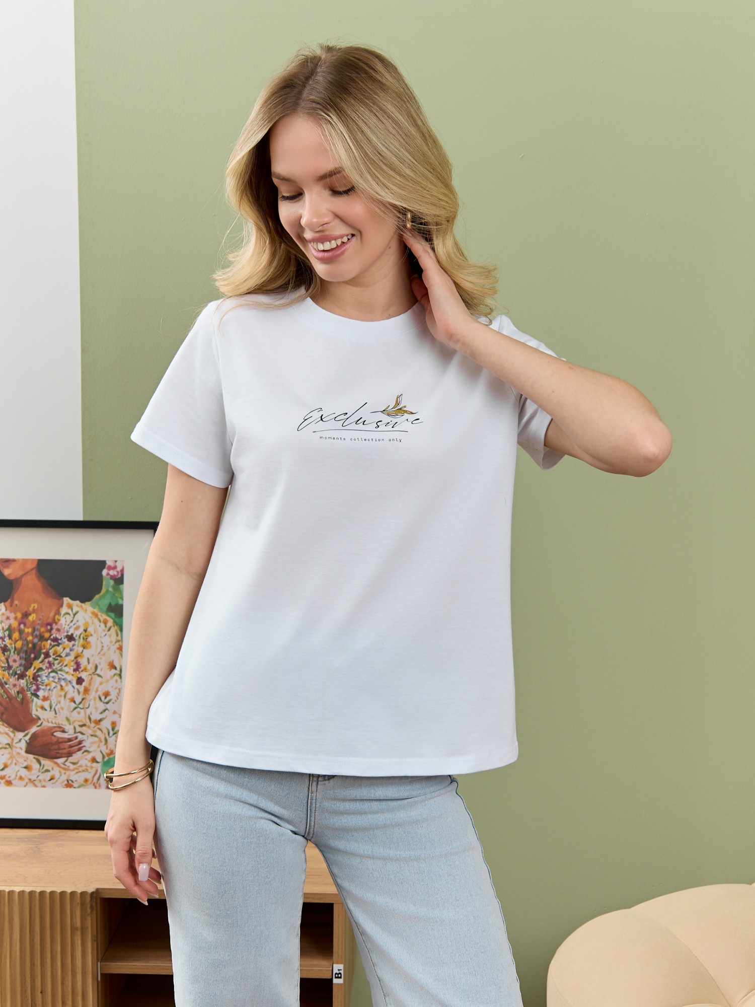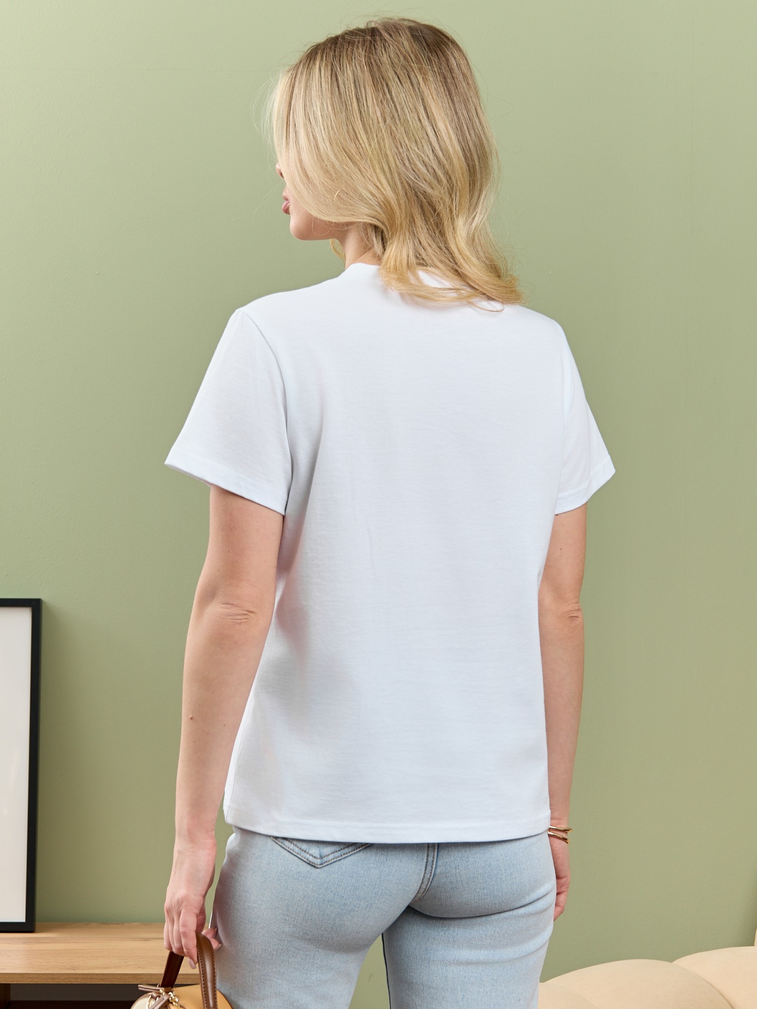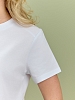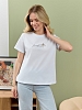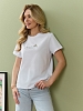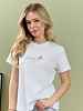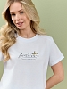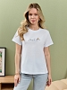 Футболка женская из гладкокрашеного полотна «кулирка», классического покроя, с короткими втачными рукавами, горловиной овальной формы, принтом на полочке, выполненным в технике «шелкографии». Плечевые швы изделия переходят на деталь переда, имитируя притачные кокетки, горловина обработана втачной планкой из основного материала.