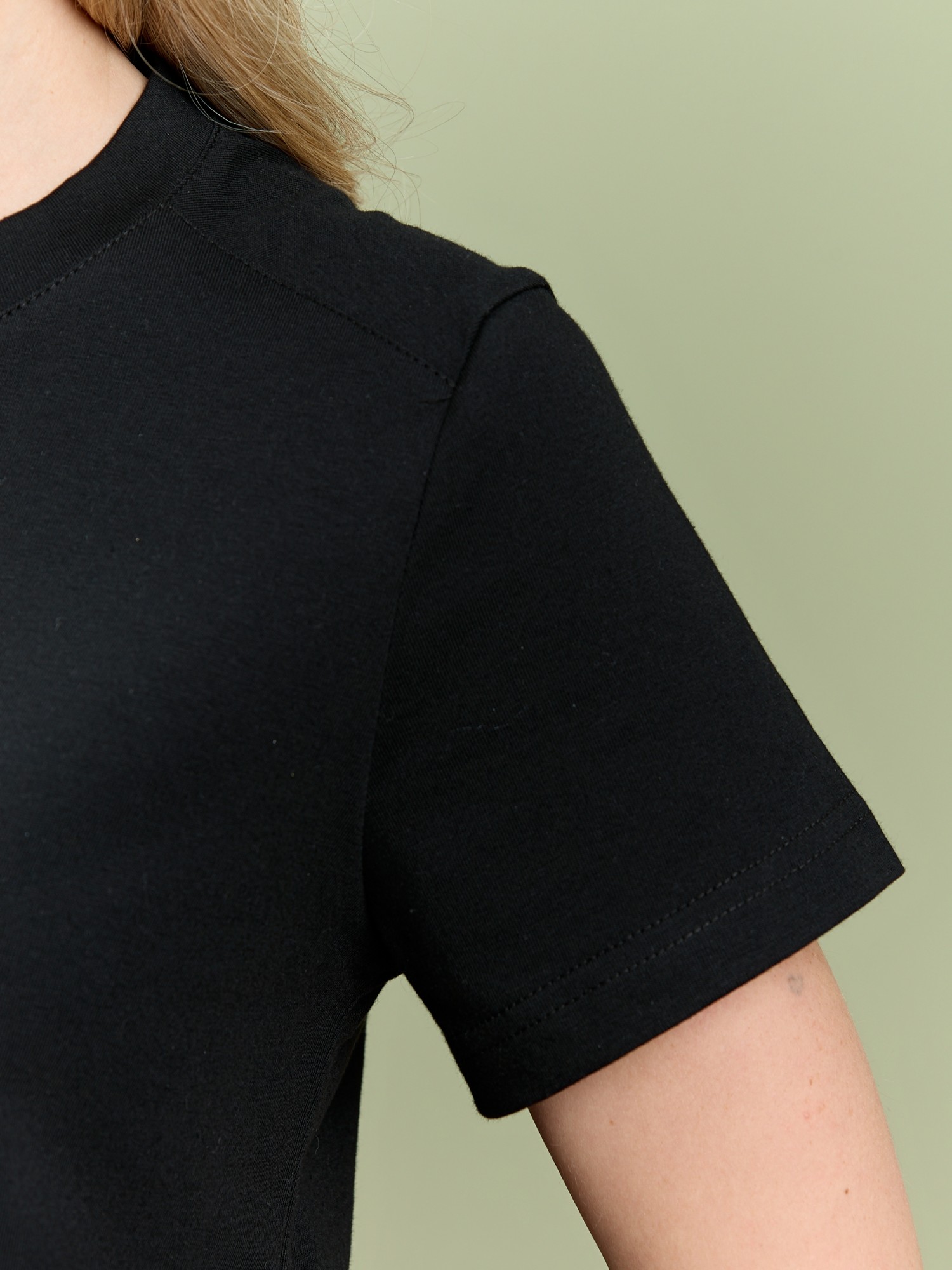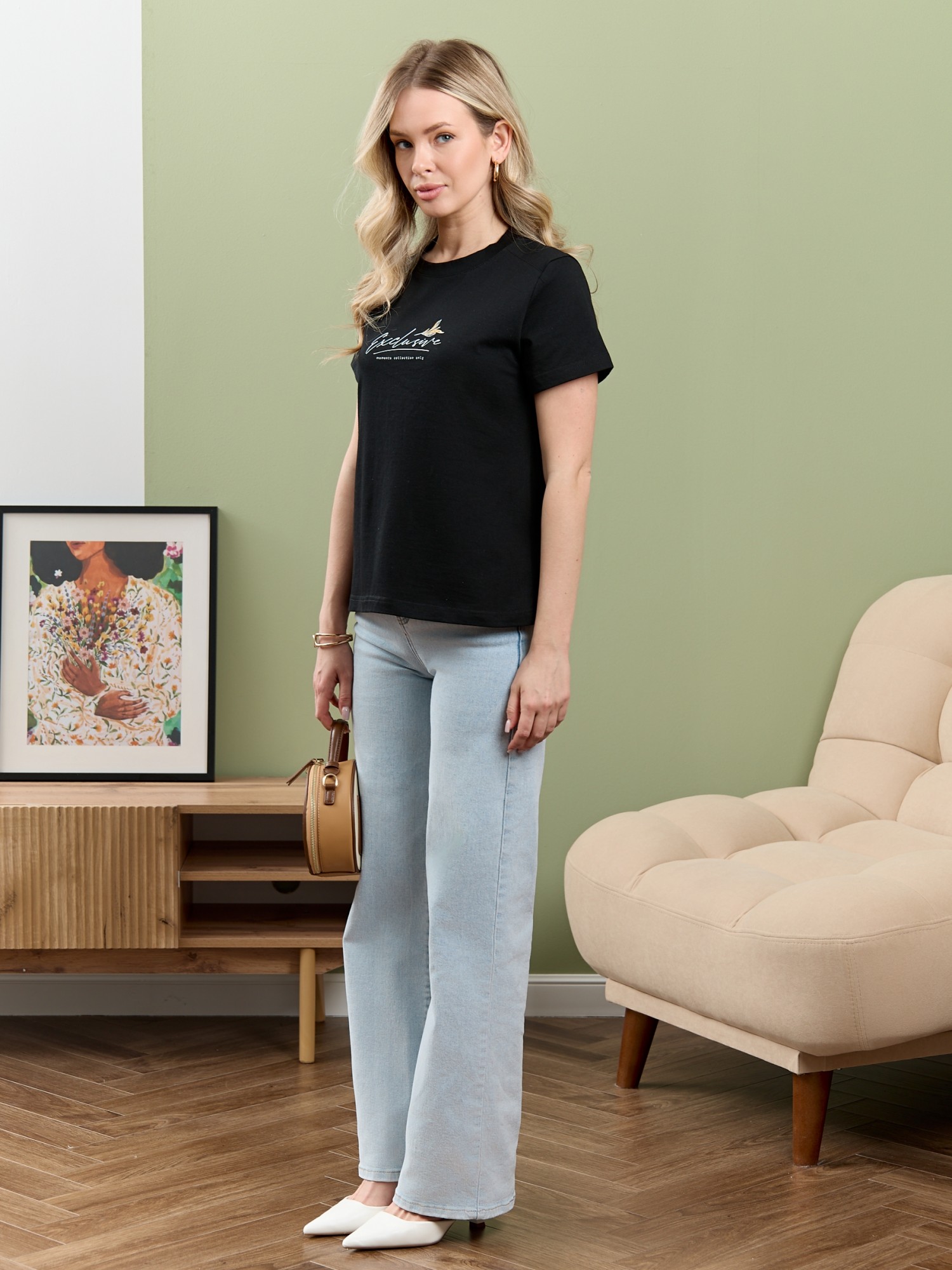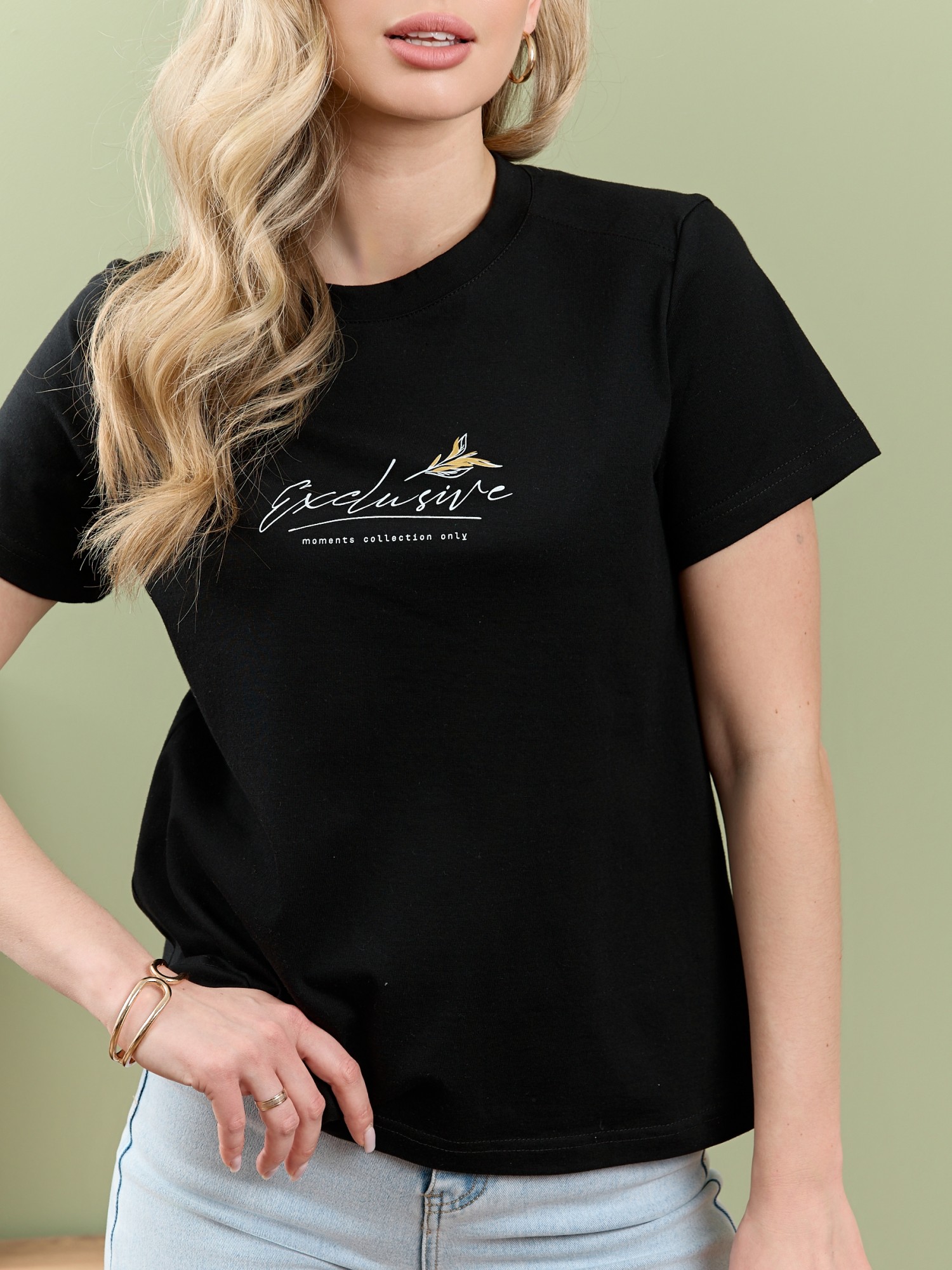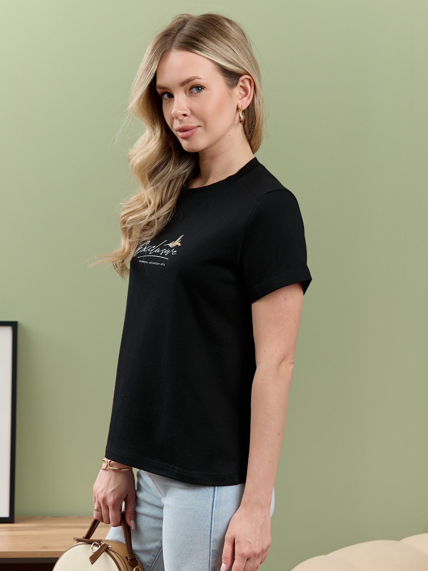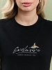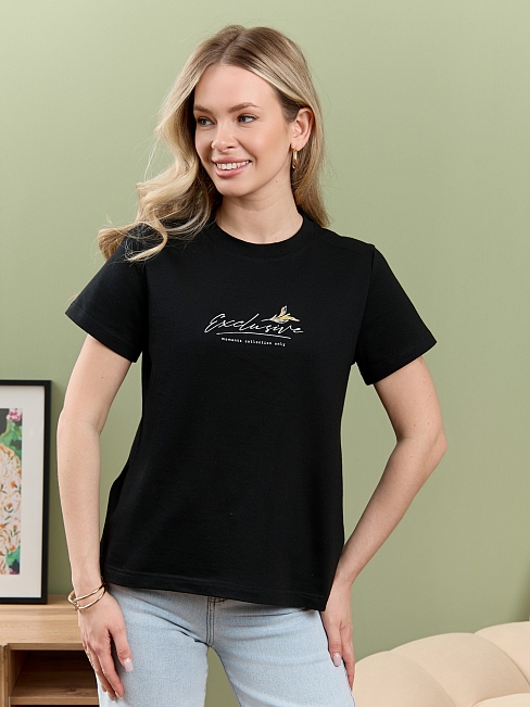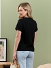 Футболка женская из гладкокрашеного полотна «кулирка», классического покроя, с короткими втачными рукавами, горловиной овальной формы, принтом на полочке, выполненным в технике «шелкографии». Плечевые швы изделия переходят на деталь переда, имитируя притачные кокетки, горловина обработана втачной планкой из основного материала.