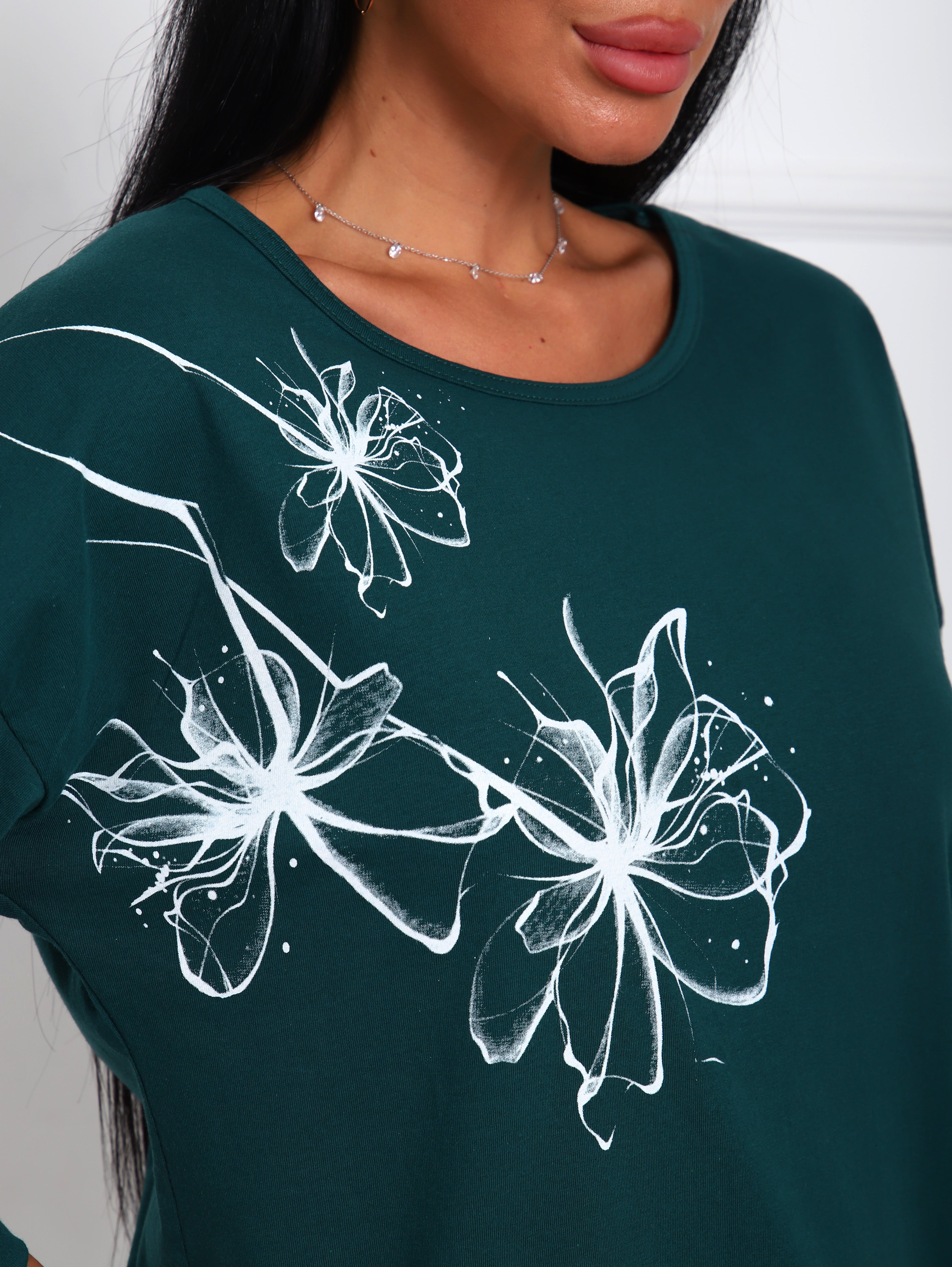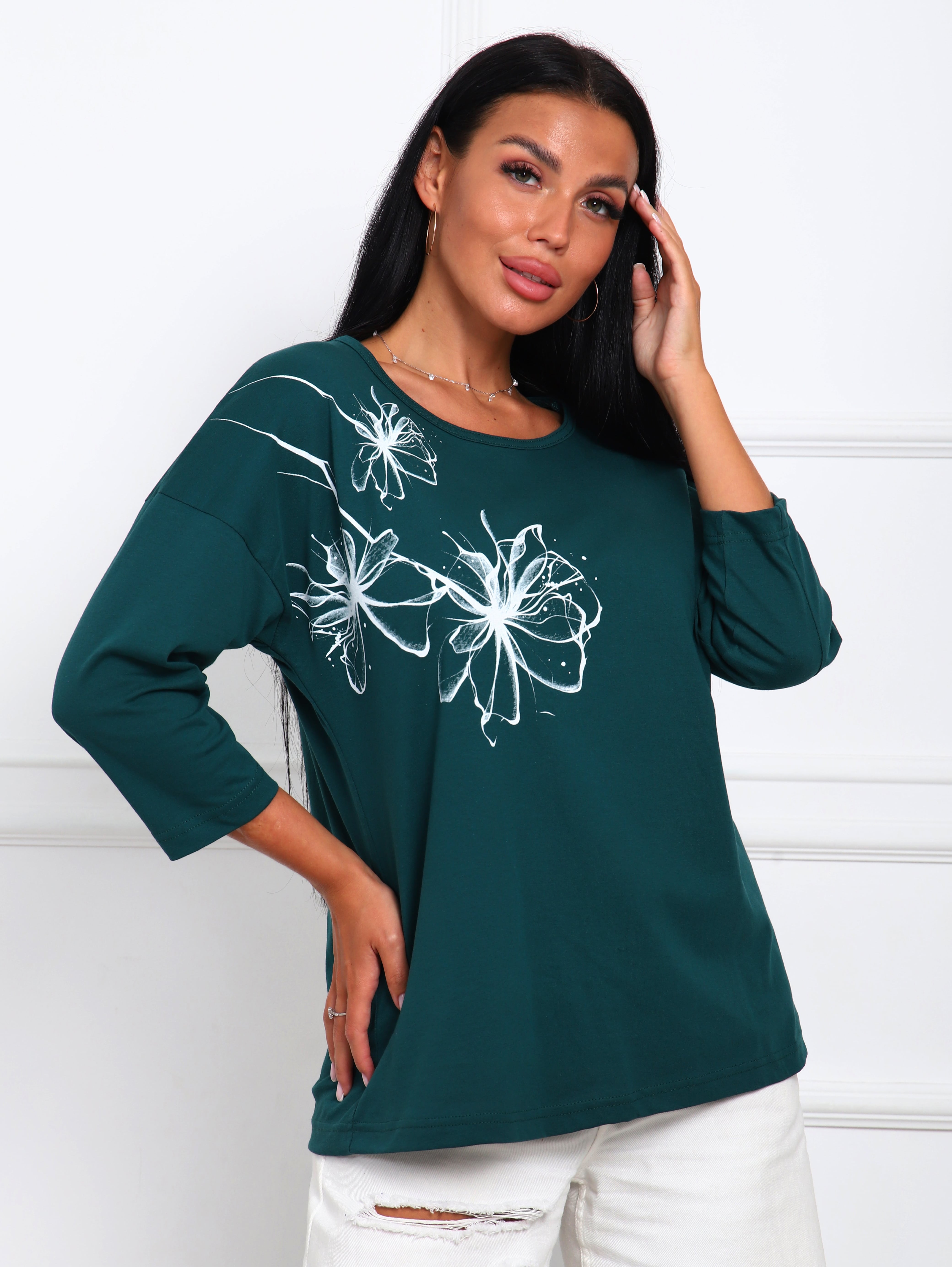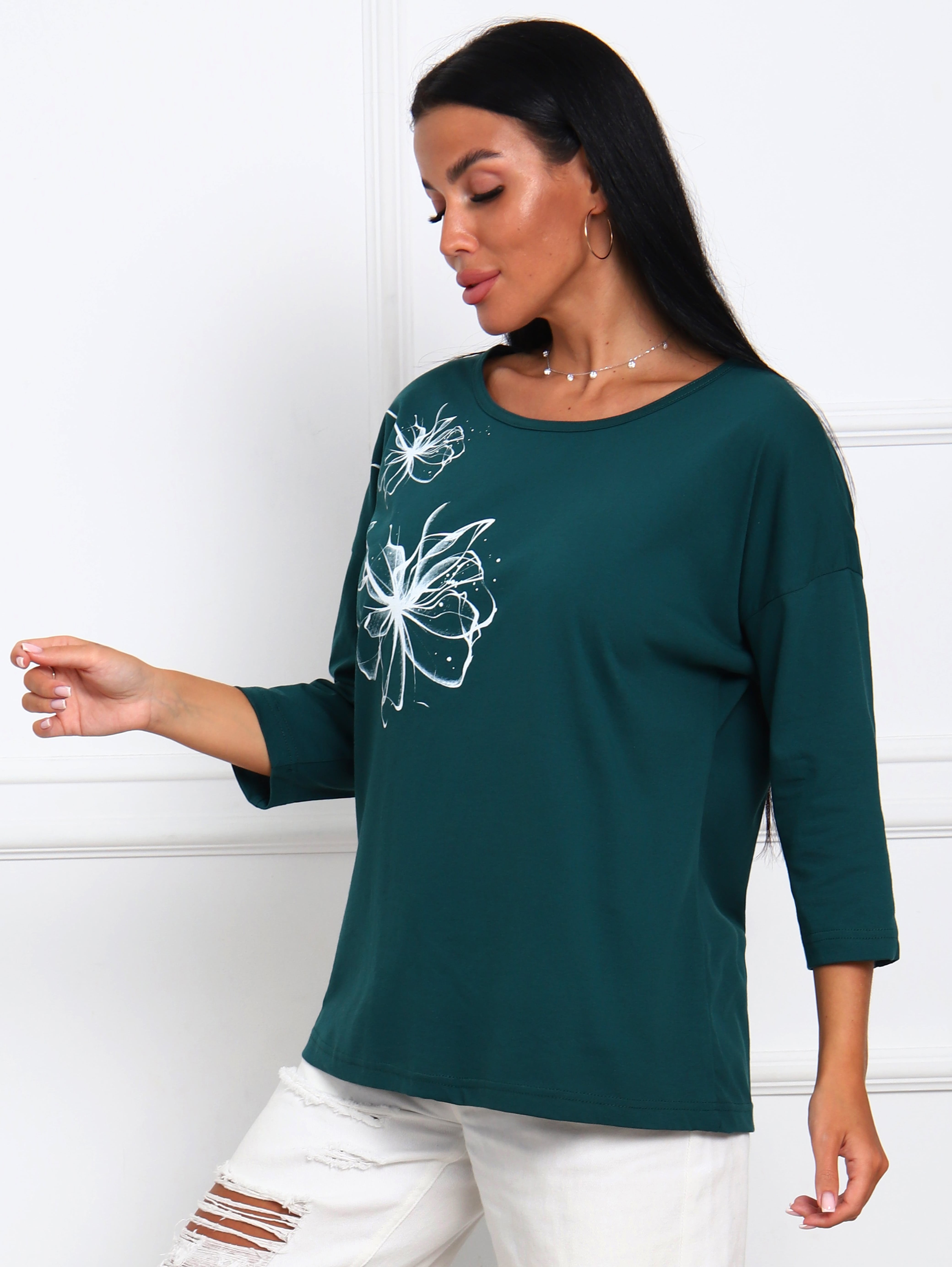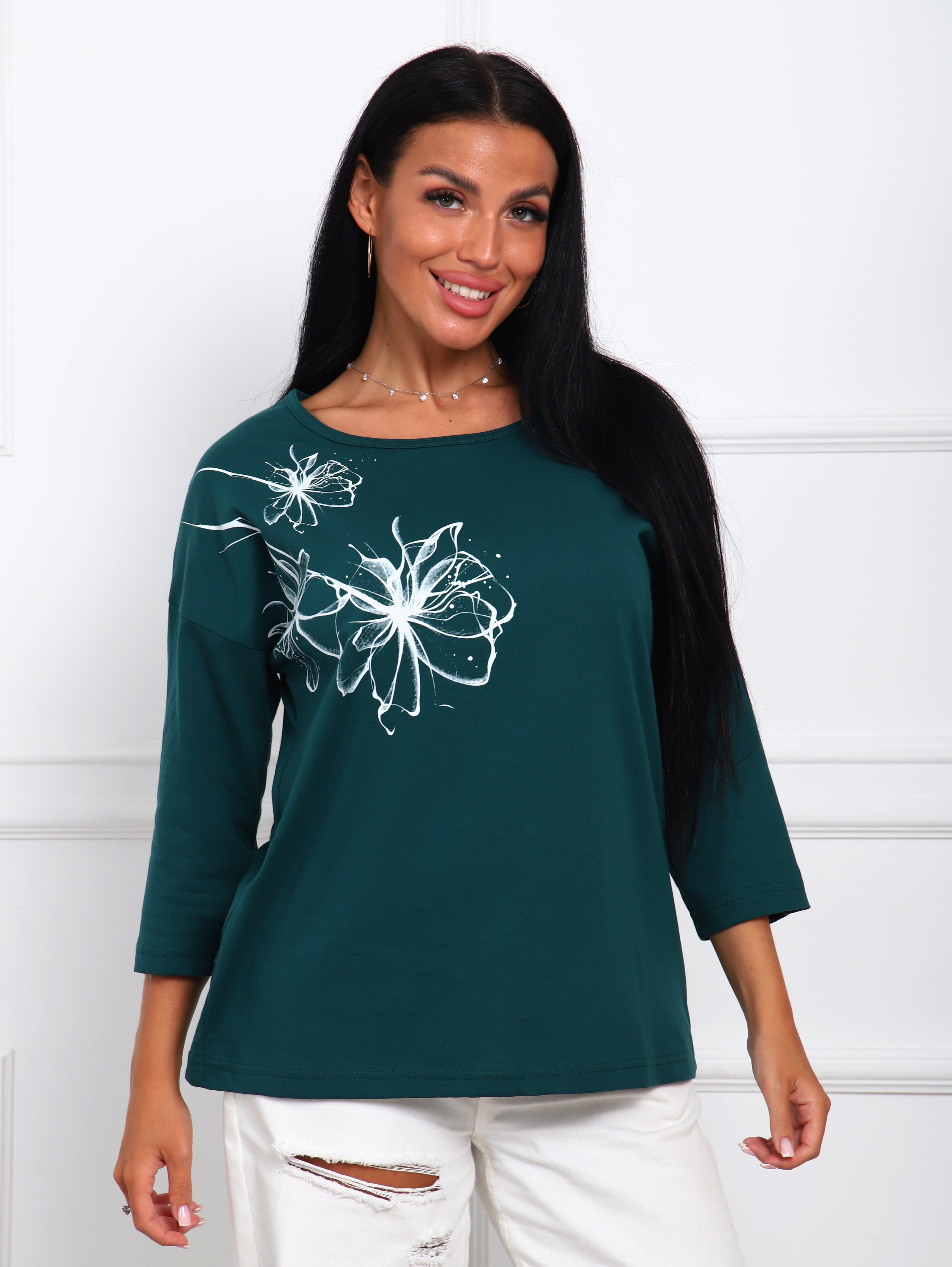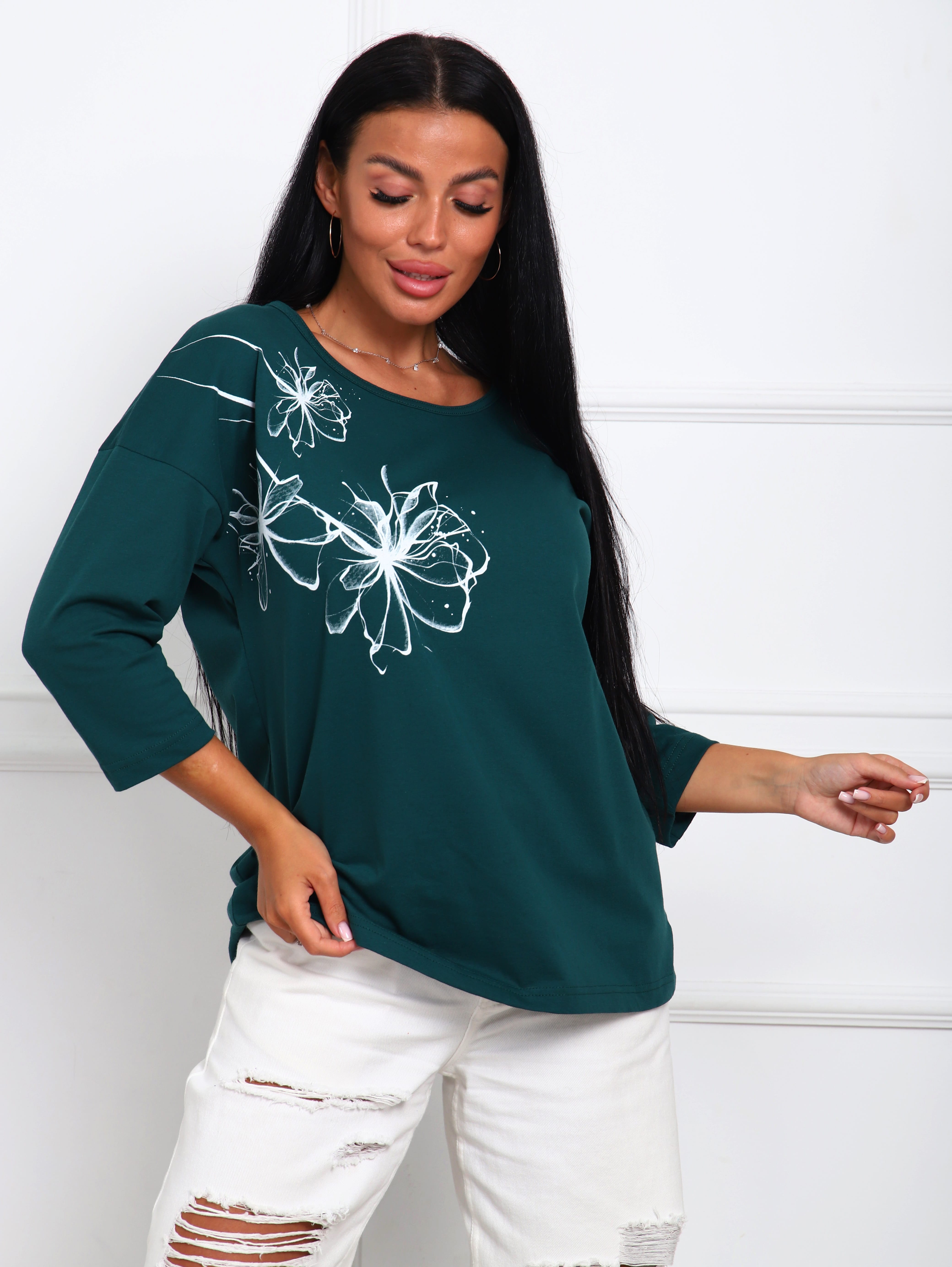 Футболка женская с цветочным принтом из натурального трикотажа, хлопок 100%. Отличный вариант одежды, который позволяет скрыть все недостатки фигуры и подчеркнуть достоинства. Мягкие линии делают эту модель очень женственной. Горловина круглой формы. Полуприлегающий силуэт, рукав три четверти. Принт нанесен непосредственно на ткань футболки - не наклейка. Данный принт выделит Вас среди других девушек.
