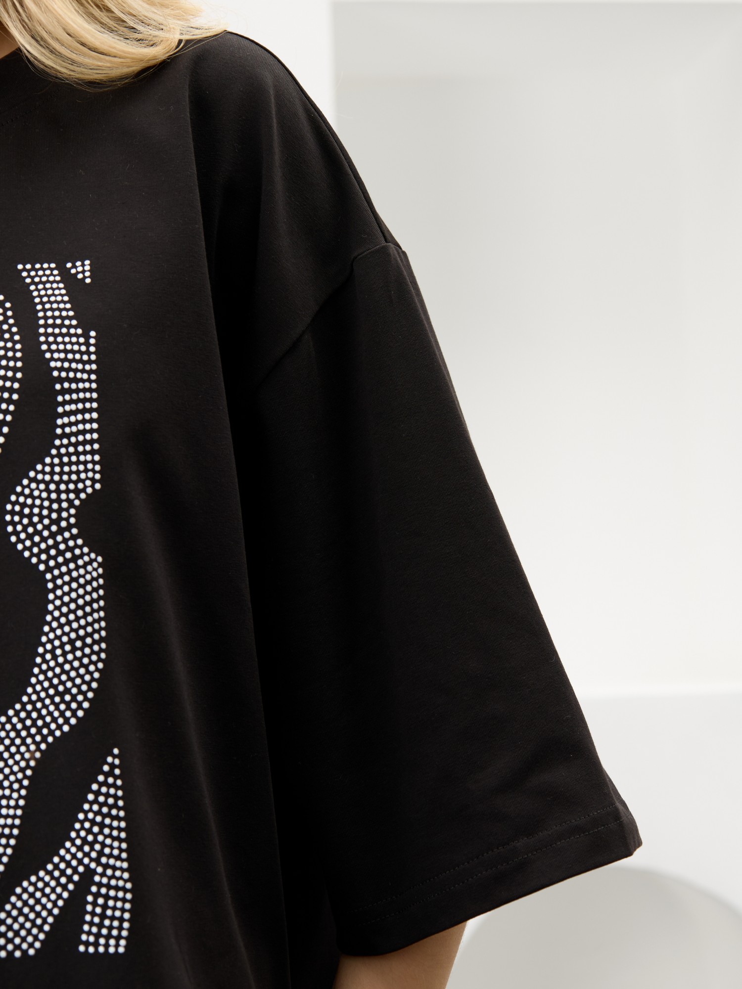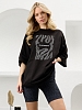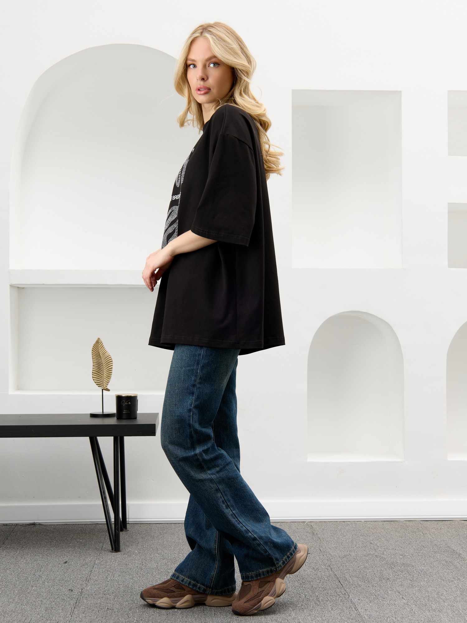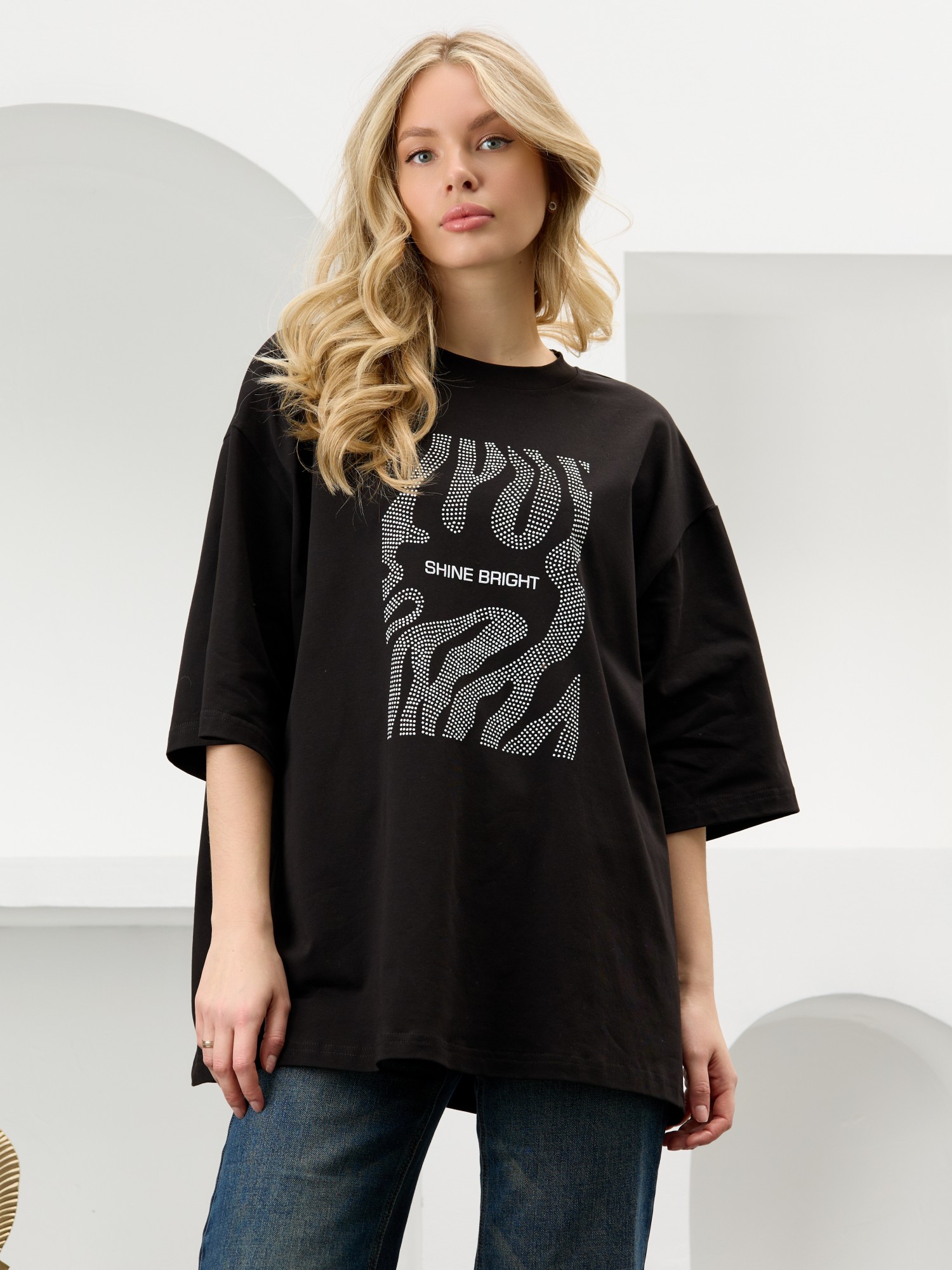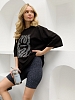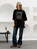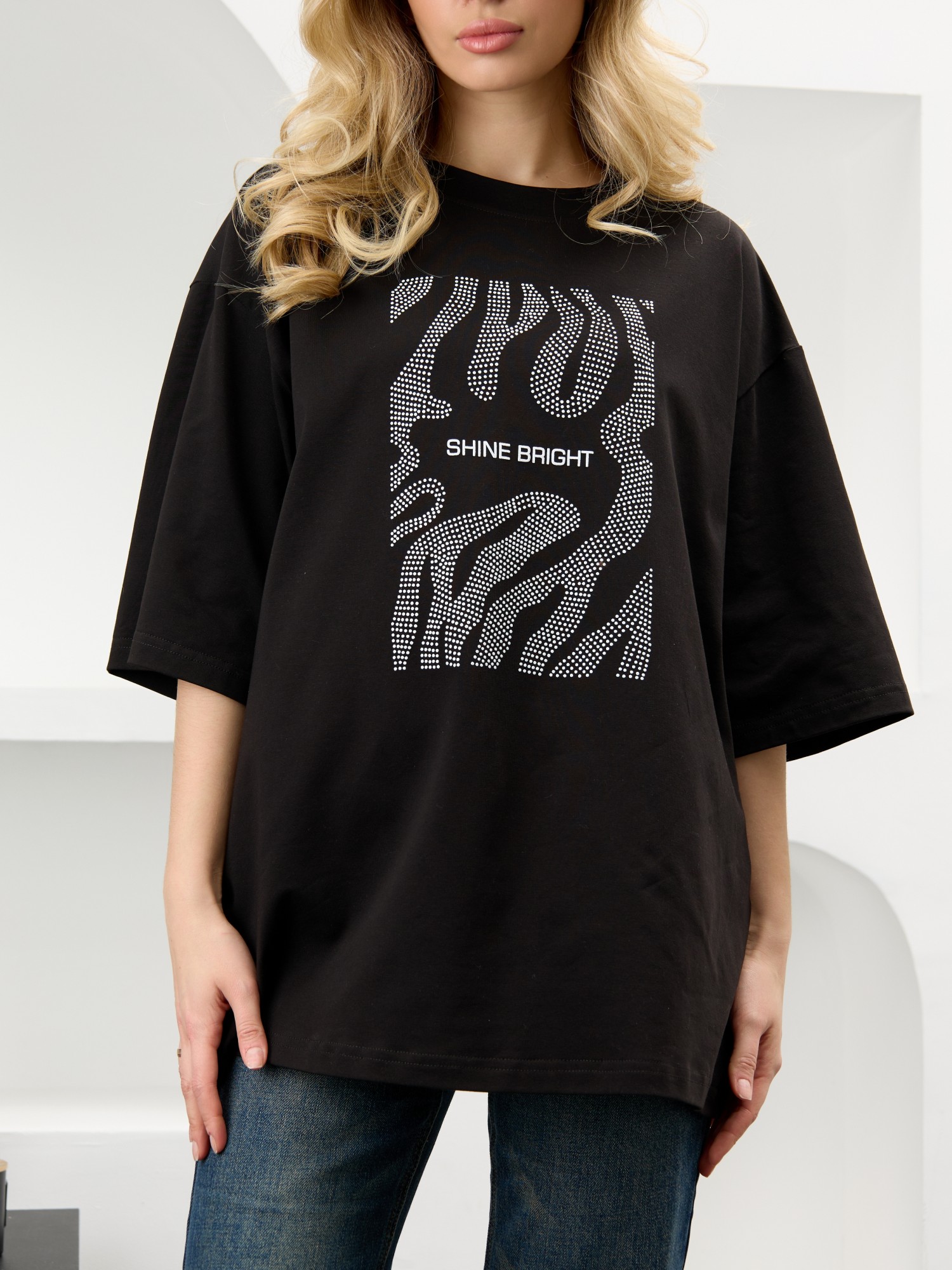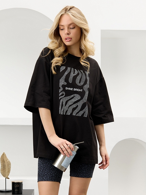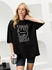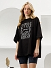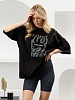 Футболка молодежная из гладкокрашеного трикотажного полотна «кулирка» с лайкрой, свободная покроя «оверсайз», с горловиной овальной формы, обработанной притачной планкой, рукавами длиной до локтя. На полочке выполнена печать в технике «шелкографии».