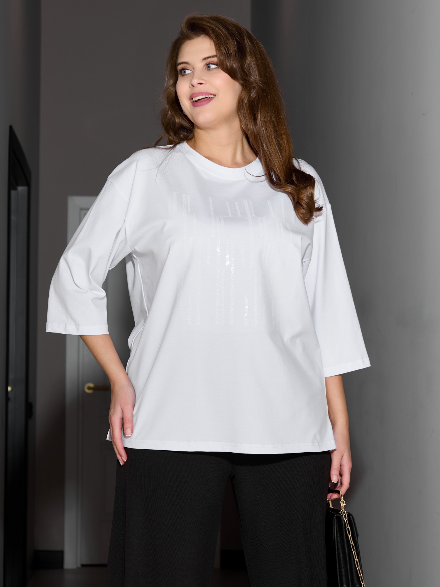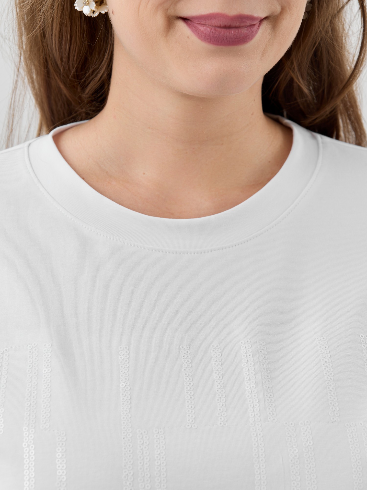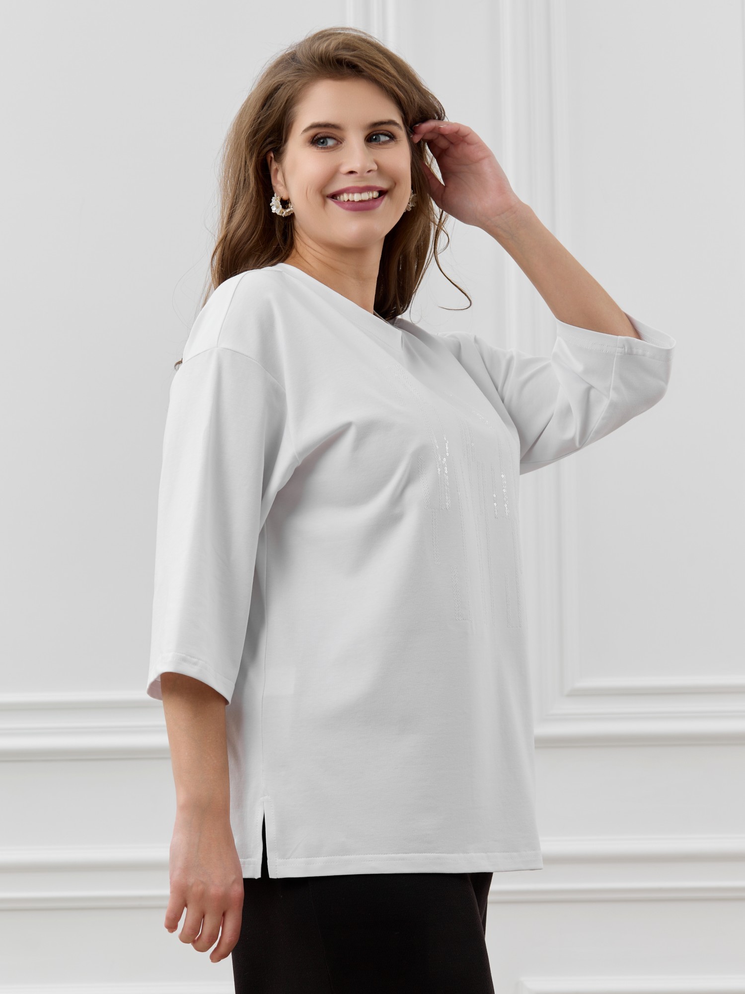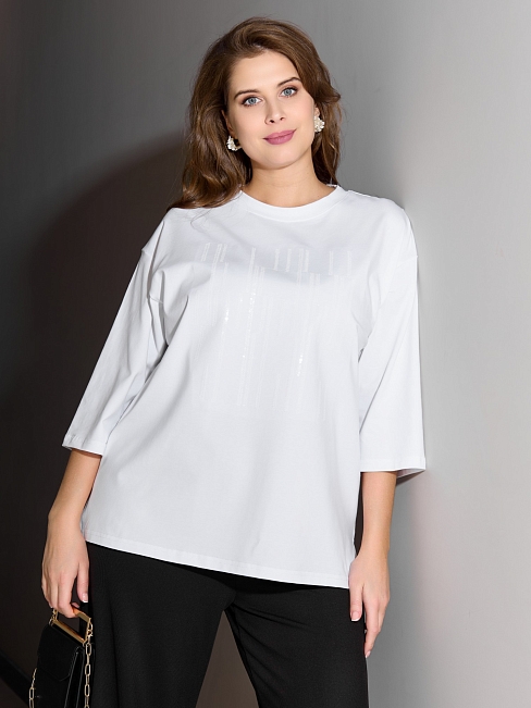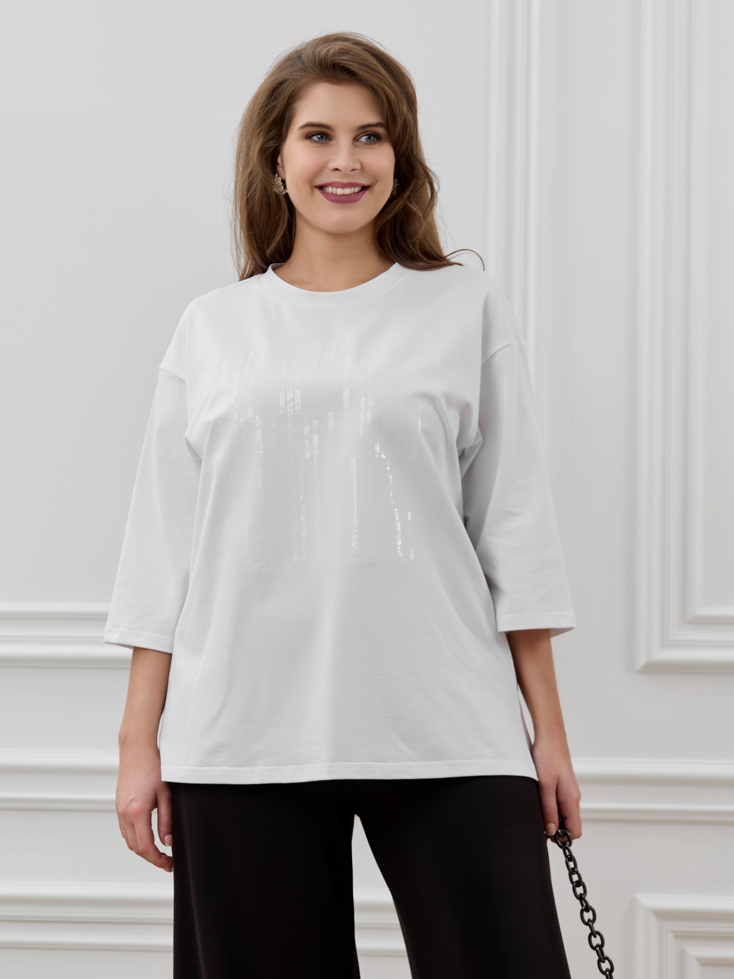 Футболка женская из гладкокрашеного трикотажного полотна «кулирка с лайкрой», свободного покроя, со спущенным плечом и втачными рукавами длиной до локтя, горловиной овальной формы, обработанной втачной планкой. По центру полочки выполнена вышивка «пайетками» в тон изделия. В нижней части боковых швов небольшие разрезы.