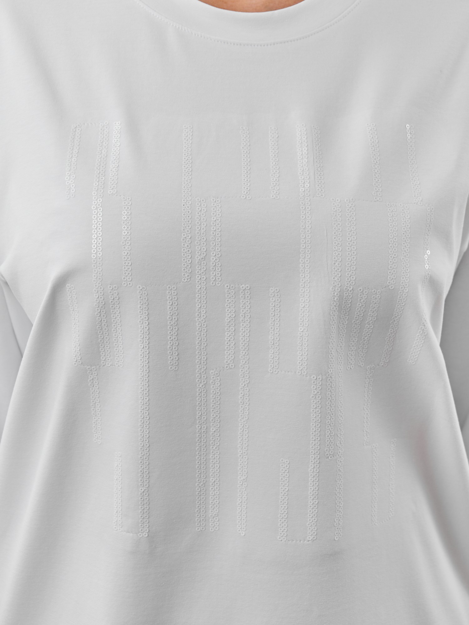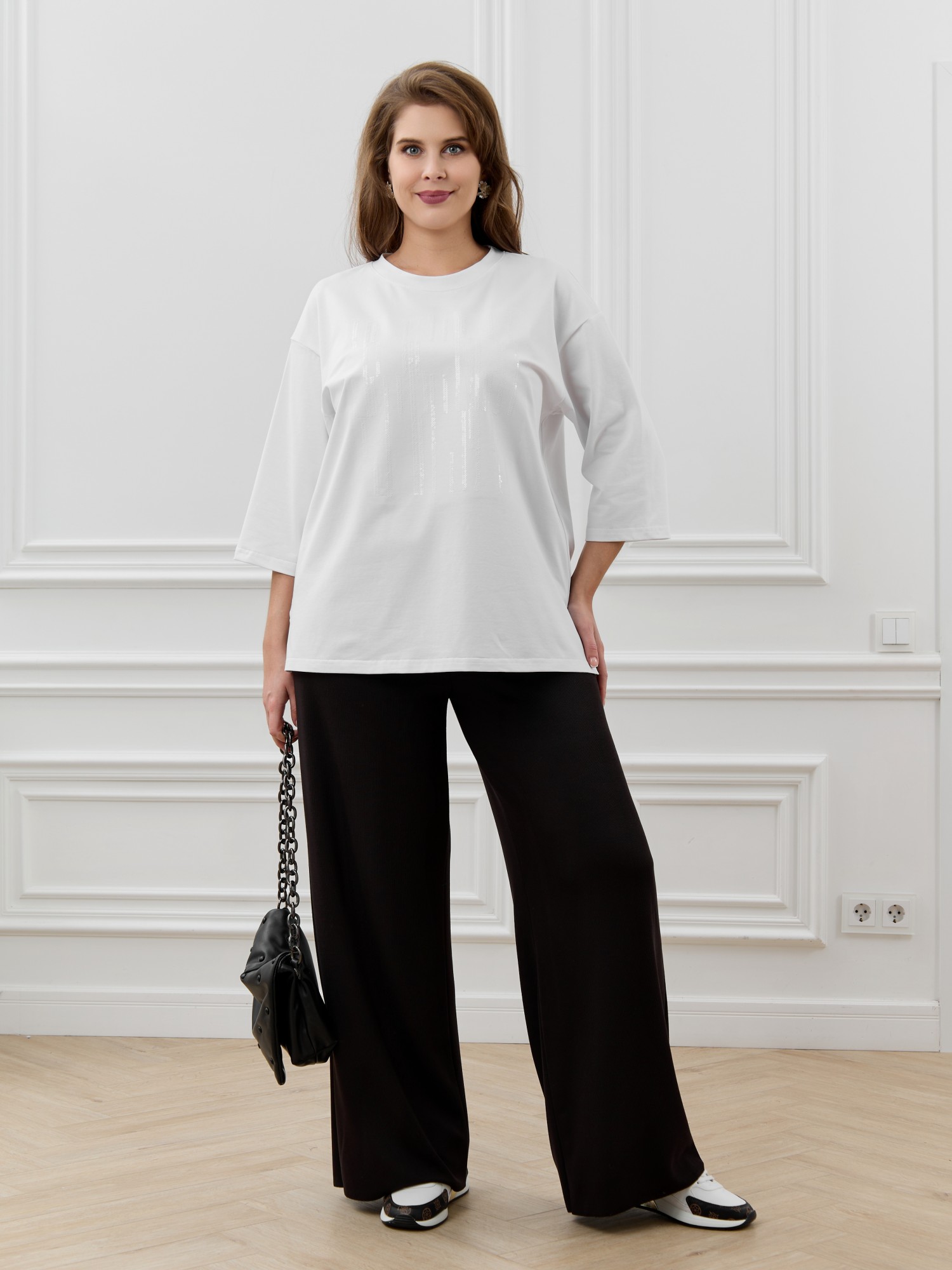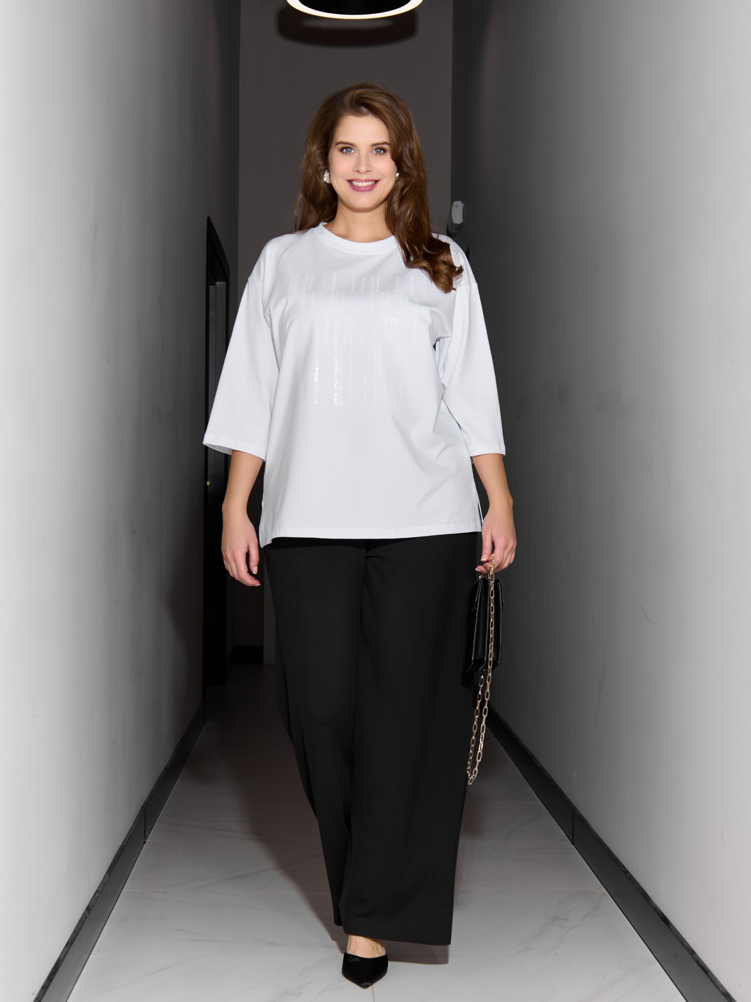 Футболка женская из гладкокрашеного трикотажного полотна «кулирка с лайкрой», свободного покроя, со спущенным плечом и втачными рукавами длиной до локтя, горловиной овальной формы, обработанной втачной планкой. По центру полочки выполнена вышивка «пайетками» в тон изделия. В нижней части боковых швов небольшие разрезы.