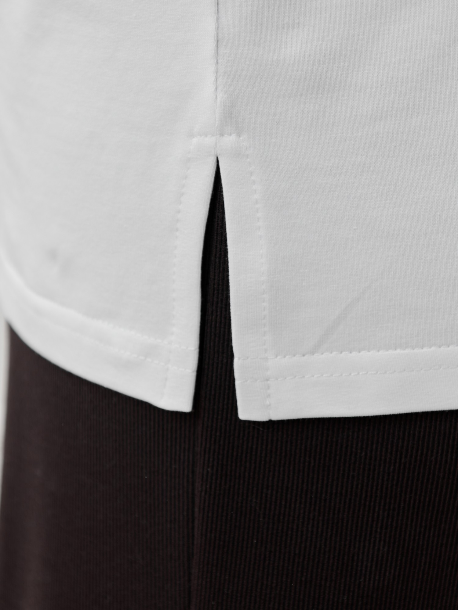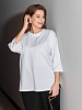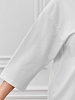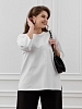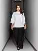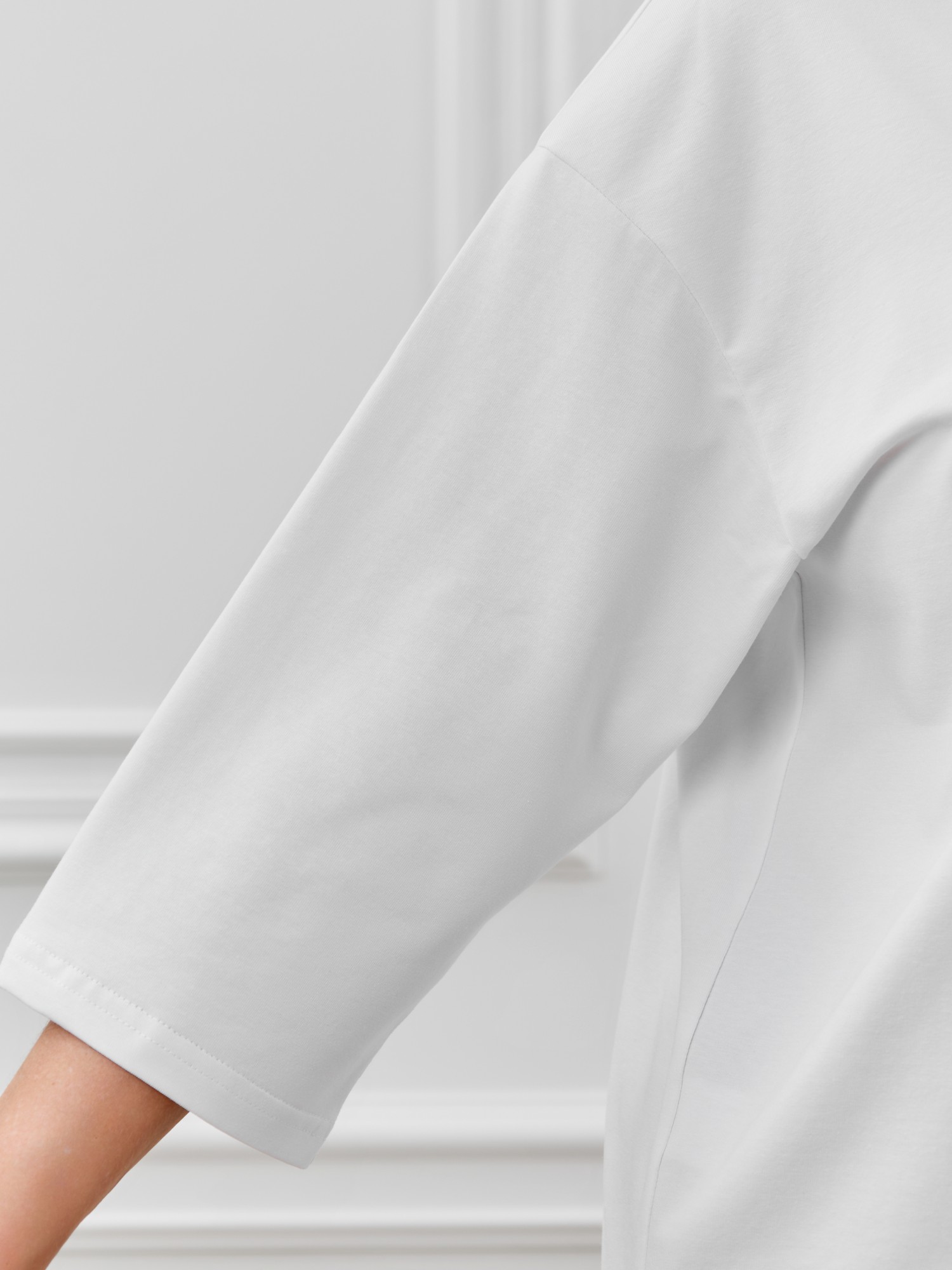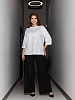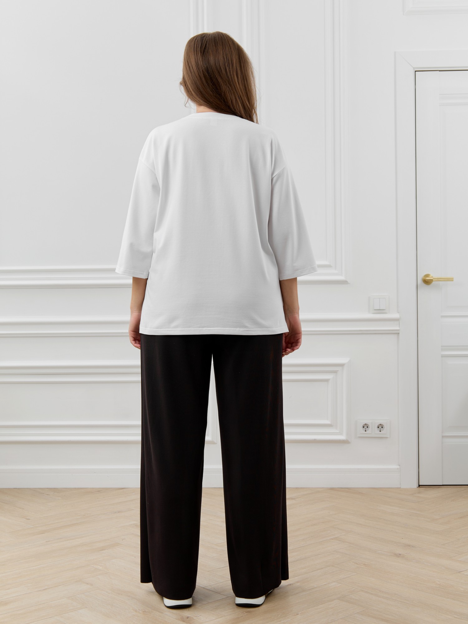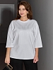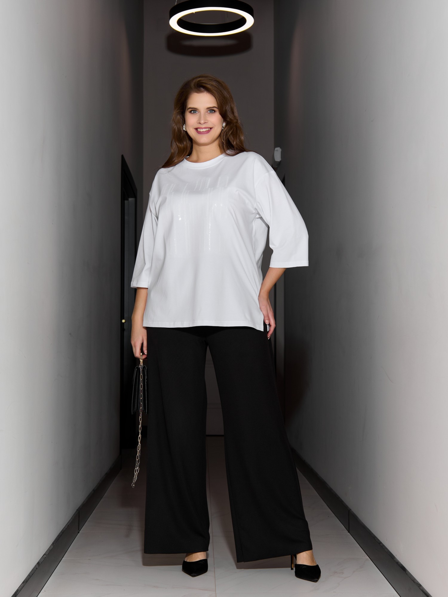 Футболка женская из гладкокрашеного трикотажного полотна «кулирка с лайкрой», свободного покроя, со спущенным плечом и втачными рукавами длиной до локтя, горловиной овальной формы, обработанной втачной планкой. По центру полочки выполнена вышивка «пайетками» в тон изделия. В нижней части боковых швов небольшие разрезы.
