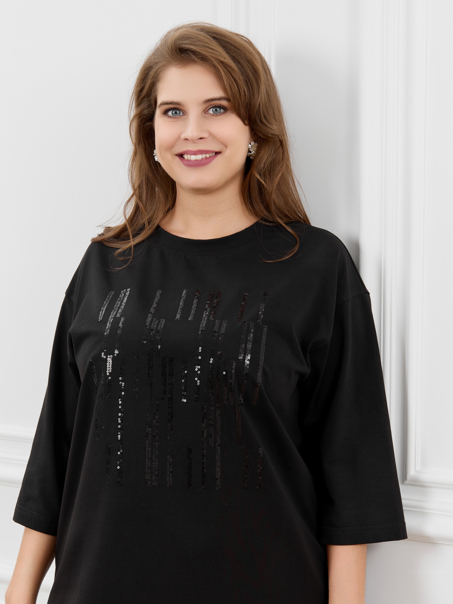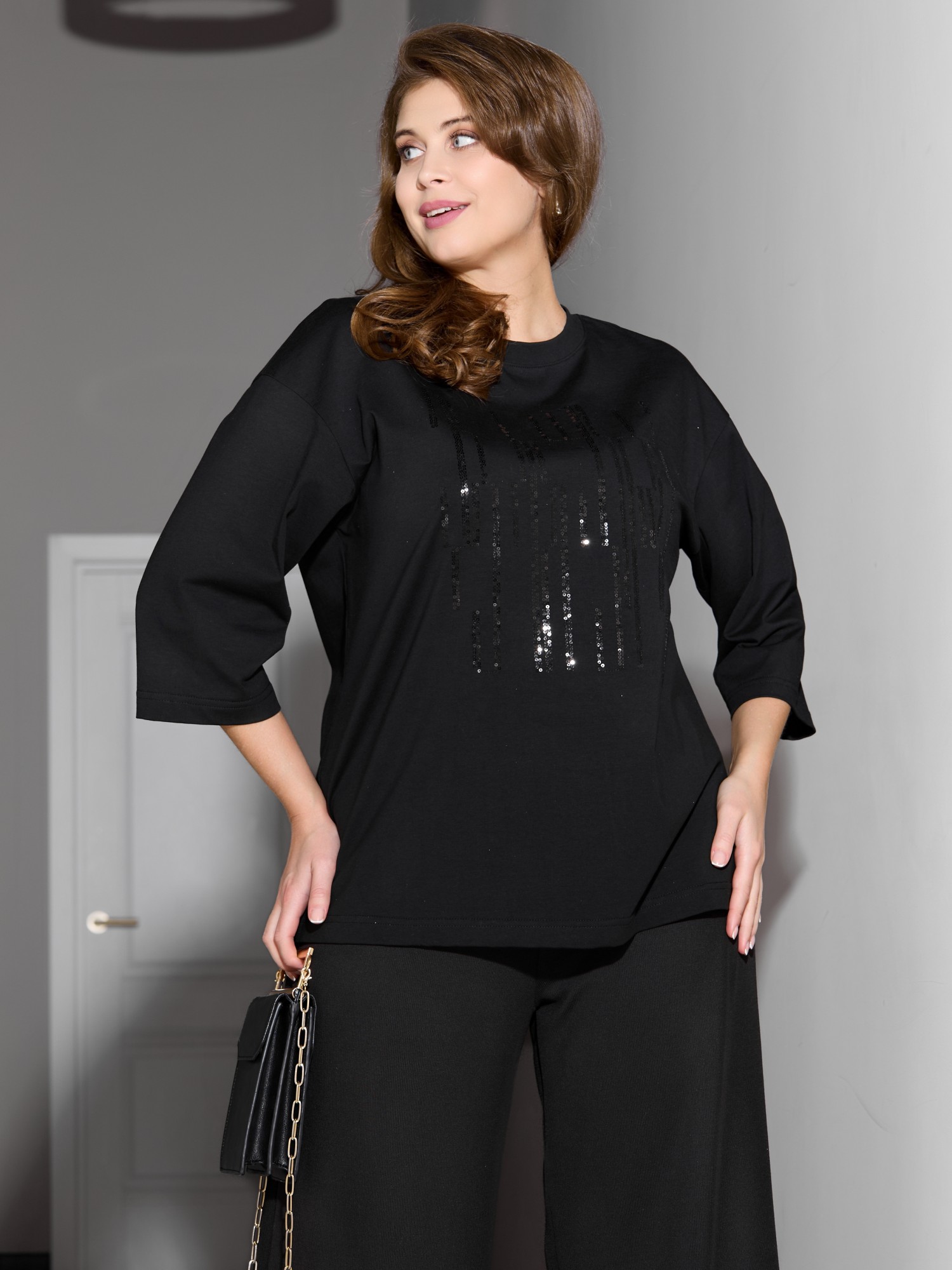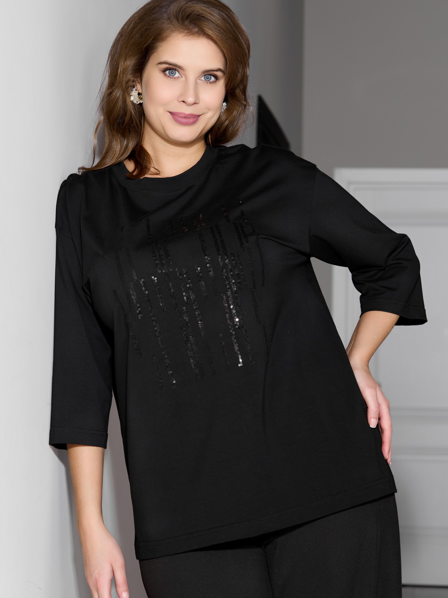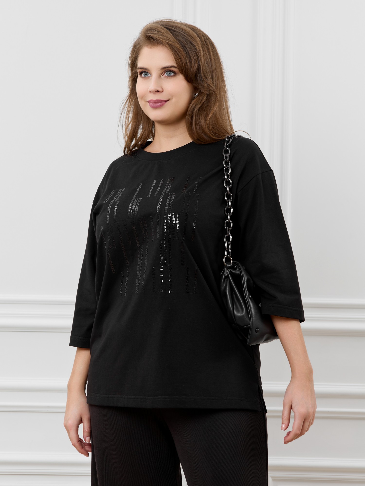 Футболка женская из гладкокрашеного трикотажного полотна «кулирка с лайкрой», свободного покроя, со спущенным плечом и втачными рукавами длиной до локтя, горловиной овальной формы, обработанной втачной планкой. По центру полочки выполнена вышивка «пайетками» в тон изделия. В нижней части боковых швов небольшие разрезы.