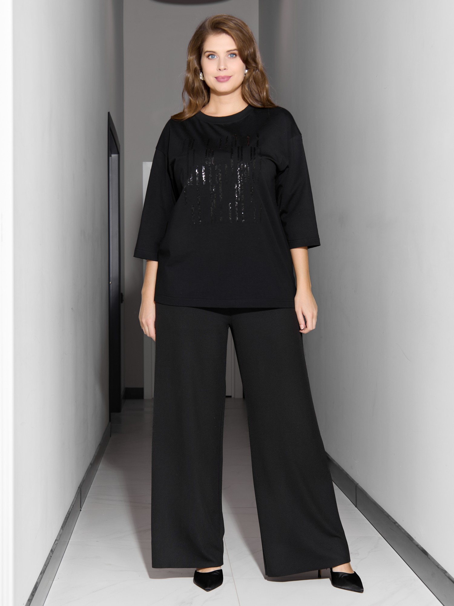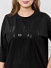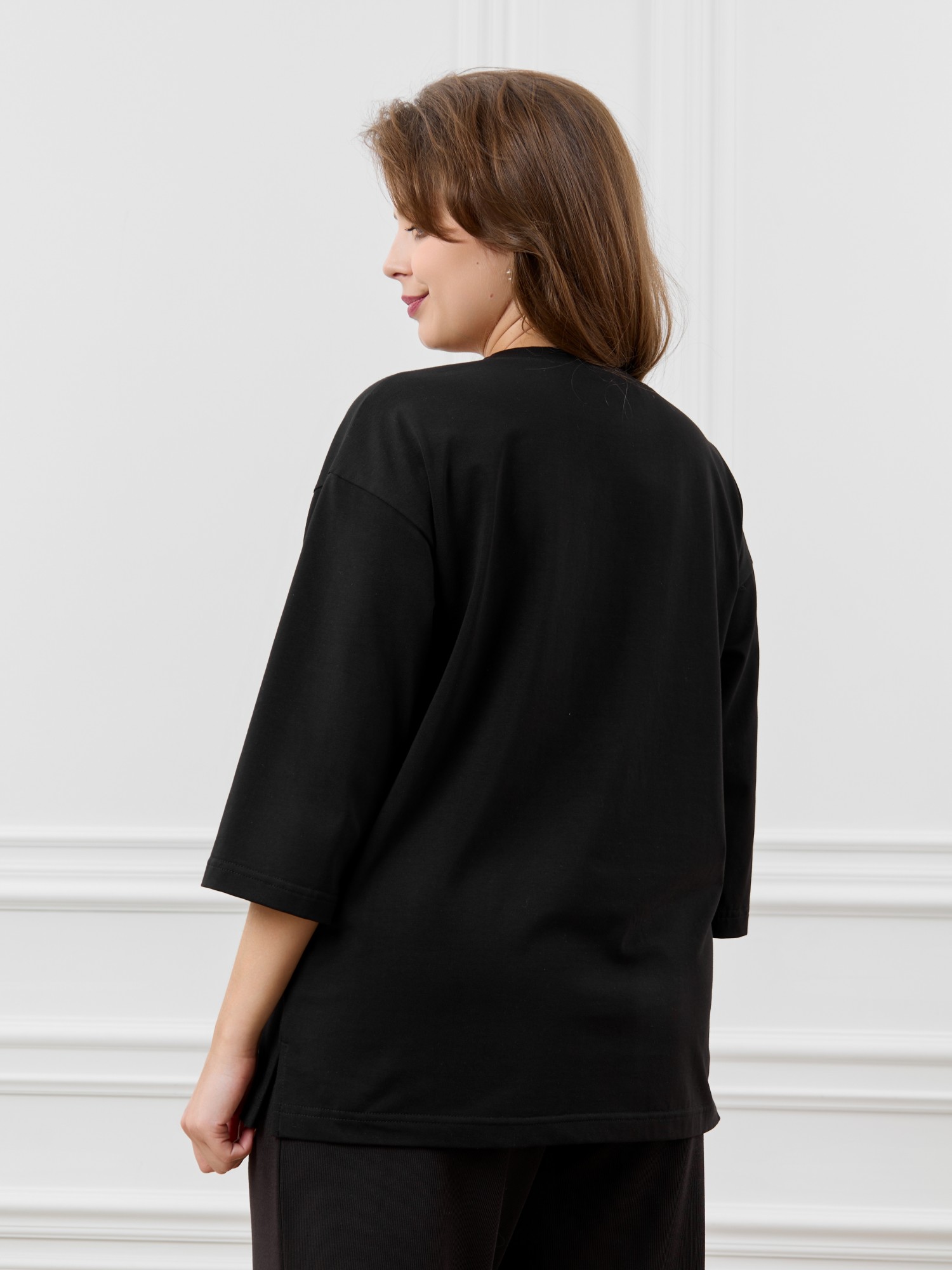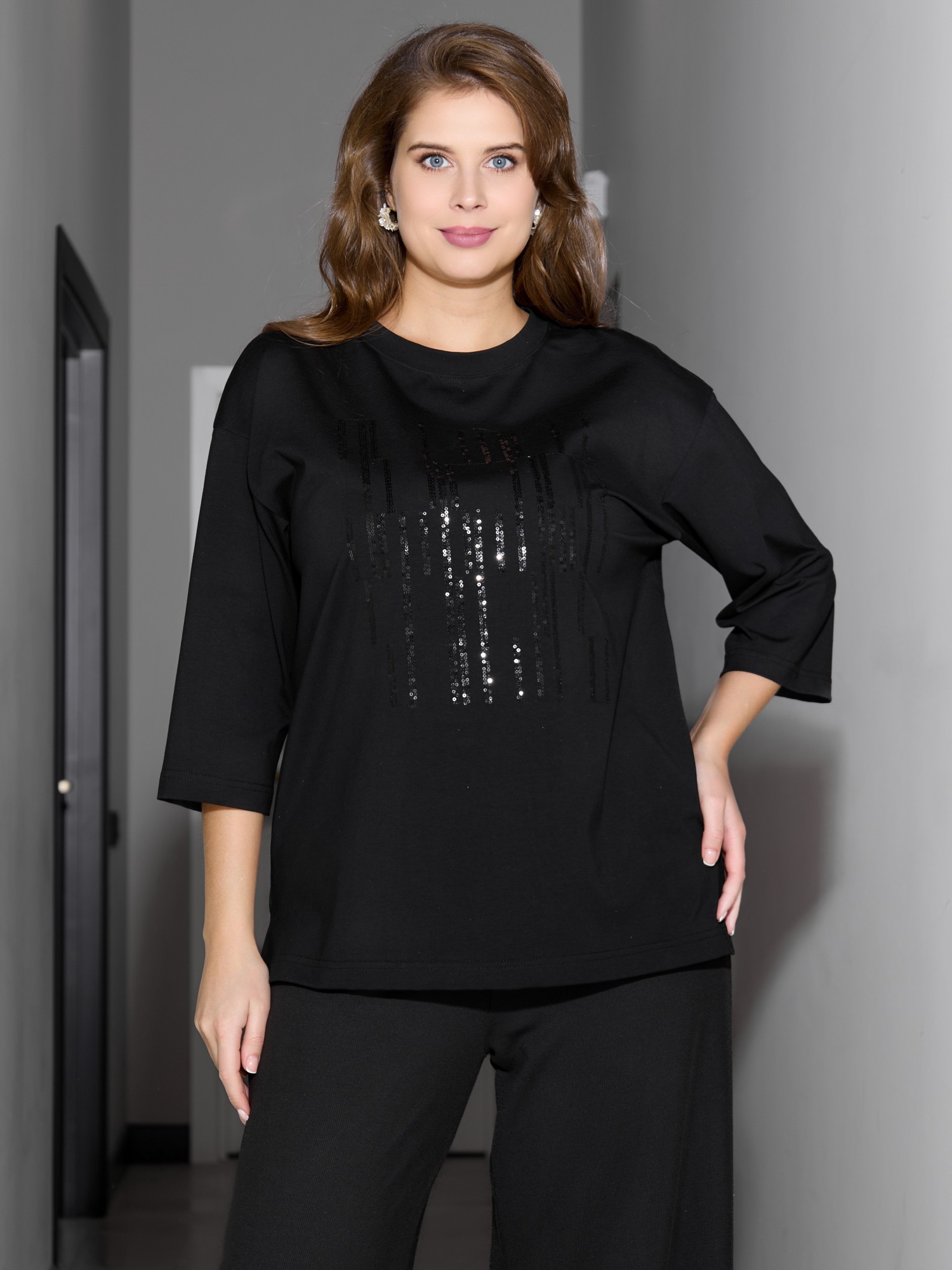 Футболка женская из гладкокрашеного трикотажного полотна «кулирка с лайкрой», свободного покроя, со спущенным плечом и втачными рукавами длиной до локтя, горловиной овальной формы, обработанной втачной планкой. По центру полочки выполнена вышивка «пайетками» в тон изделия. В нижней части боковых швов небольшие разрезы.