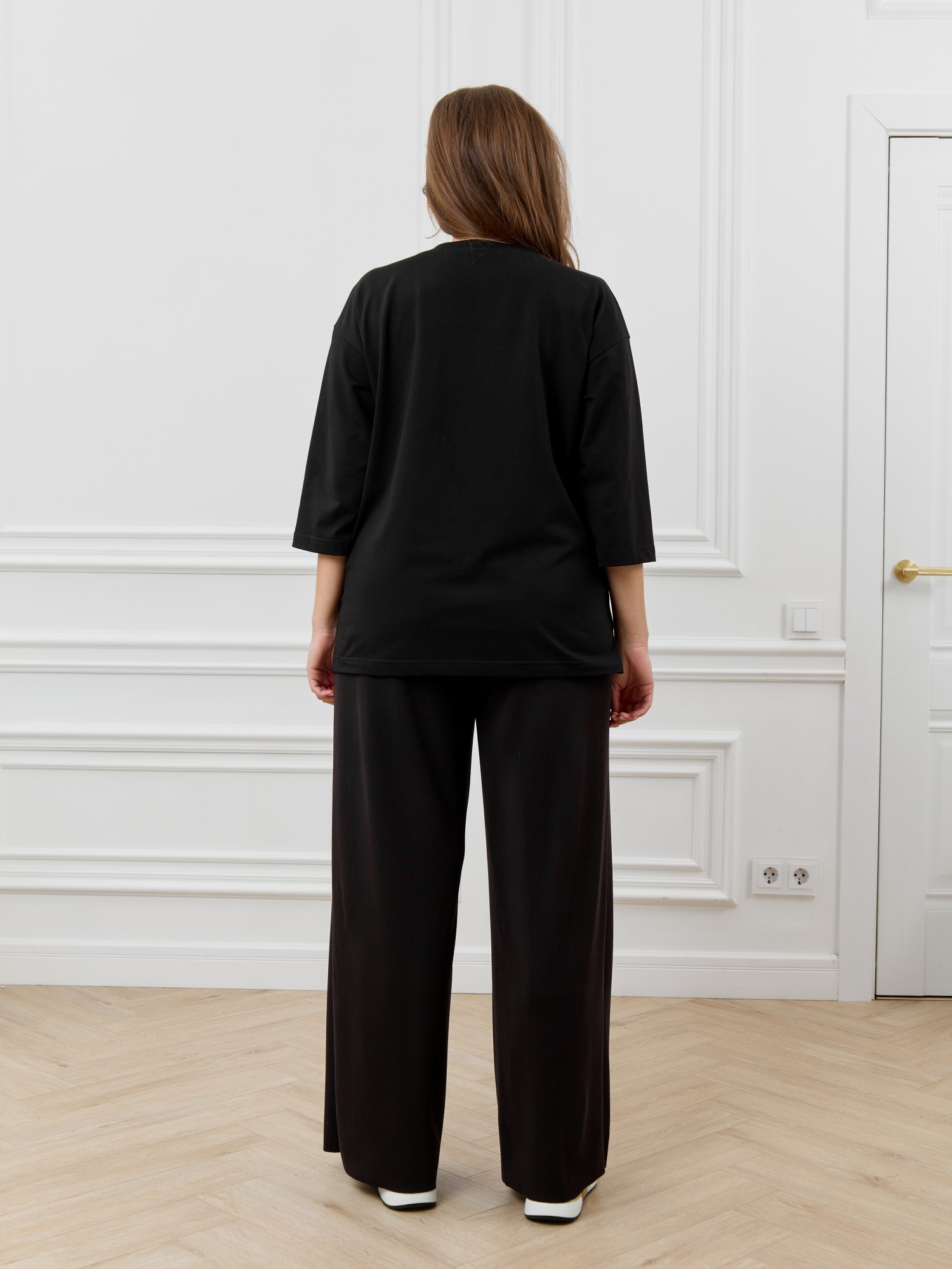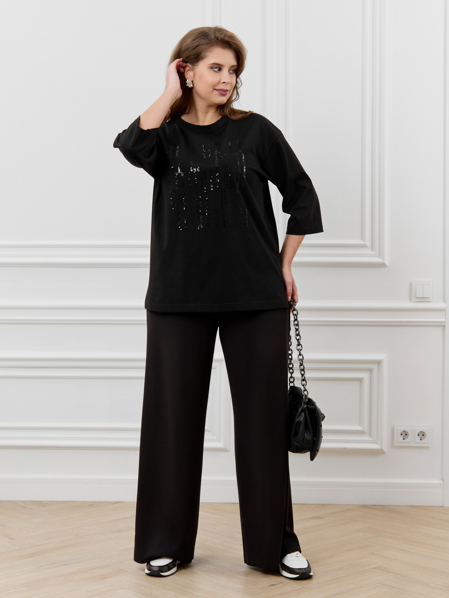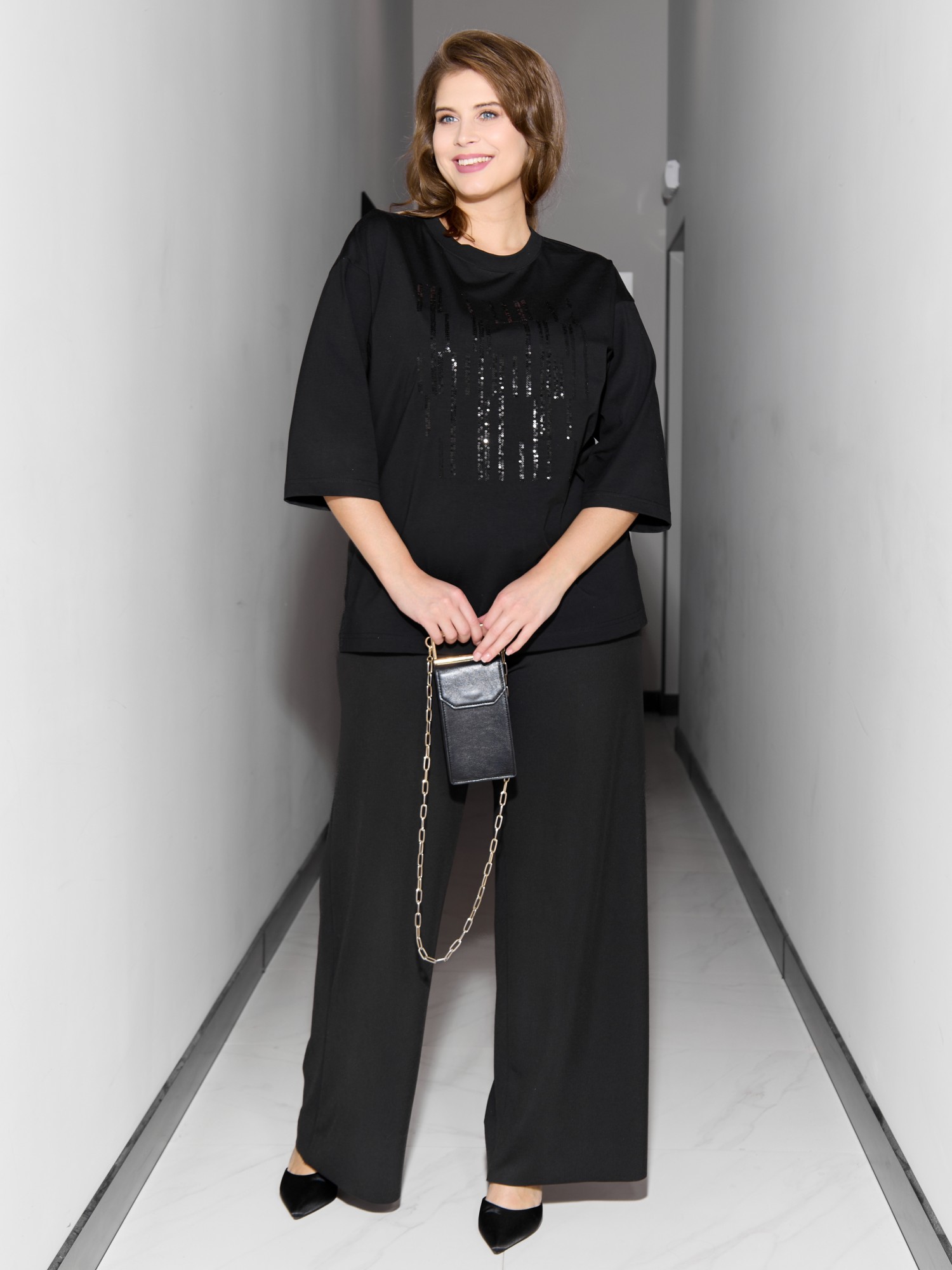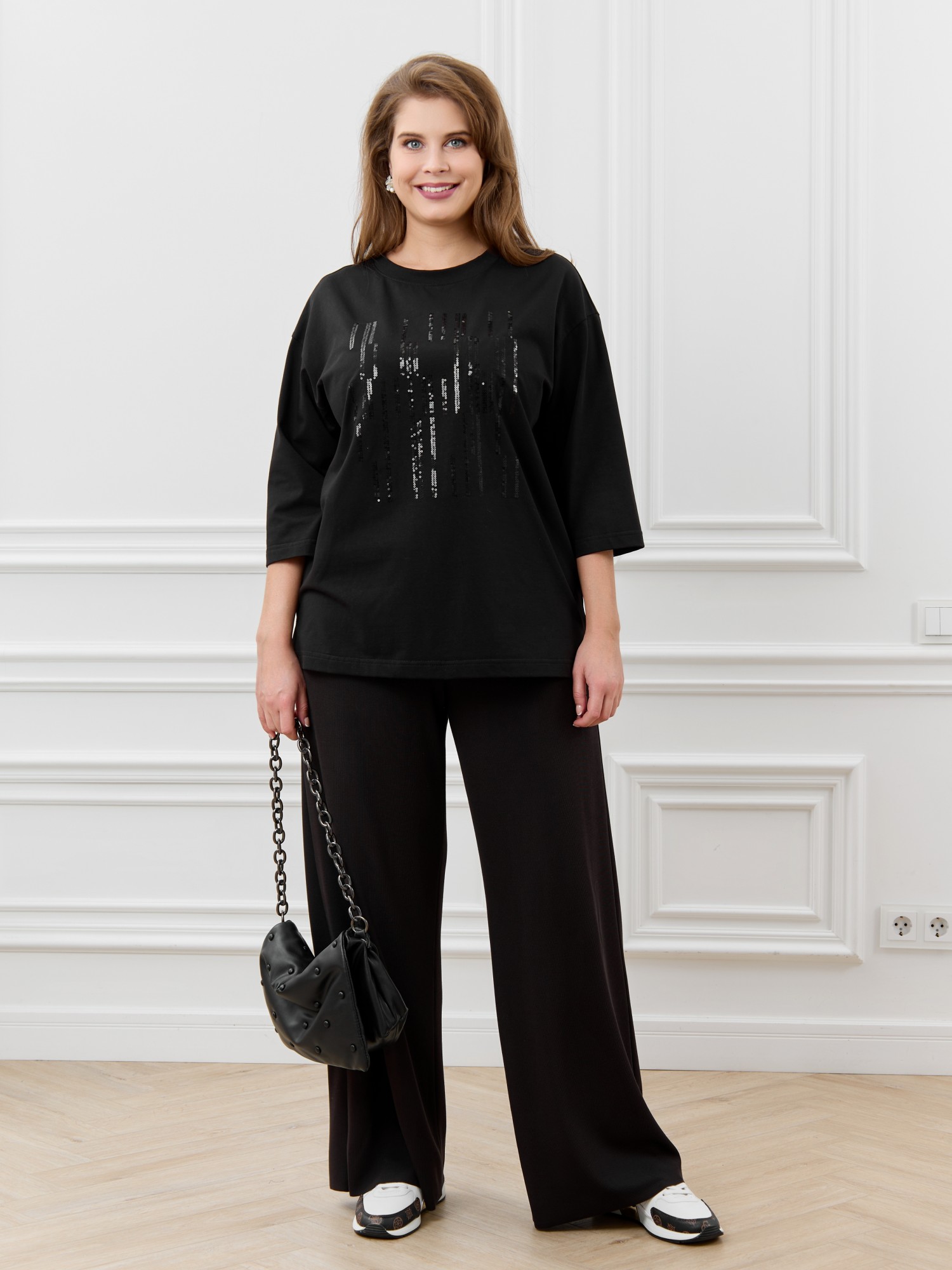Футболка женская из гладкокрашеного трикотажного полотна «кулирка с лайкрой», свободного покроя, со спущенным плечом и втачными рукавами длиной до локтя, горловиной овальной формы, обработанной втачной планкой. По центру полочки выполнена вышивка «пайетками» в тон изделия. В нижней части боковых швов небольшие разрезы.