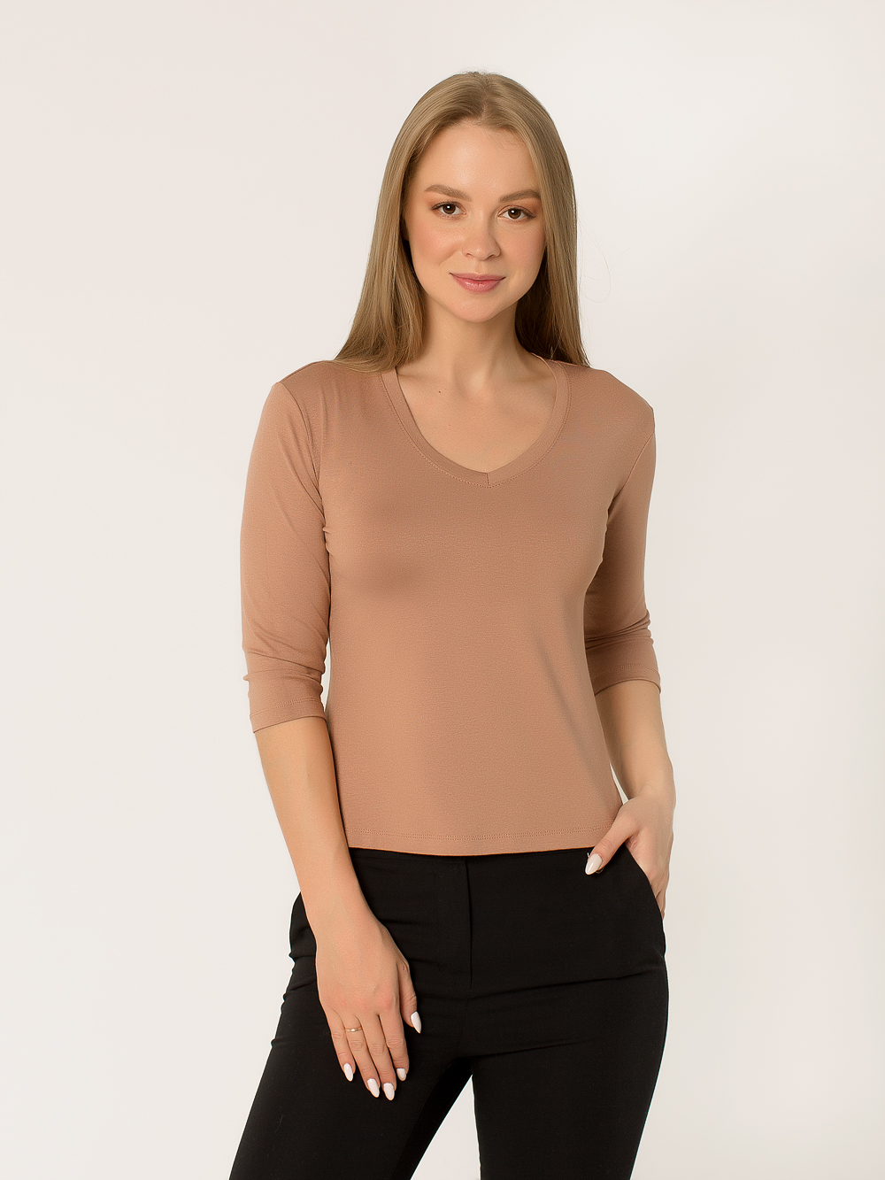 Футболка из вискозного полотна прилегающего силуэта. Данная модель удобна, практична и всегда будет актуальна. V-образная горловина, которая обрабатывается под планку, эффектно смотрится на любой случай. Такая футболка - отлично зарекомендовала себя в повседневном использовании.