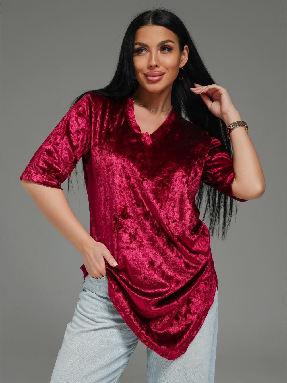 Горловина: V-образный вырез — классика, которая визуально вытягивает шею и добавляет образу лёгкую элегантность.