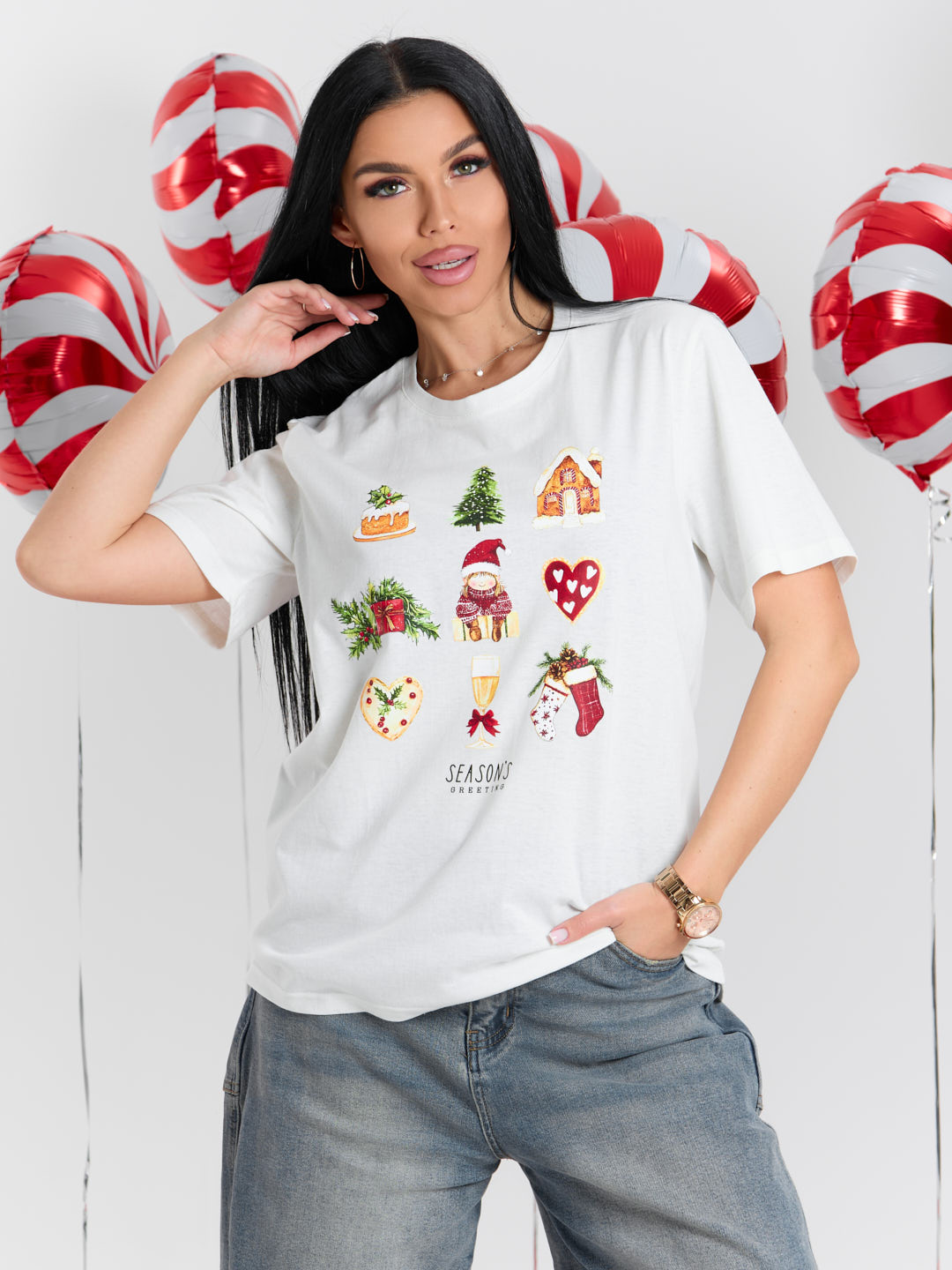 Эта футболка с новогодним принтом создана для тех, кто любит атмосферу зимних праздников. Яркие краски сразу вызывают ассоциации с тёплыми семейными вечерами, подарками под ёлкой и ароматом имбирного печенья. Классическая футболка с коротким рукавом и О-образной горловиной, будет отлично смотреться как за новогодним столом, так и в канун праздников.