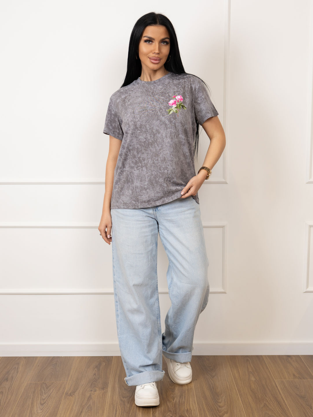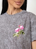 Базовая женская футболка из 100% хлопка с эффектом варенки, умеренного объема, О-образной горловиной и коротким рукавом. По горловине, рукаву и низу изделия - декоративная строчка. Спереди и сзади нанесен принт "Полевые цветы". Рост модели 167см.