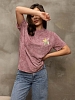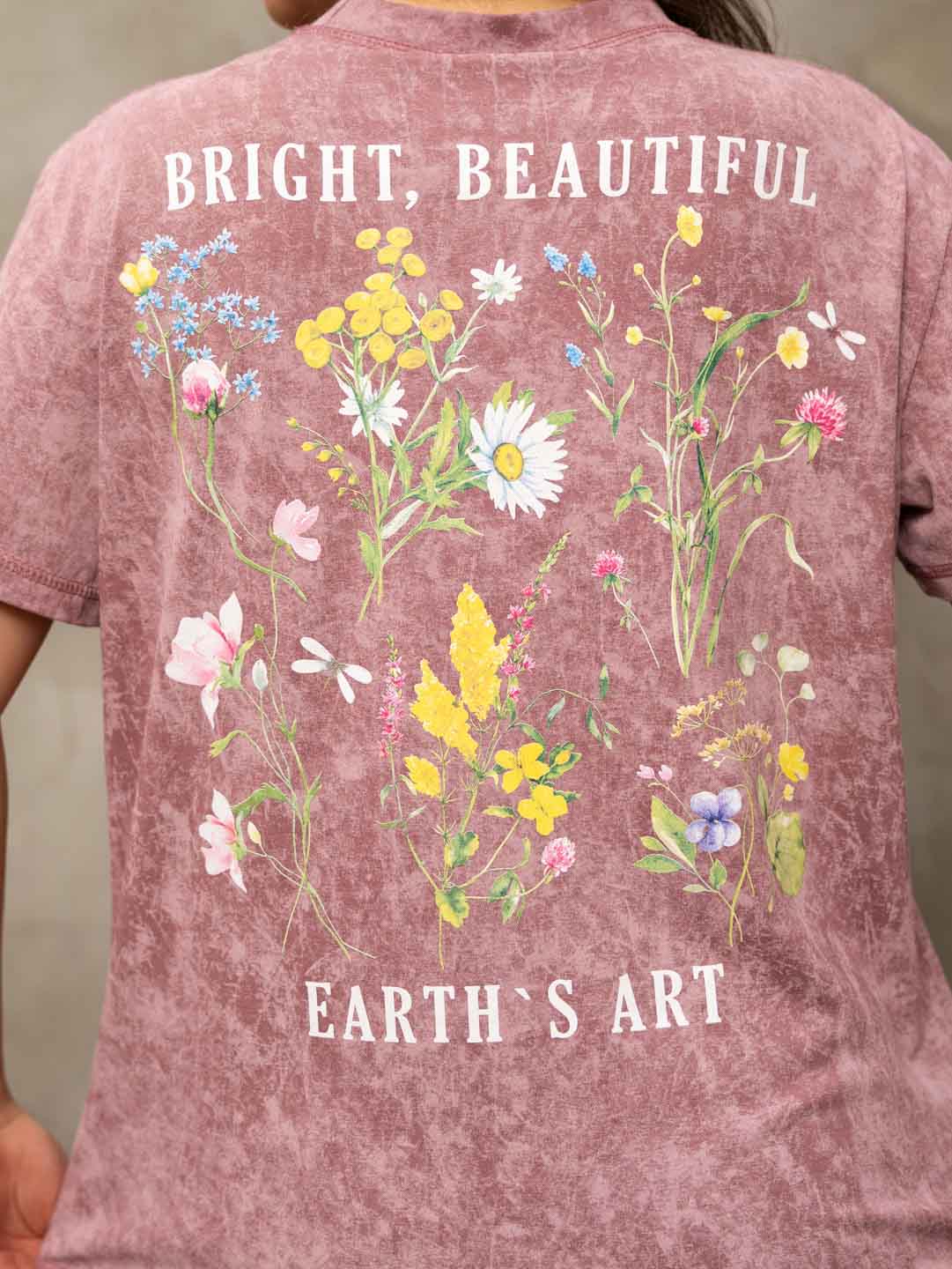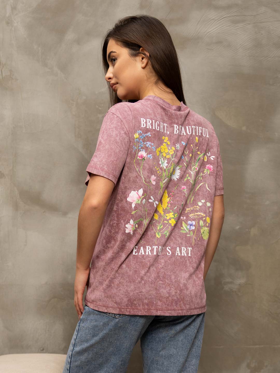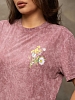 Базовая женская футболка из 100% хлопка с эффектом варенки, умеренного объема, О-образной горловиной и коротким рукавом. По горловине, рукаву и низу изделия - декоративная строчка. Спереди и сзади нанесен принт "Полевые цветы". Рост модели 167см.