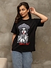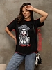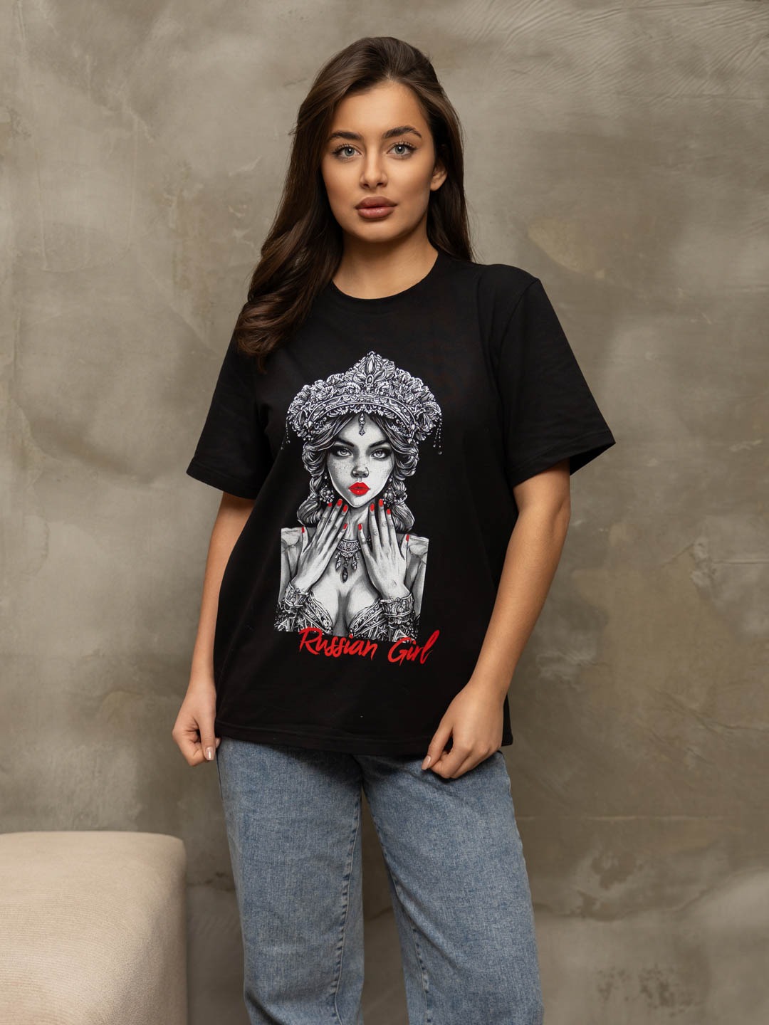 Женская футболка из кулирки с лайкрой высокого качества, базового кроя, с коротким рукавом и О-образной горловиной. Печать с нотками патриотизма добавляет изюминку образу.