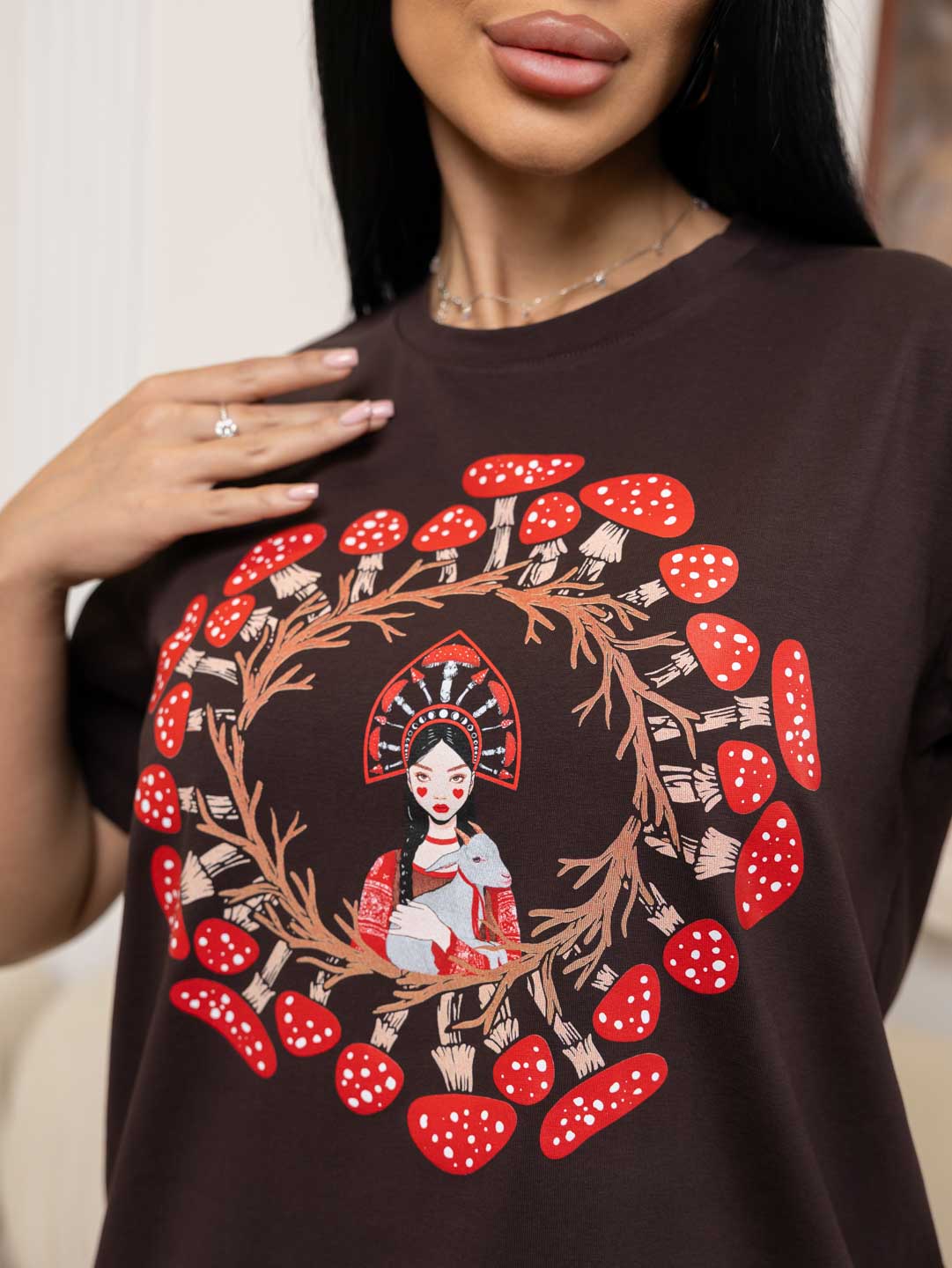 Женская футболка из кулирки с лайкрой высокого качества, базового кроя, с коротким рукавом и О-образной горловиной. Печать с нотками патриотизма добавляет изюминку образу.