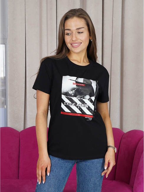 Футболка Презент прямого силуэта, со спущенным плечом и коротким втачным рукавом. На полочке - термопечать. Повседневная женская футболка в классической цветовой гамме. Базовый элемент гардероба.