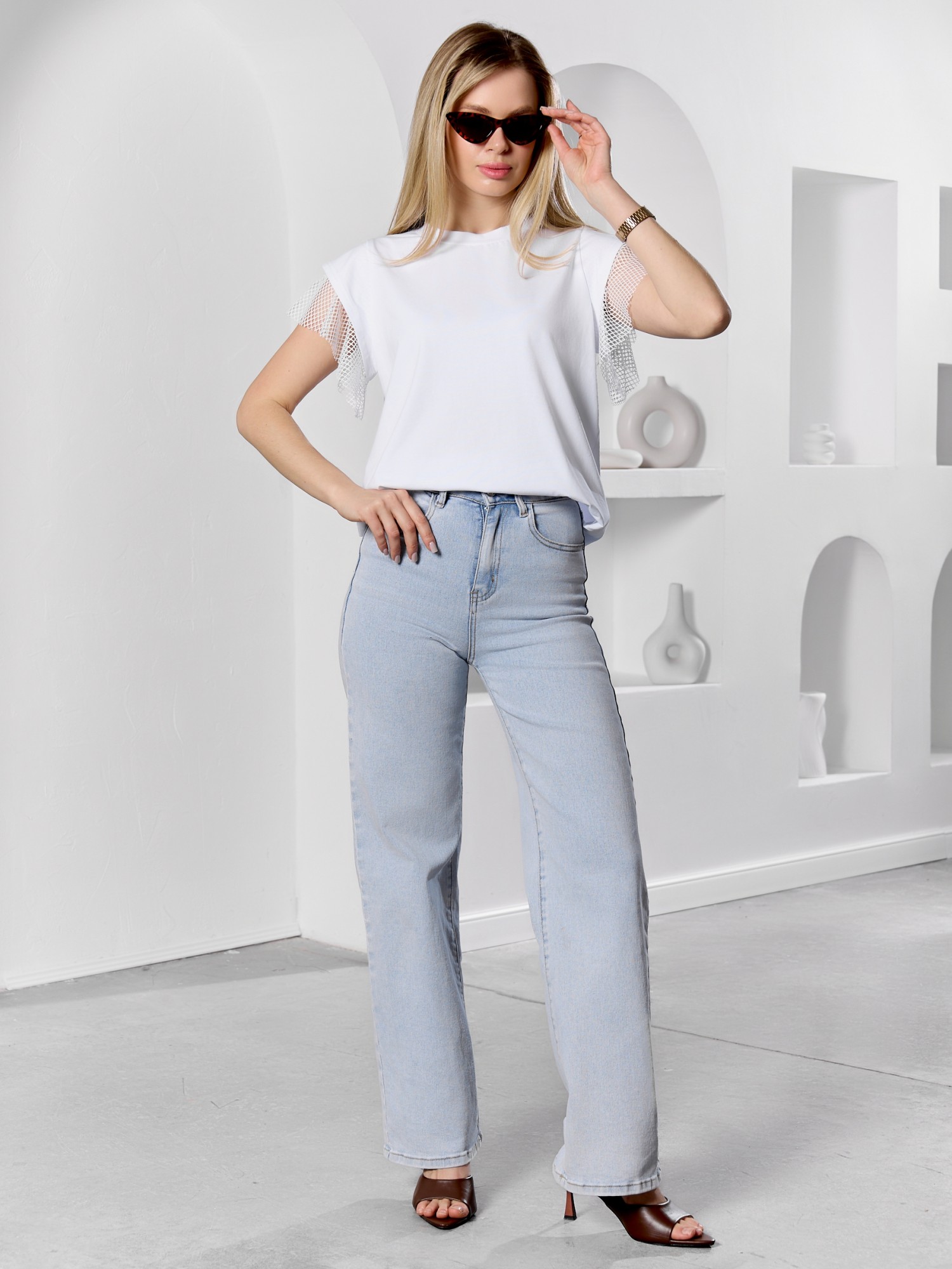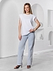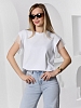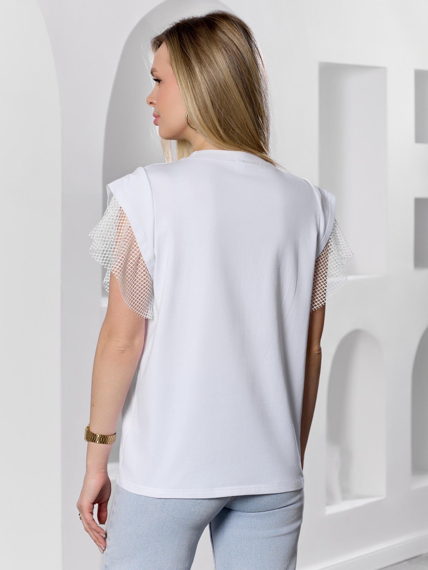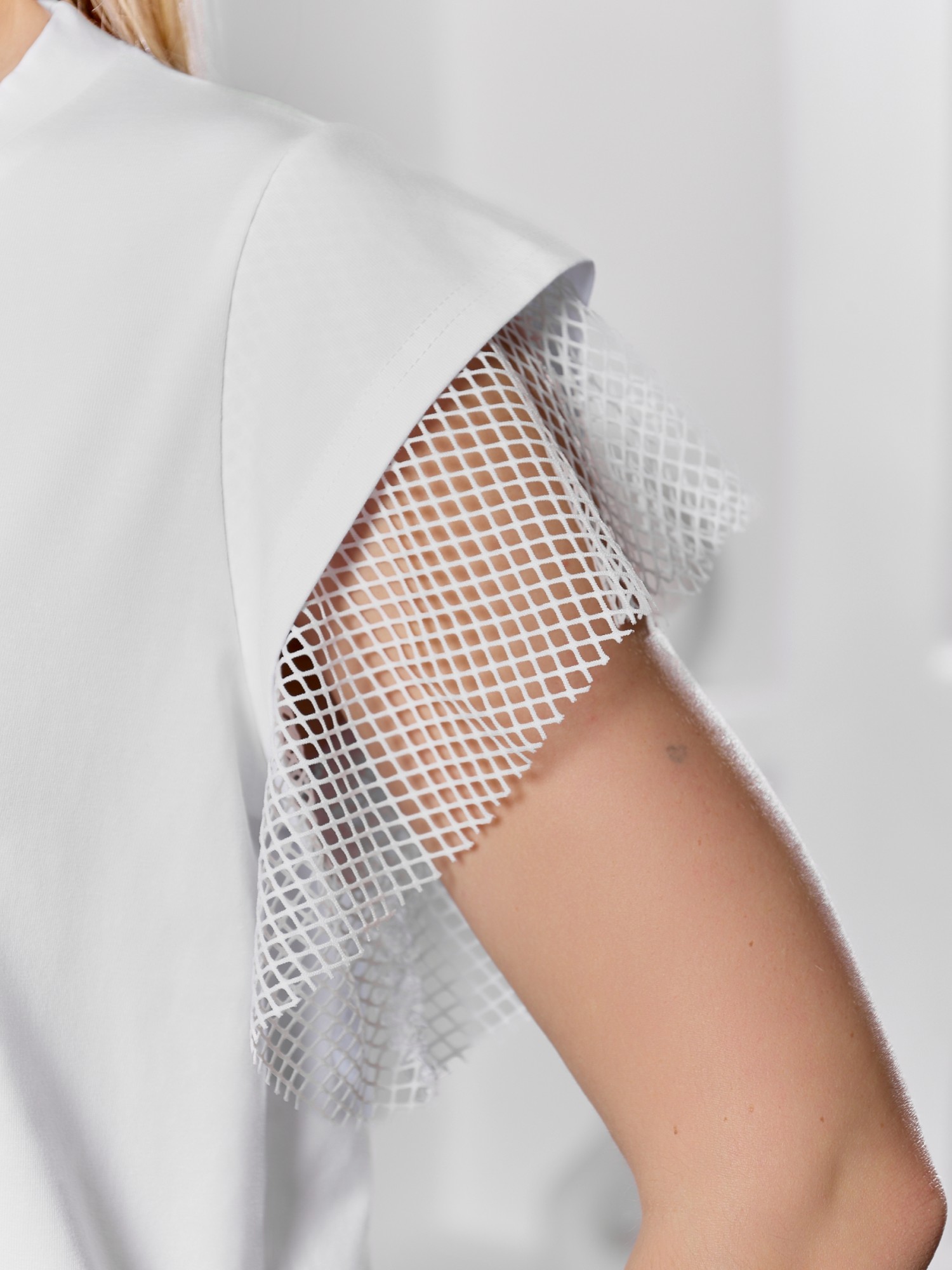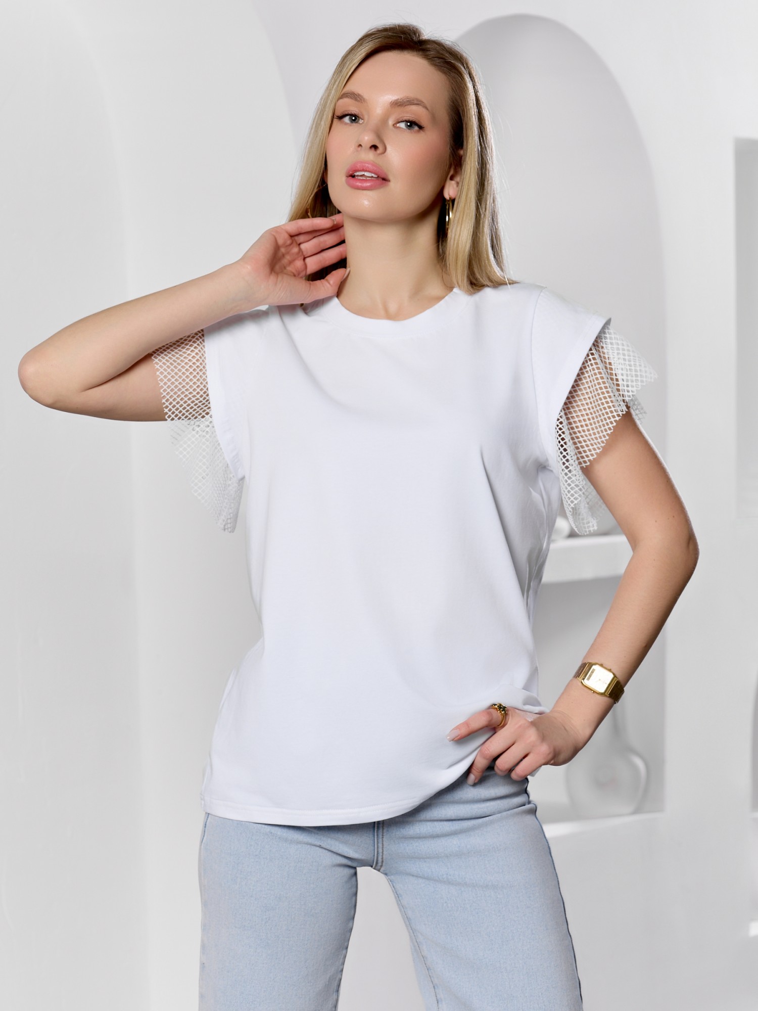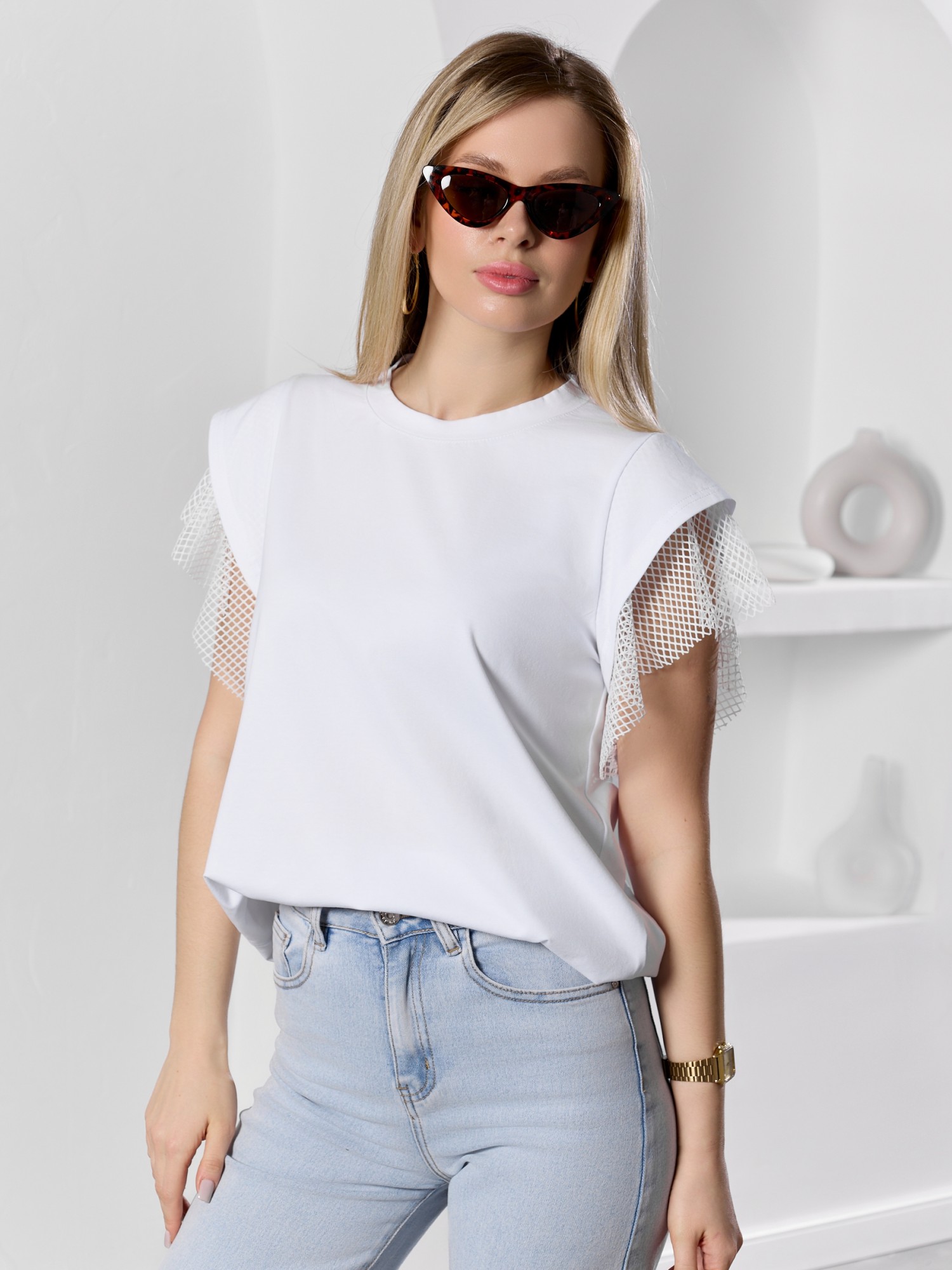 Футболка женская из гладкокрашеного полотна «кулирка» с лайкрой свободного кроя, с горловиной овальной формы, обработанной втачной планкой из основного материала. Особенностью модели являются двойные втачные рукава - «крылышки», выполненные из основного материала и «сетки стрейч» с крупными ячейками. За счет полупрозрачного свойства «сетки», рукава выглядят «воздушными» и легкими.