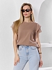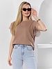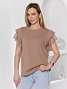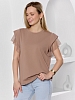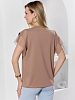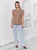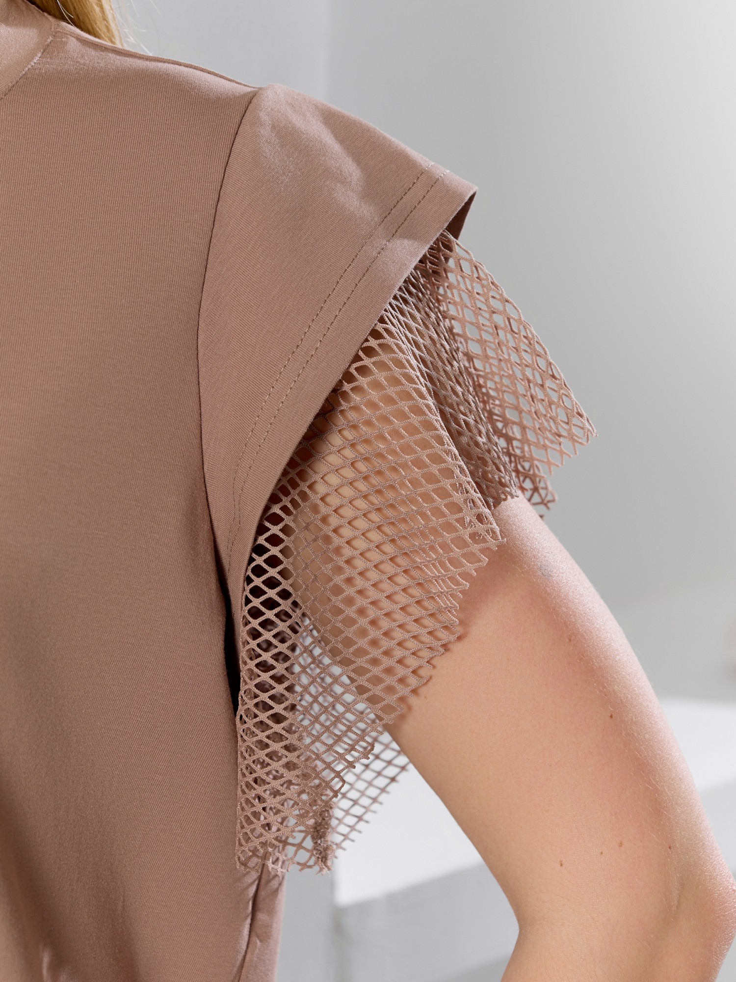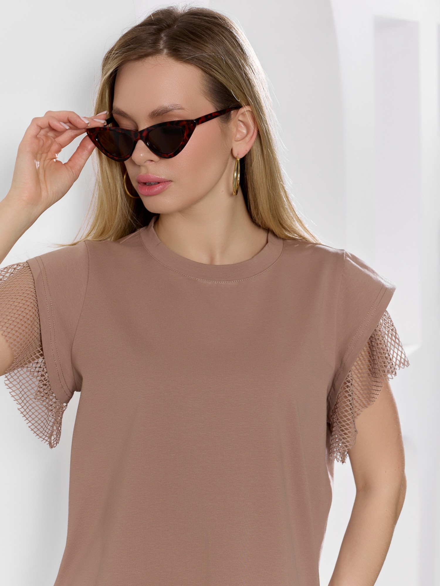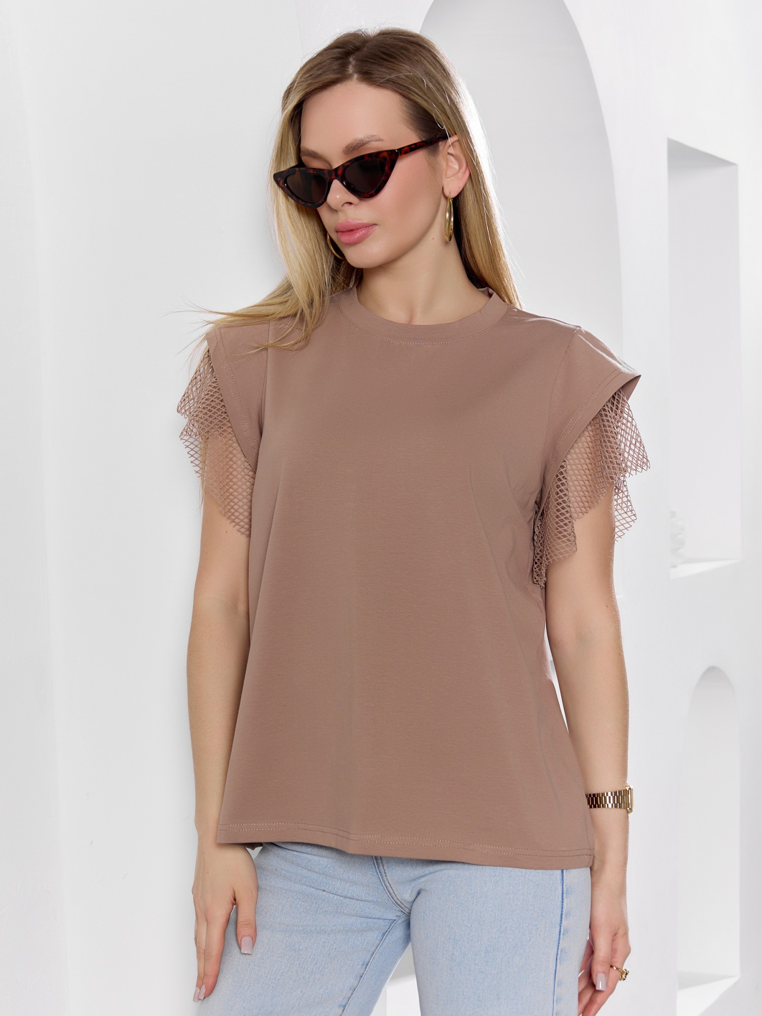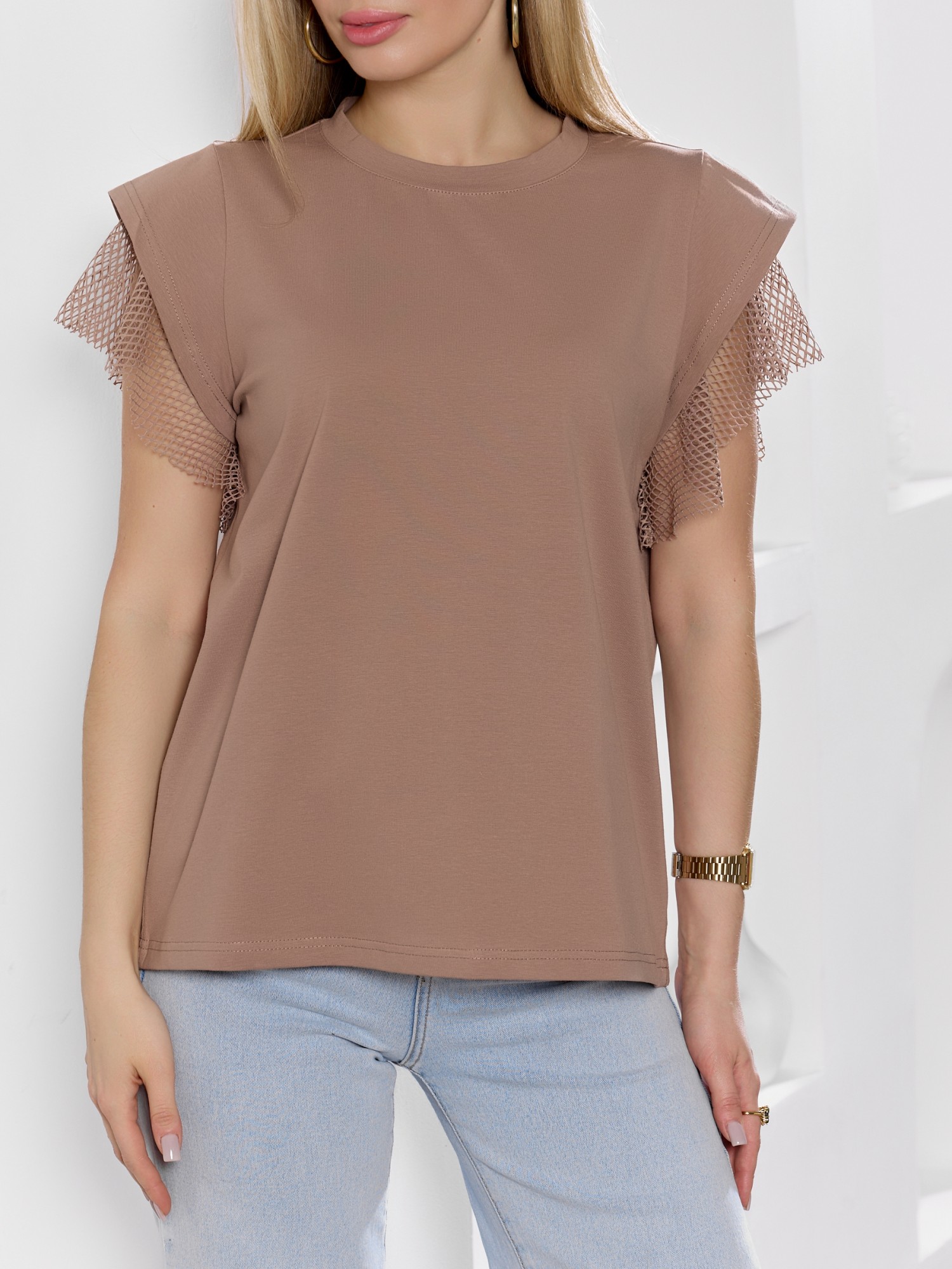 Футболка женская из гладкокрашеного полотна «кулирка» с лайкрой свободного кроя, с горловиной овальной формы, обработанной втачной планкой из основного материала. Особенностью модели являются двойные втачные рукава - «крылышки», выполненные из основного материала и «сетки стрейч» с крупными ячейками. За счет полупрозрачного свойства «сетки», рукава выглядят «воздушными» и легкими.