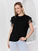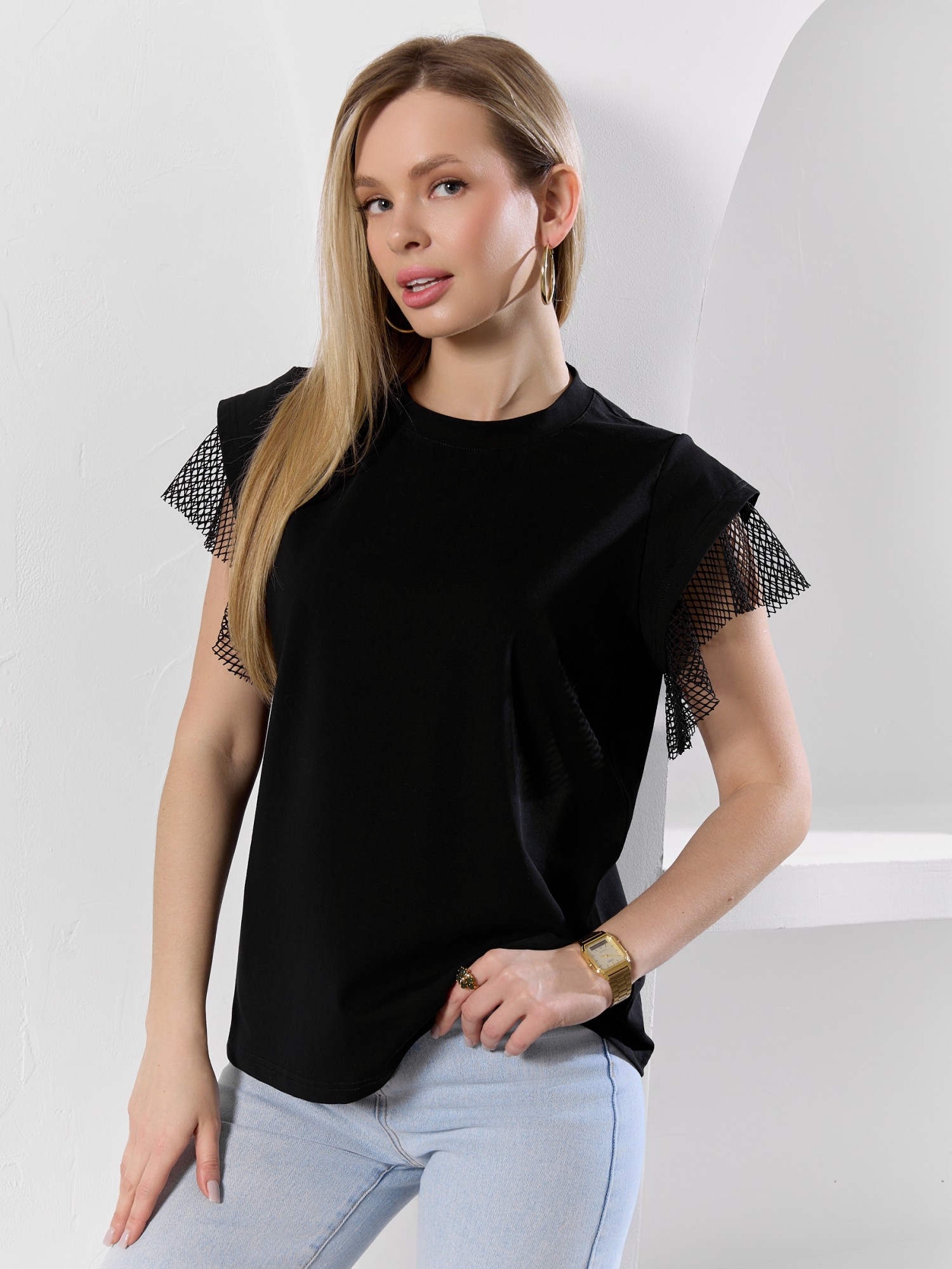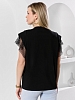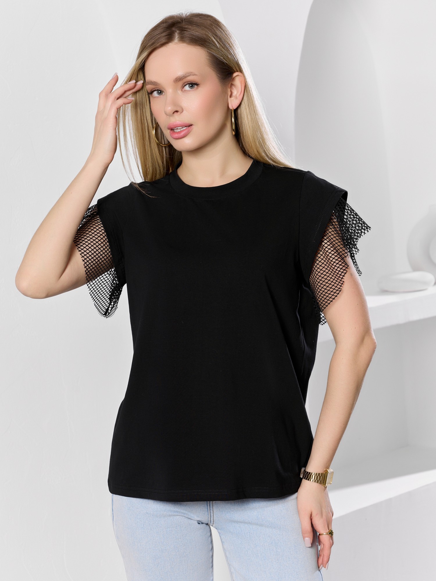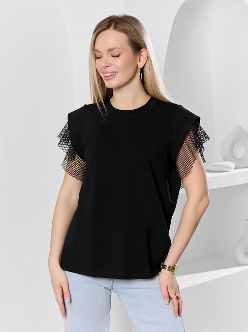 Футболка женская из гладкокрашеного полотна «кулирка» с лайкрой свободного кроя, с горловиной овальной формы, обработанной втачной планкой из основного материала. Особенностью модели являются двойные втачные рукава - «крылышки», выполненные из основного материала и «сетки стрейч» с крупными ячейками. За счет полупрозрачного свойства «сетки», рукава выглядят «воздушными» и легкими.