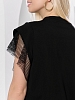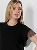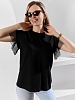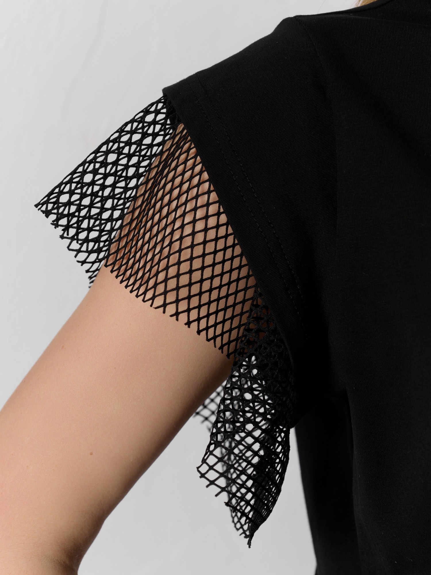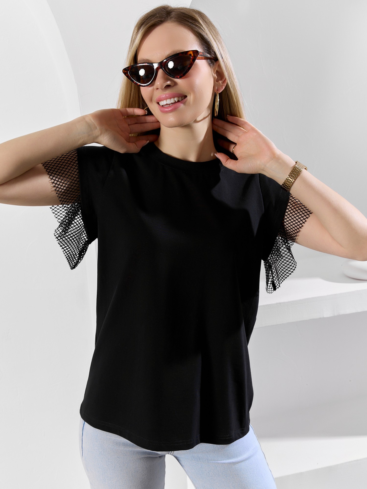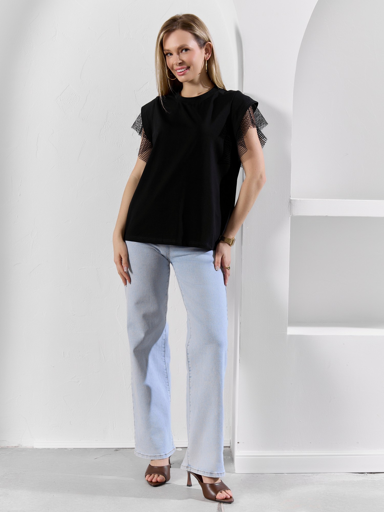 Футболка женская из гладкокрашеного полотна «кулирка» с лайкрой свободного кроя, с горловиной овальной формы, обработанной втачной планкой из основного материала. Особенностью модели являются двойные втачные рукава - «крылышки», выполненные из основного материала и «сетки стрейч» с крупными ячейками. За счет полупрозрачного свойства «сетки», рукава выглядят «воздушными» и легкими.