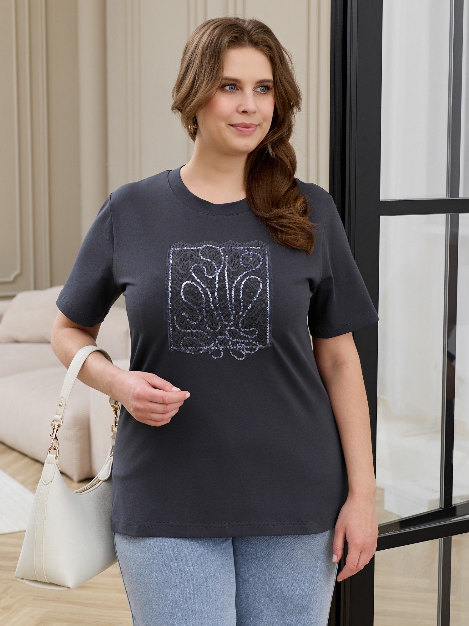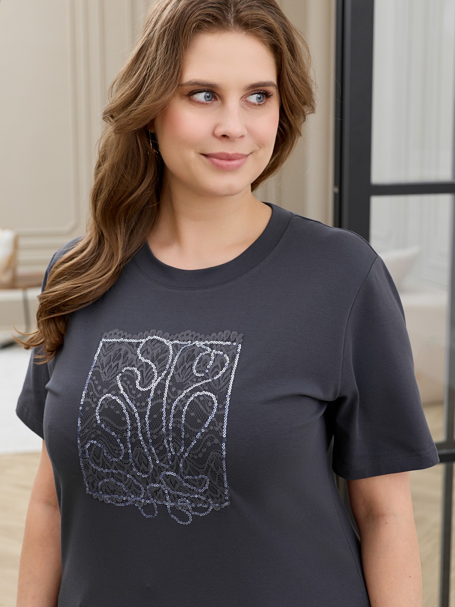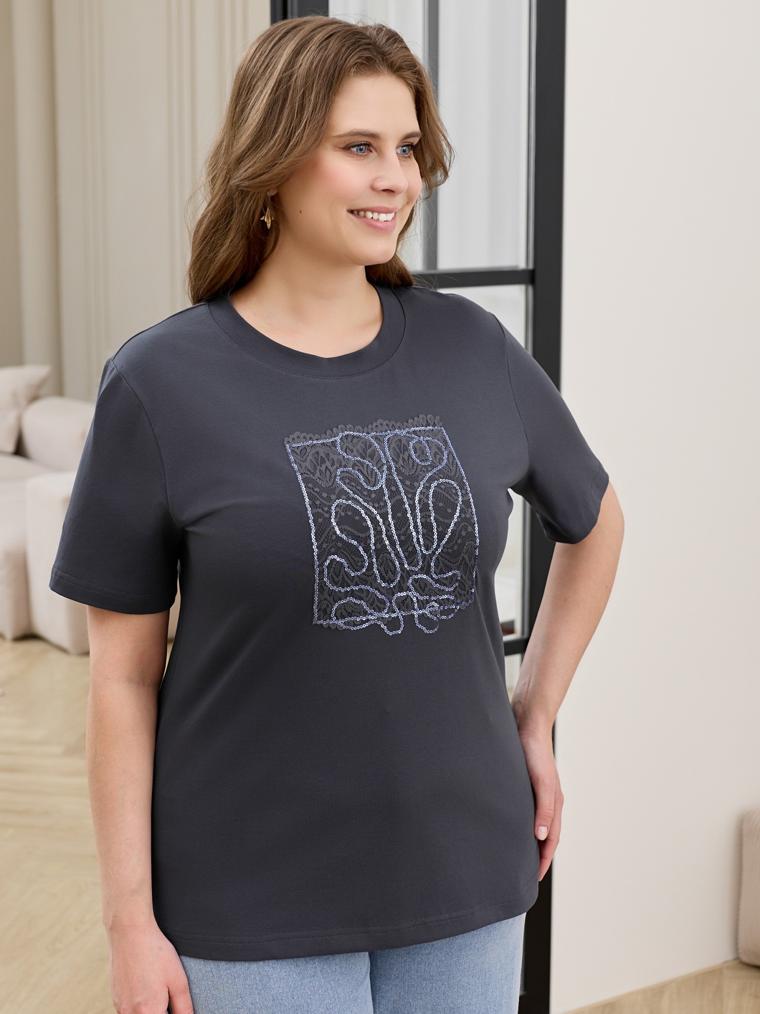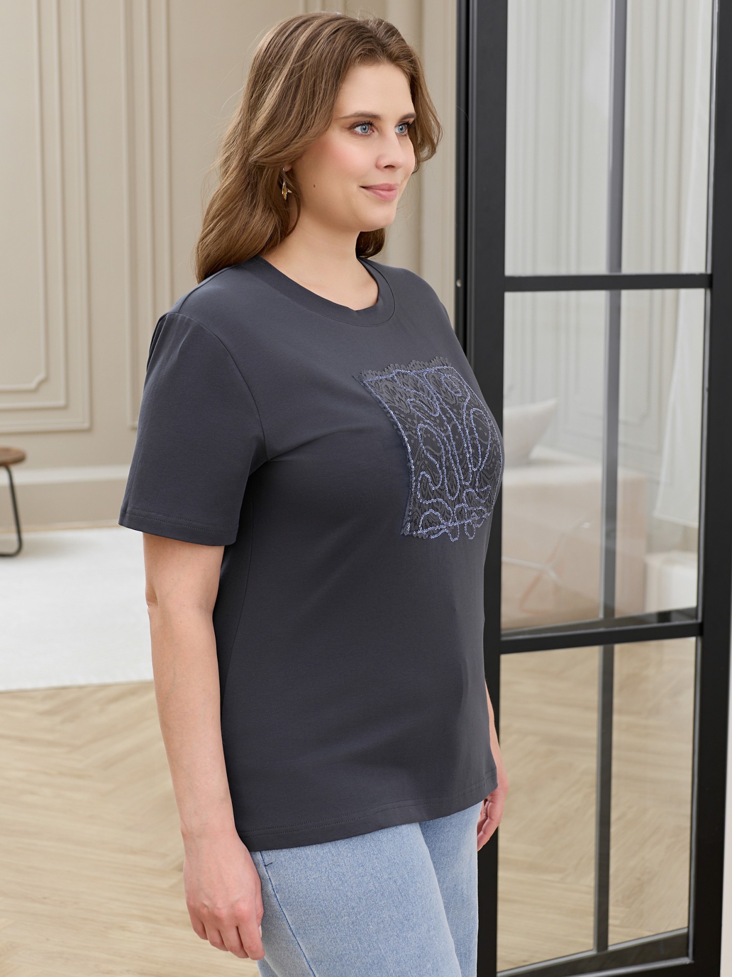 Футболка женская из гладкокрашеного трикотажного полотна «кулирка с лайкрой», полуприталенного силуэта, с горловиной овальной формы, обработанной втачной планкой и короткими рукавами. На полочке выполнена объемная вышивка «пайетками» на гипюровом кружеве в контрастных цветах.