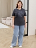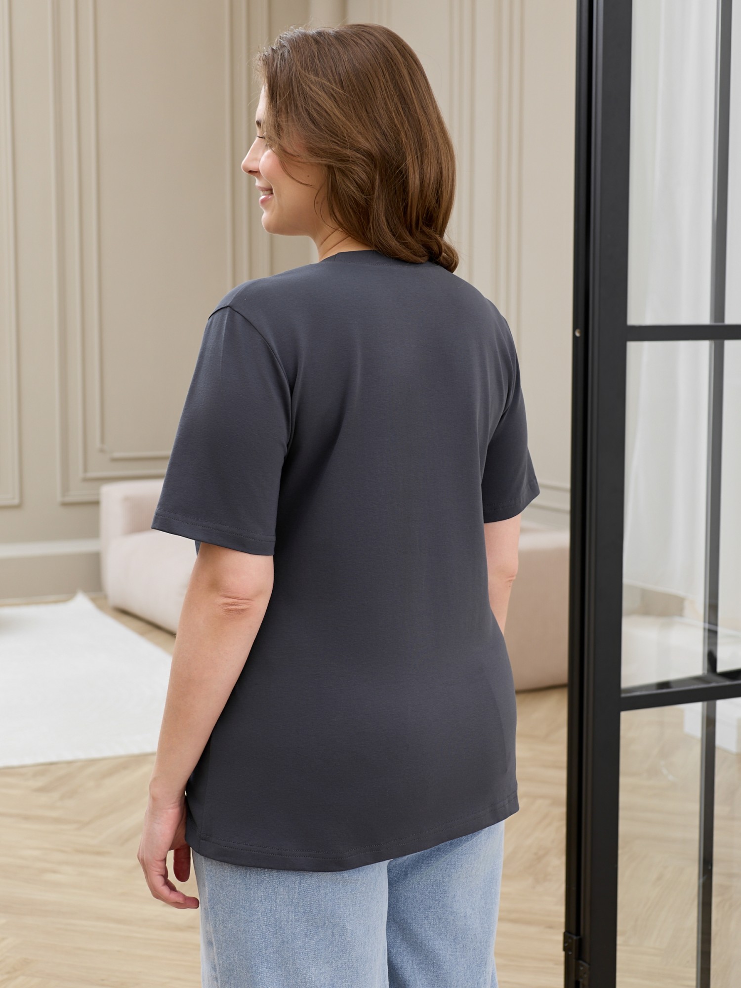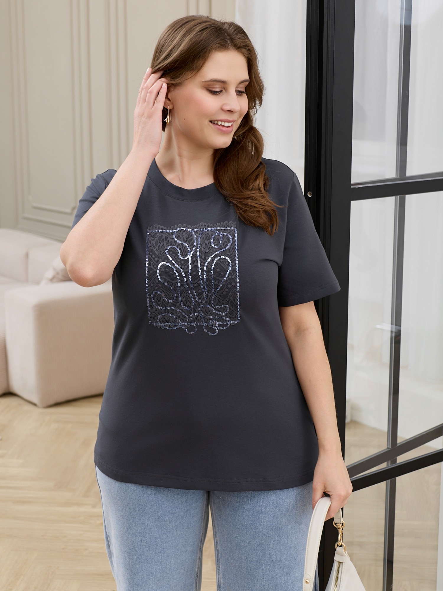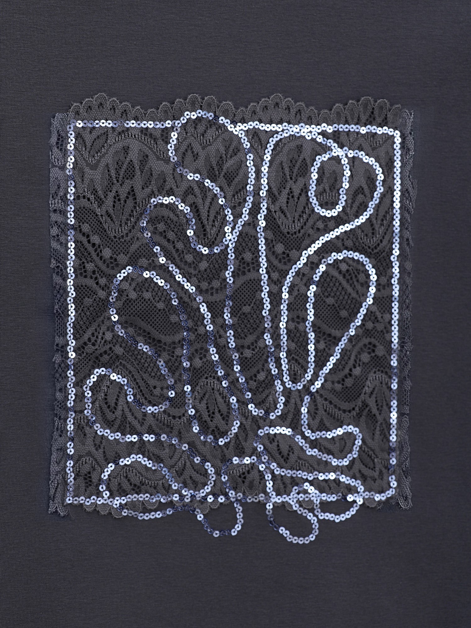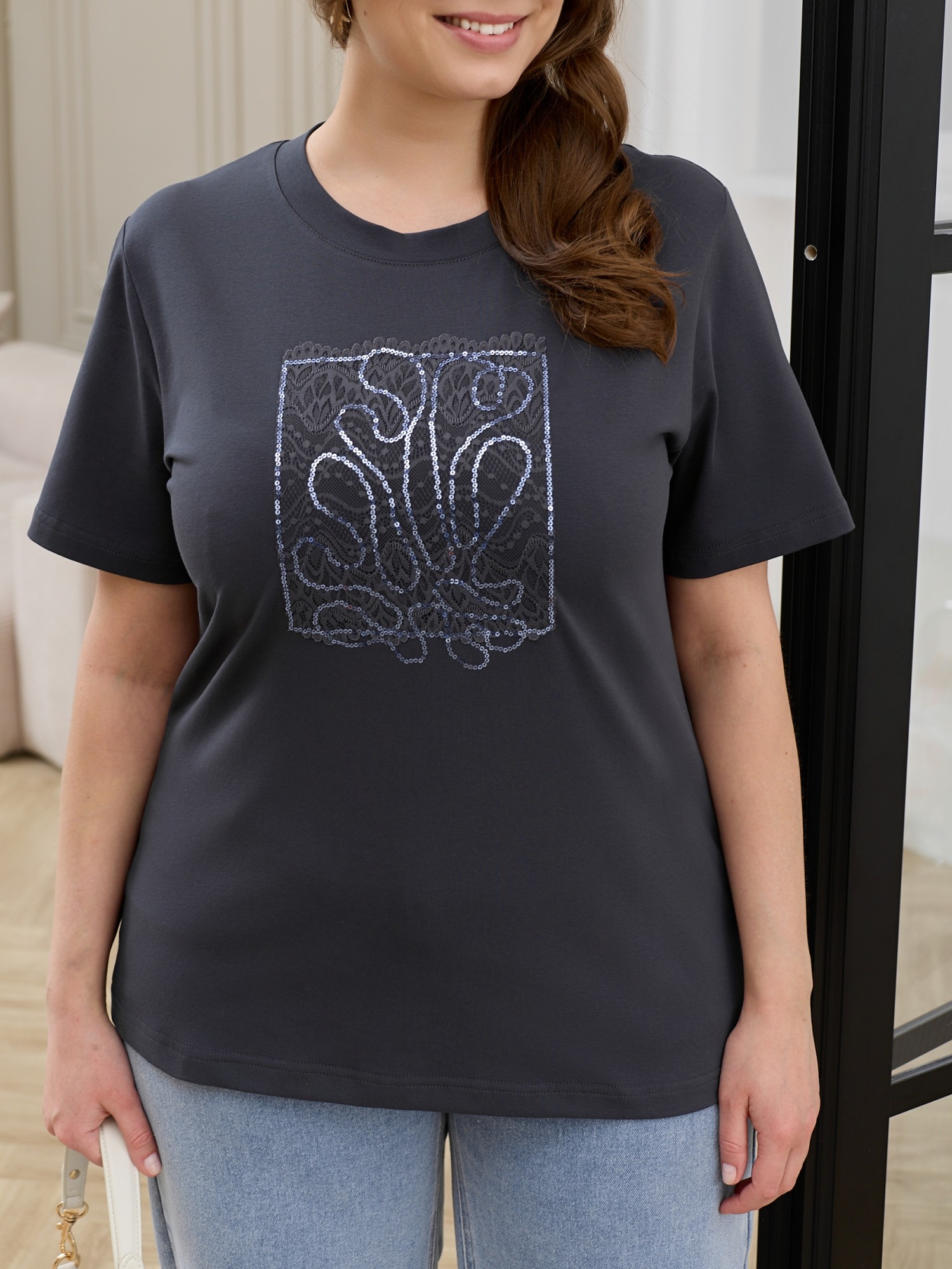 Футболка женская из гладкокрашеного трикотажного полотна «кулирка с лайкрой», полуприталенного силуэта, с горловиной овальной формы, обработанной втачной планкой и короткими рукавами. На полочке выполнена объемная вышивка «пайетками» на гипюровом кружеве в контрастных цветах.