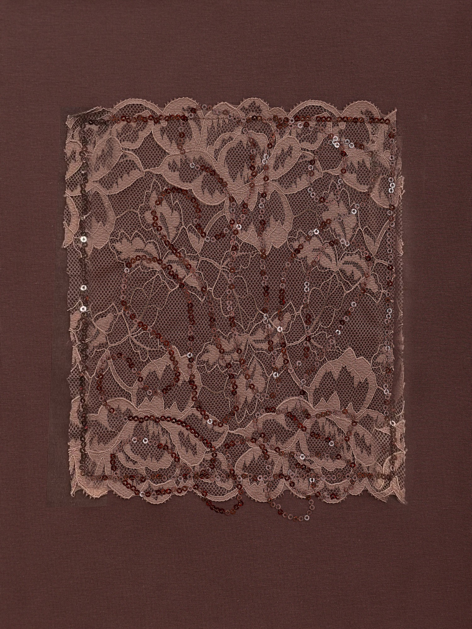 Футболка женская из гладкокрашеного трикотажного полотна «кулирка с лайкрой», полуприталенного силуэта, с горловиной овальной формы, обработанной втачной планкой и короткими рукавами. На полочке выполнена объемная вышивка «пайетками» на гипюровом кружеве в контрастных цветах.