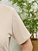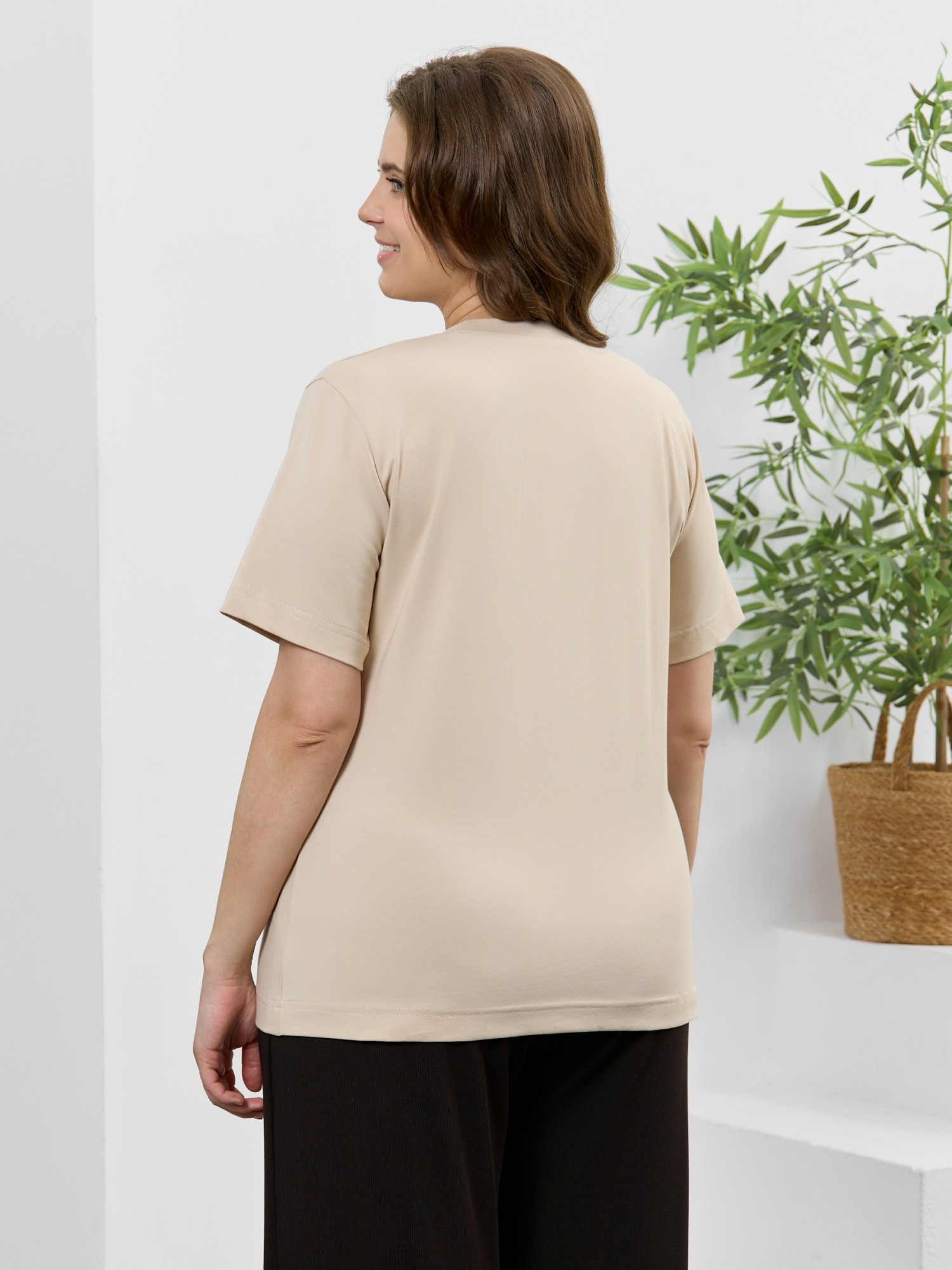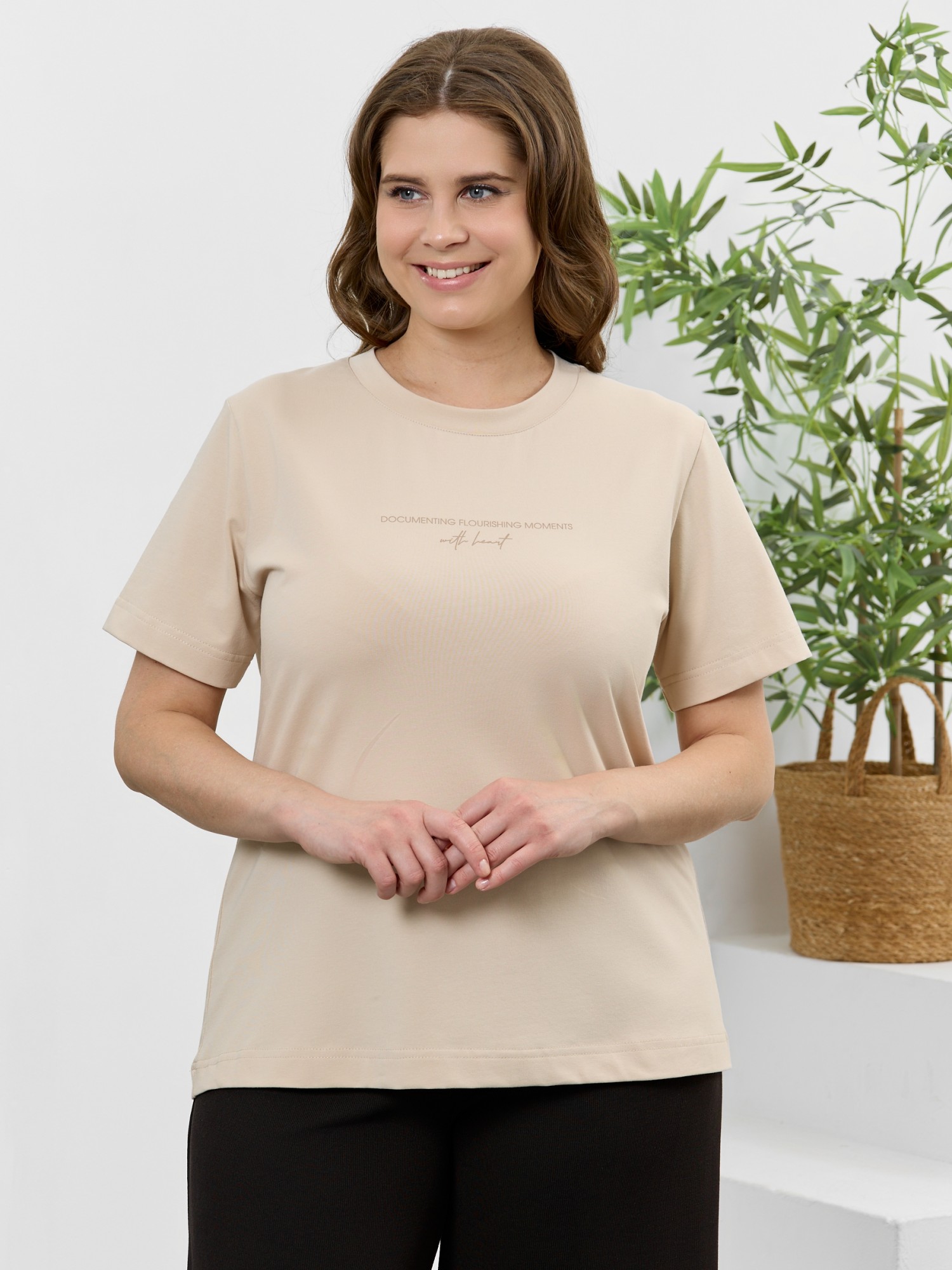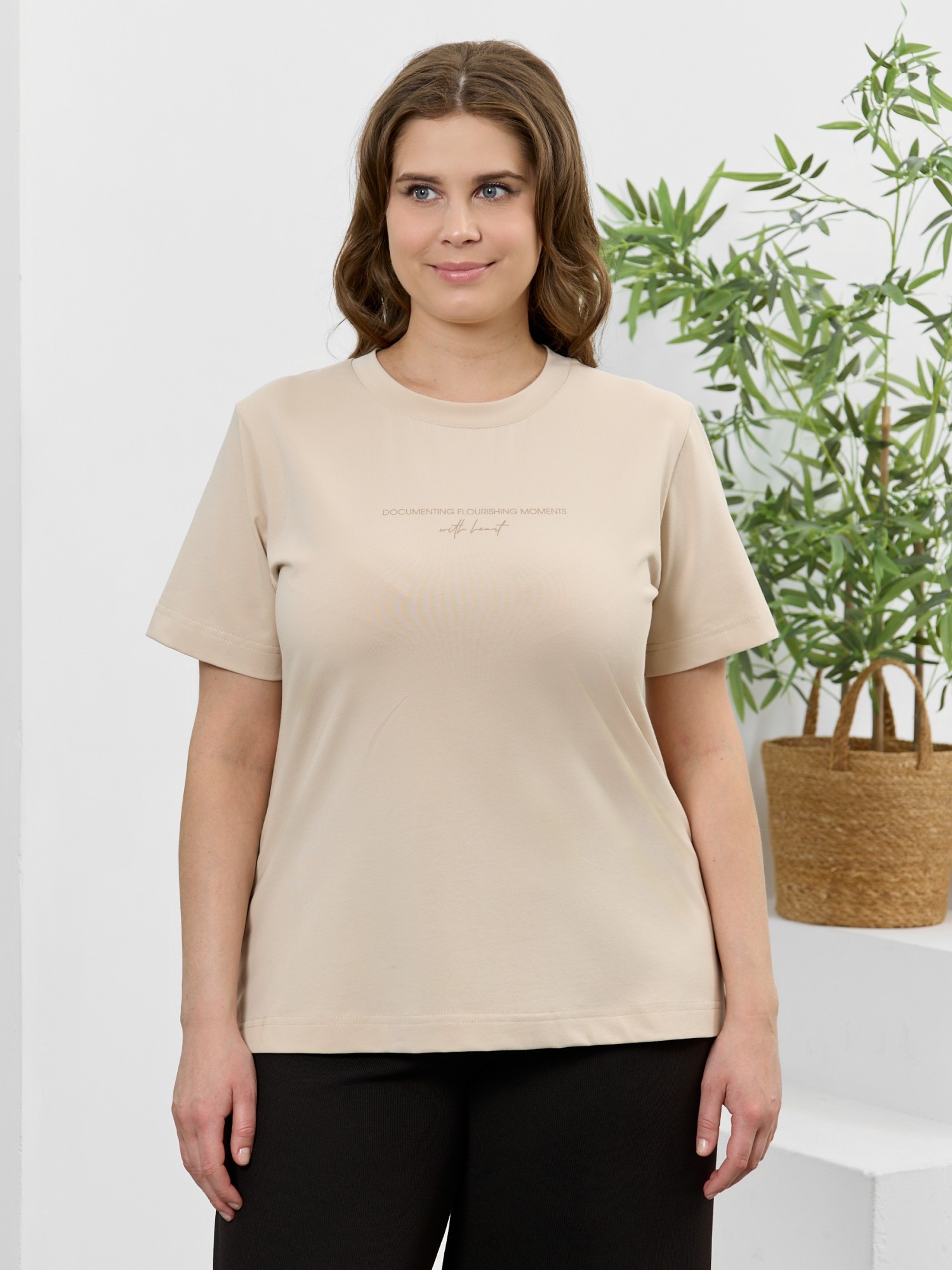 Футболка женская из гладкокрашеного трикотажного полотна «кулирка с лайкрой», полуприталенного силуэта, с втачными короткими рукавами. На полочке выполнена печать в технике «шелкографии». Горловина овальной формы обработана втачной планкой с отделочной строчкой по шву притачивания.