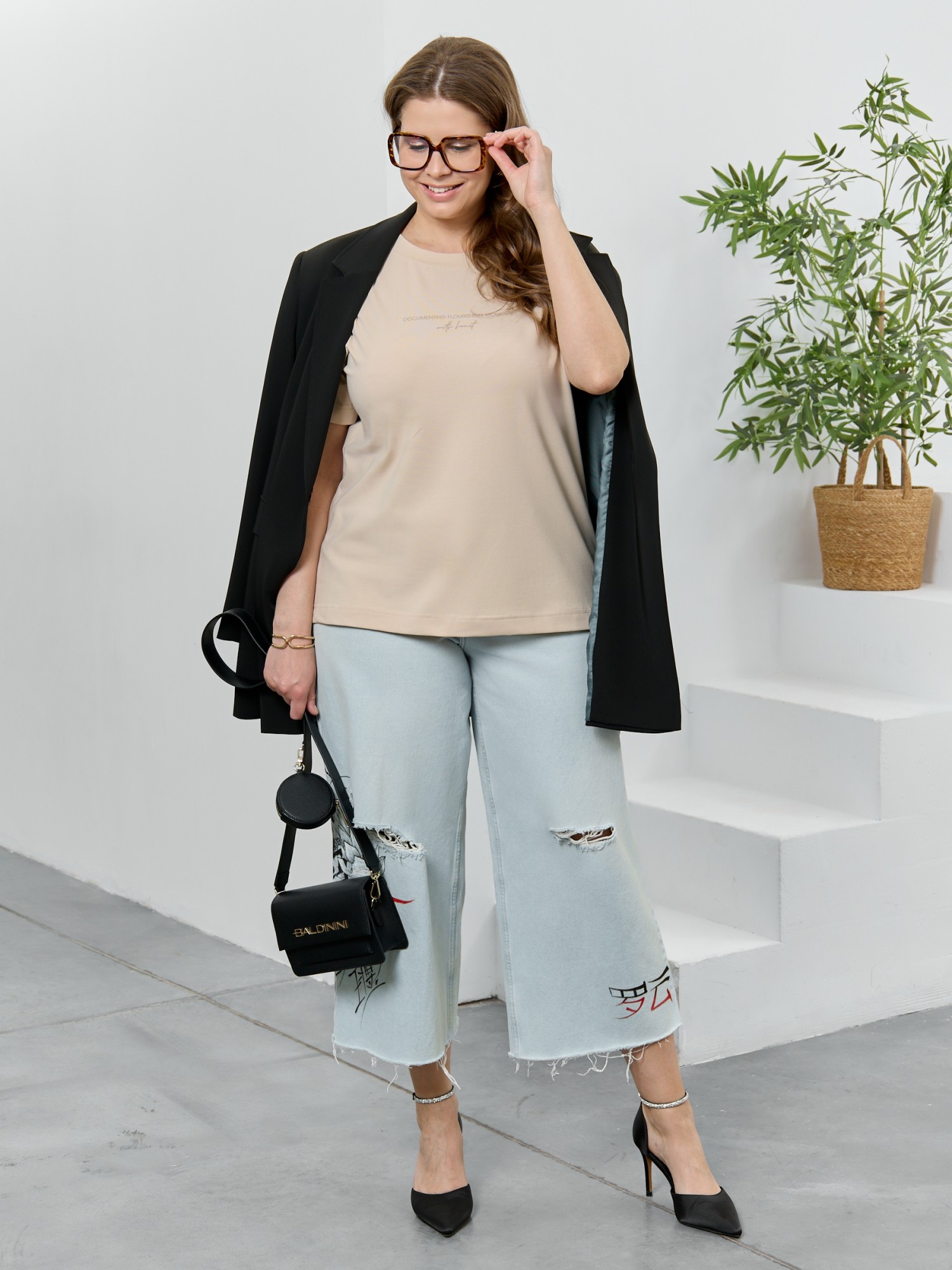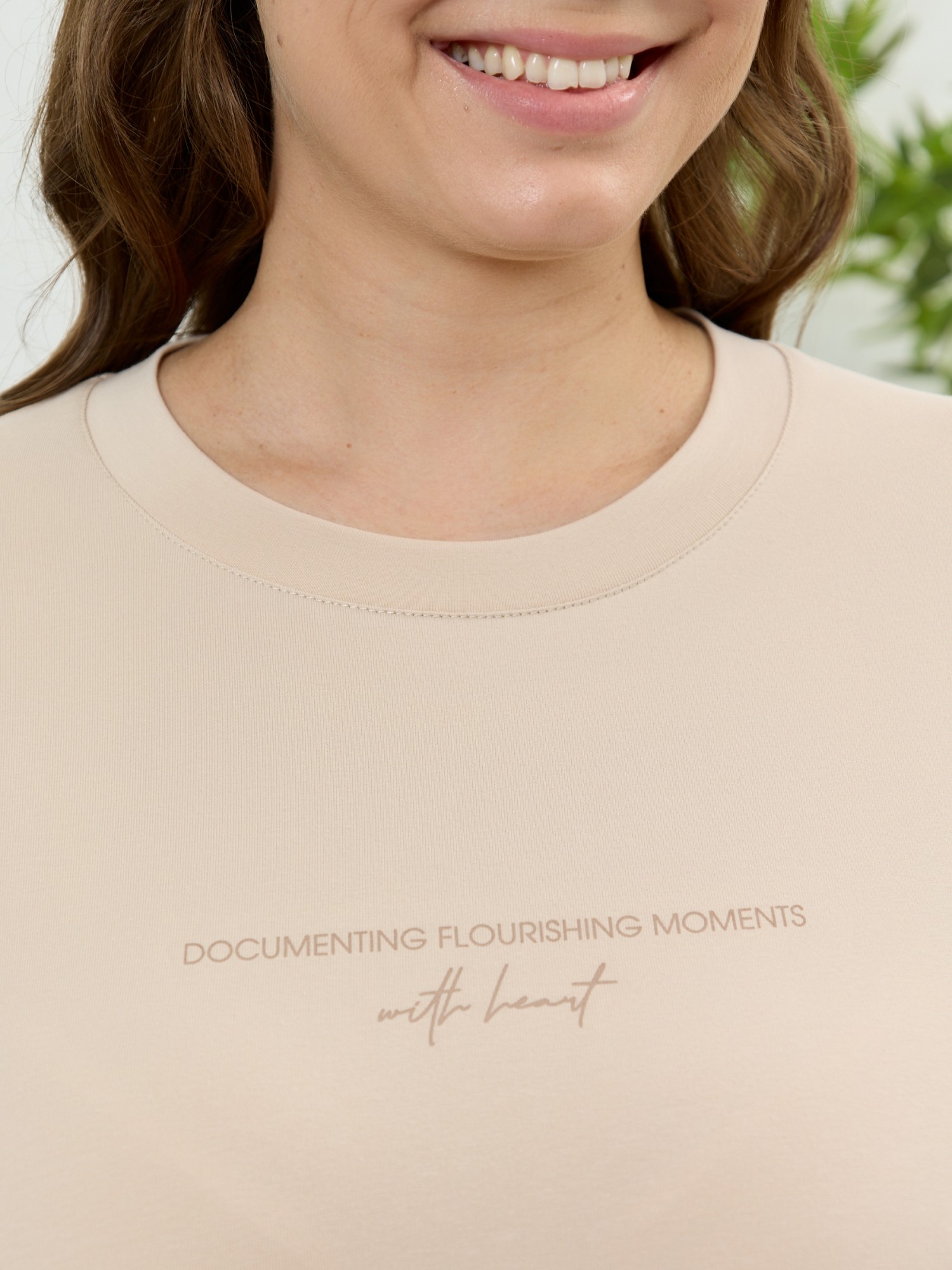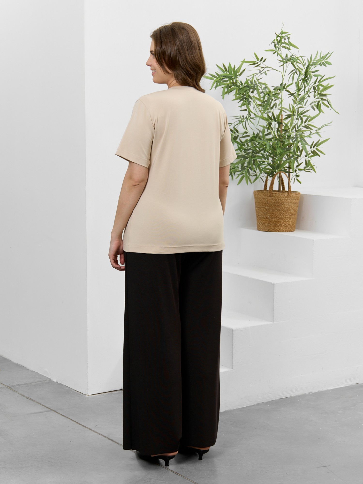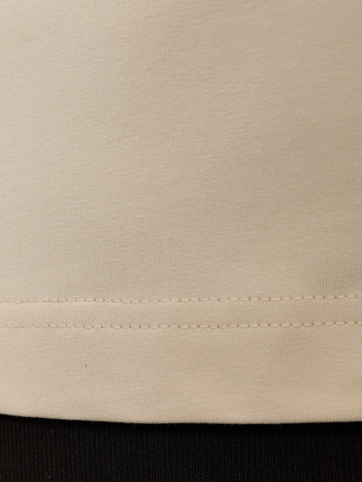 Футболка женская из гладкокрашеного трикотажного полотна «кулирка с лайкрой», полуприталенного силуэта, с втачными короткими рукавами. На полочке выполнена печать в технике «шелкографии». Горловина овальной формы обработана втачной планкой с отделочной строчкой по шву притачивания.