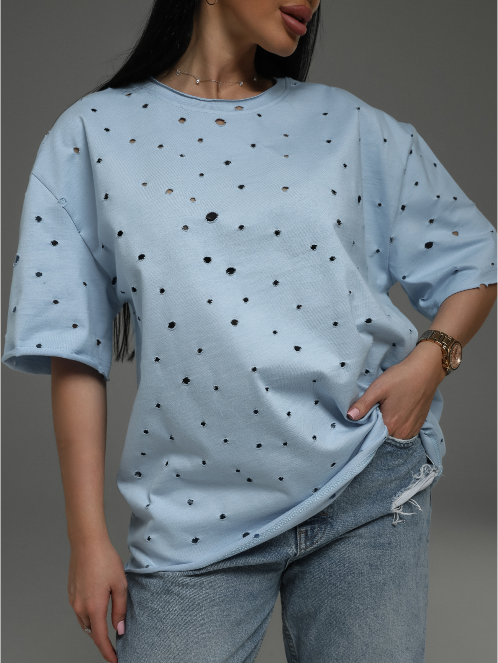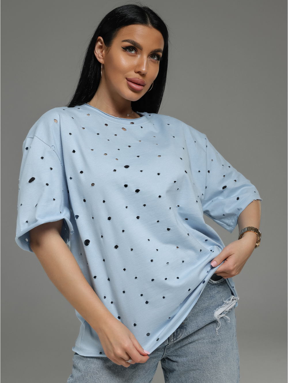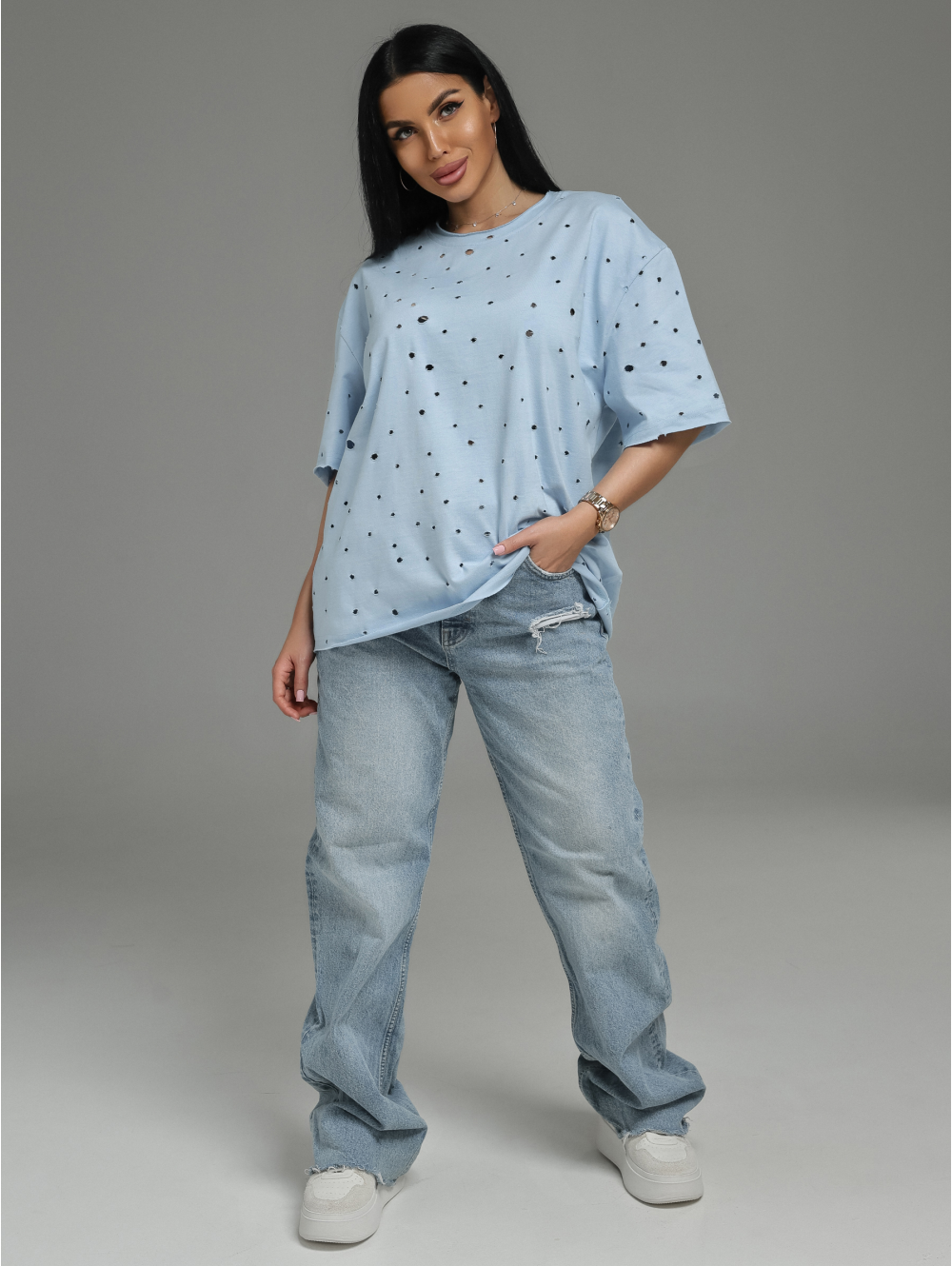 Лаконичная, но с характером. Футболка из дорогой ткани с интересной фактурой (деворе) и современной обработкой края. Она подойдёт для создания как минималистичных образов (с джинсами, брюками, шортами), так и более сложных многослойных сочетаний. Идеальный выбор для тех, кто ценит качество и небанальные детали.