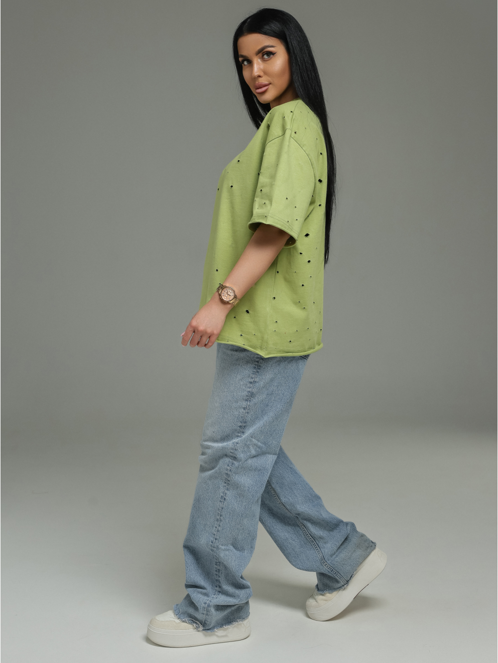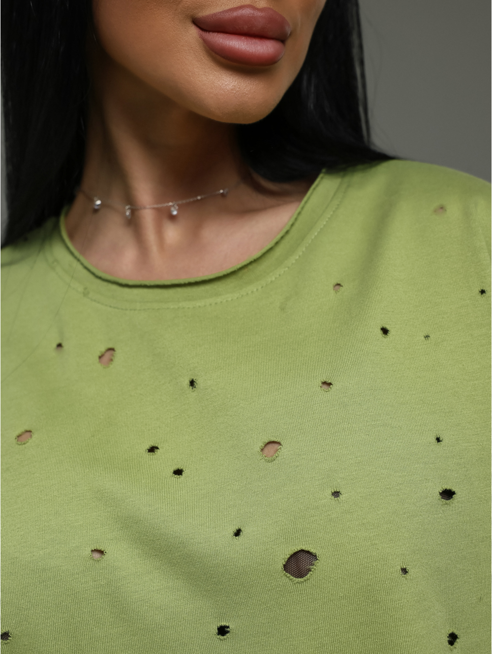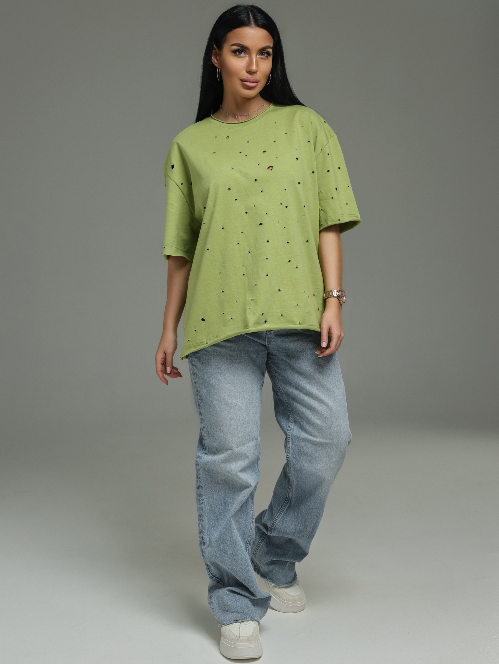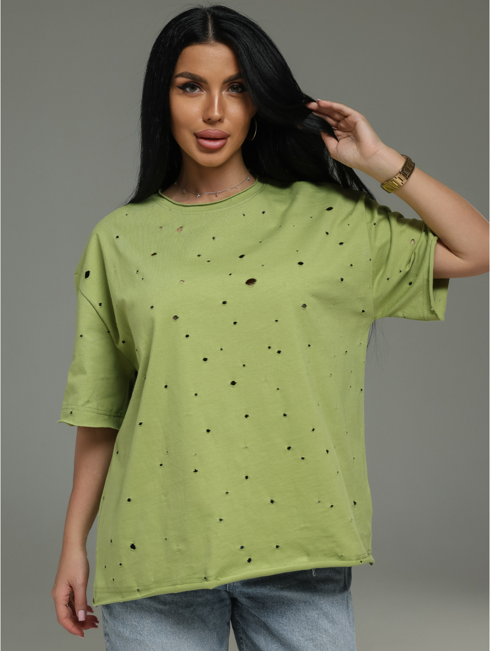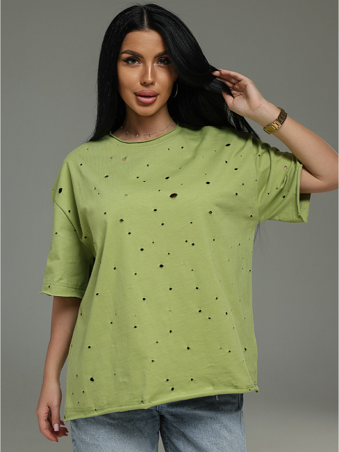 Лаконичная, но с характером. Футболка из дорогой ткани с интересной фактурой (деворе) и современной обработкой края. Она подойдёт для создания как минималистичных образов (с джинсами, брюками, шортами), так и более сложных многослойных сочетаний. Идеальный выбор для тех, кто ценит качество и небанальные детали.