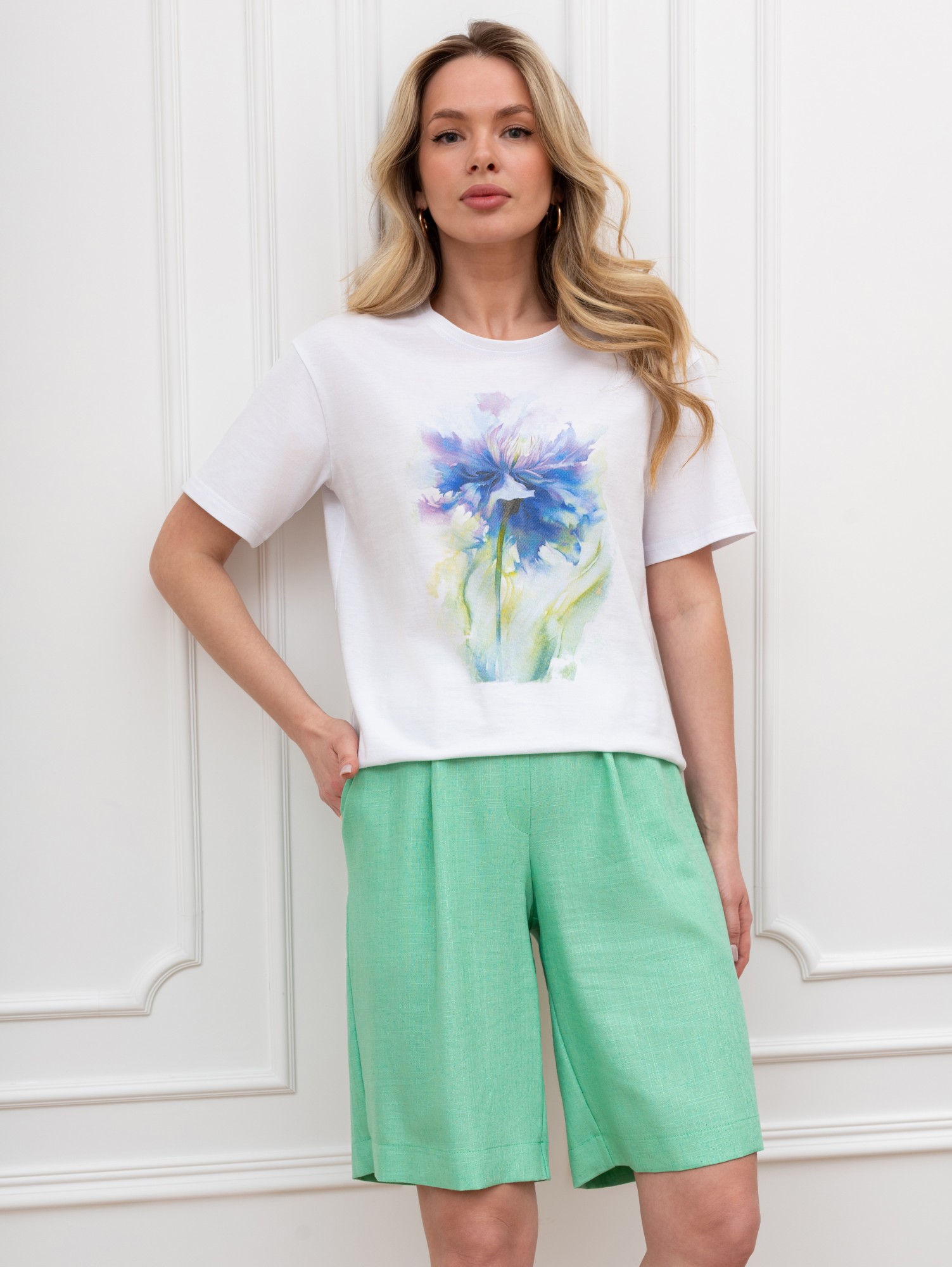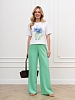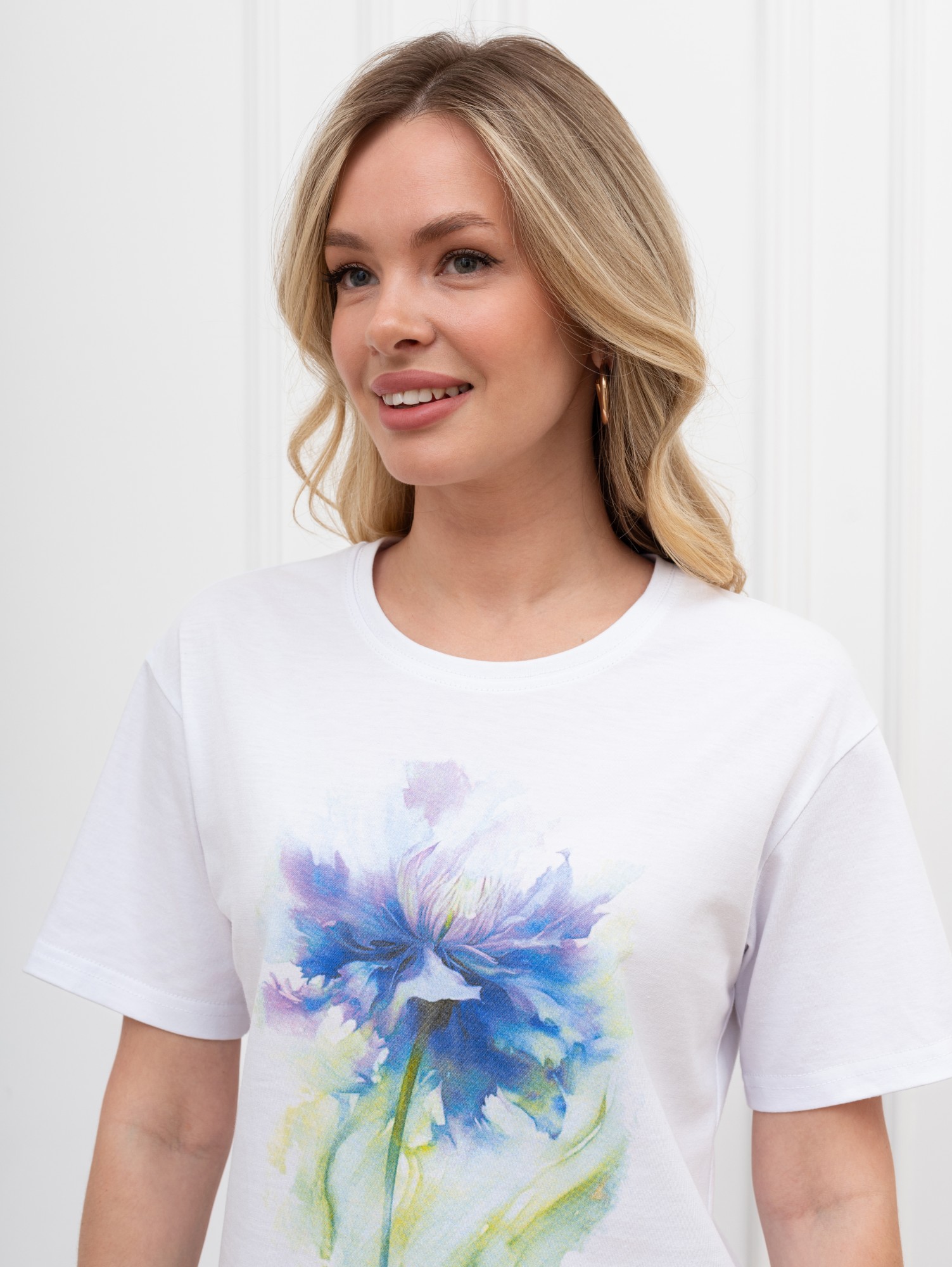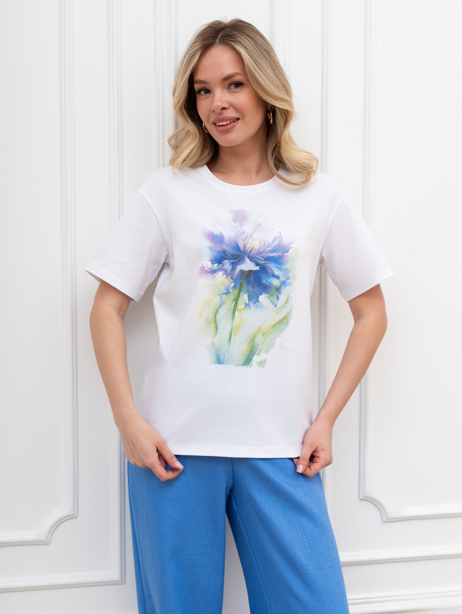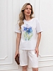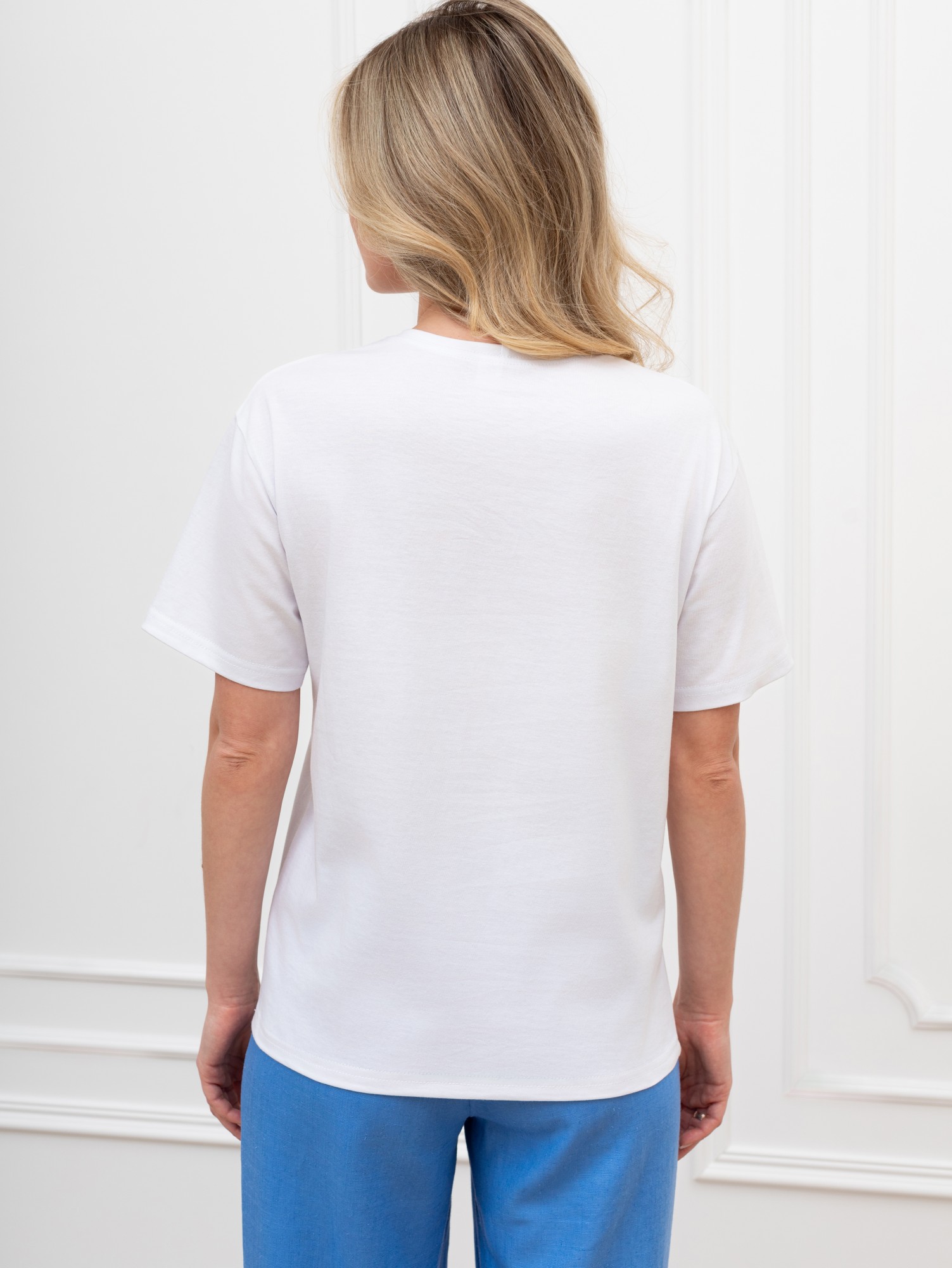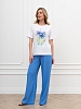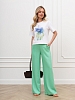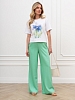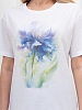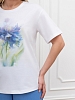 Футболка женская из гладкокрашеного трикотажного полотна «кулирка», классического кроя, с горловиной овальной формы, короткими втачными рукавами. На полочке выполнена печать в технике «шелкографии», горловина обработана втачной планкой с отделочной строчкой по шву притачивания.