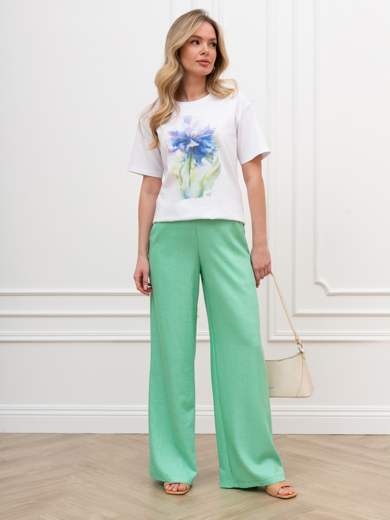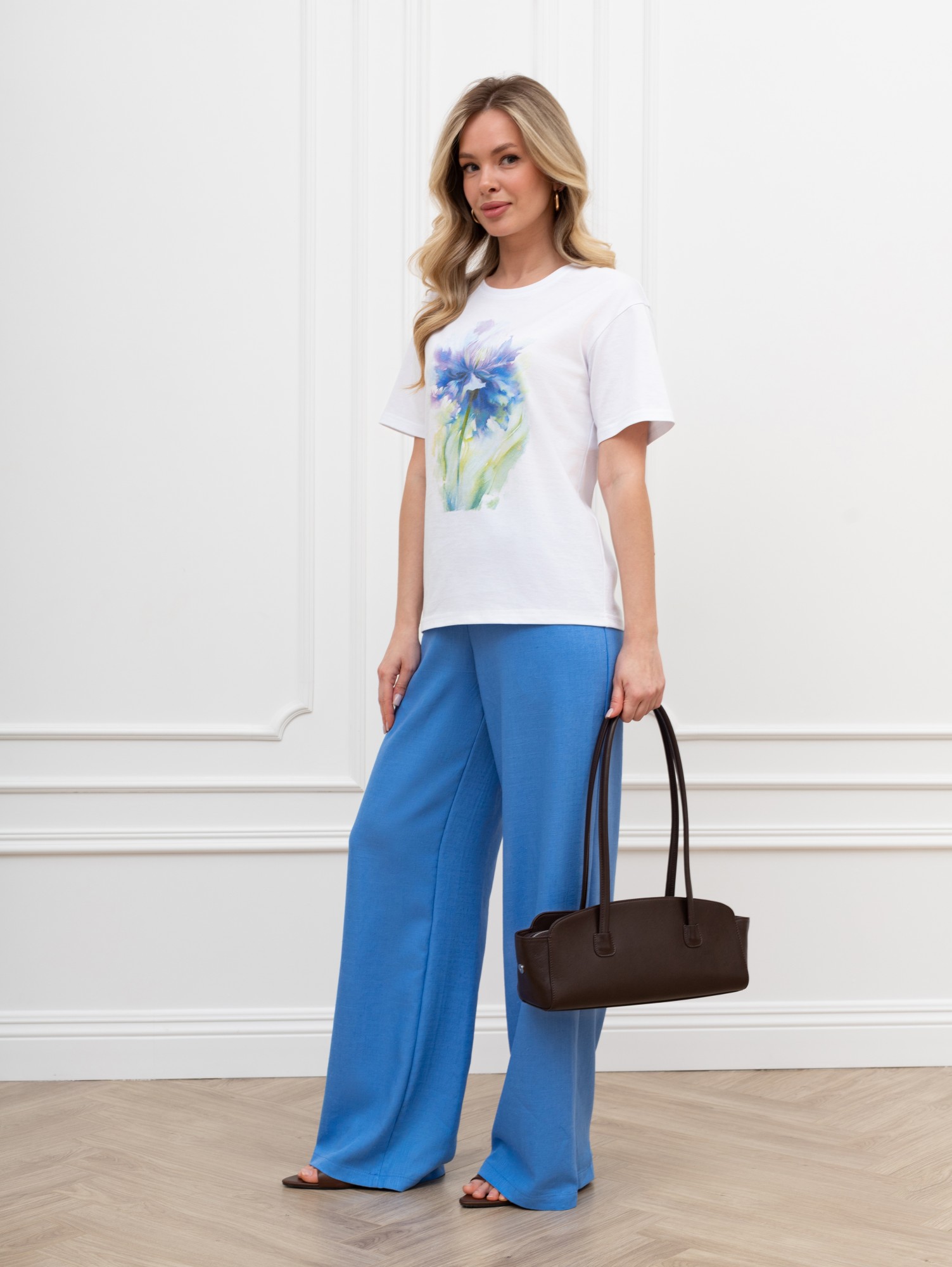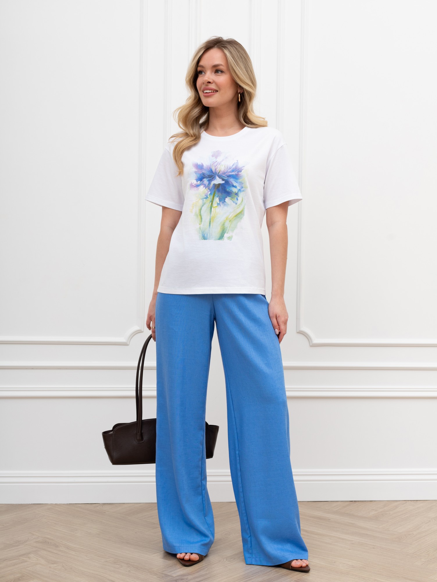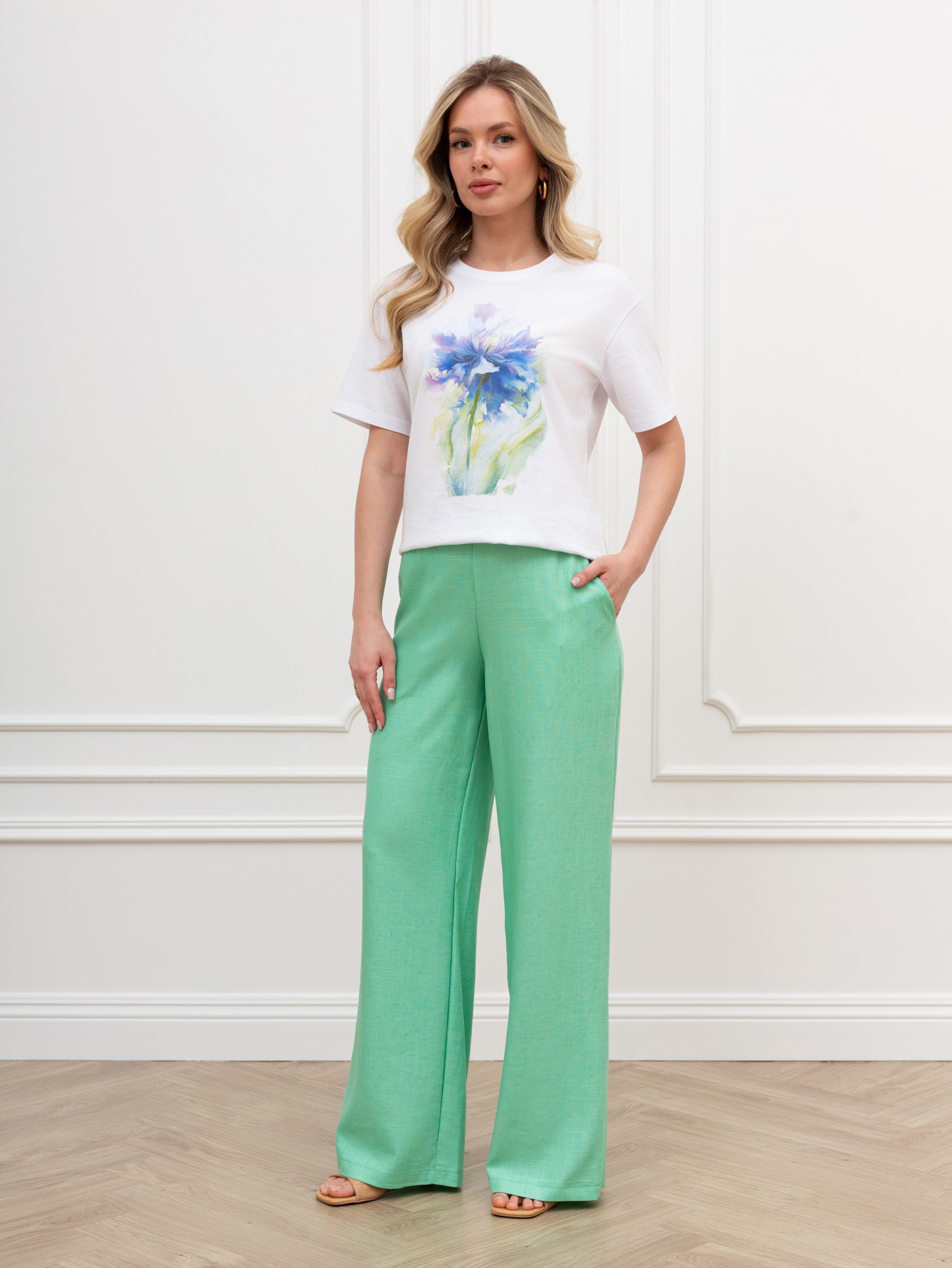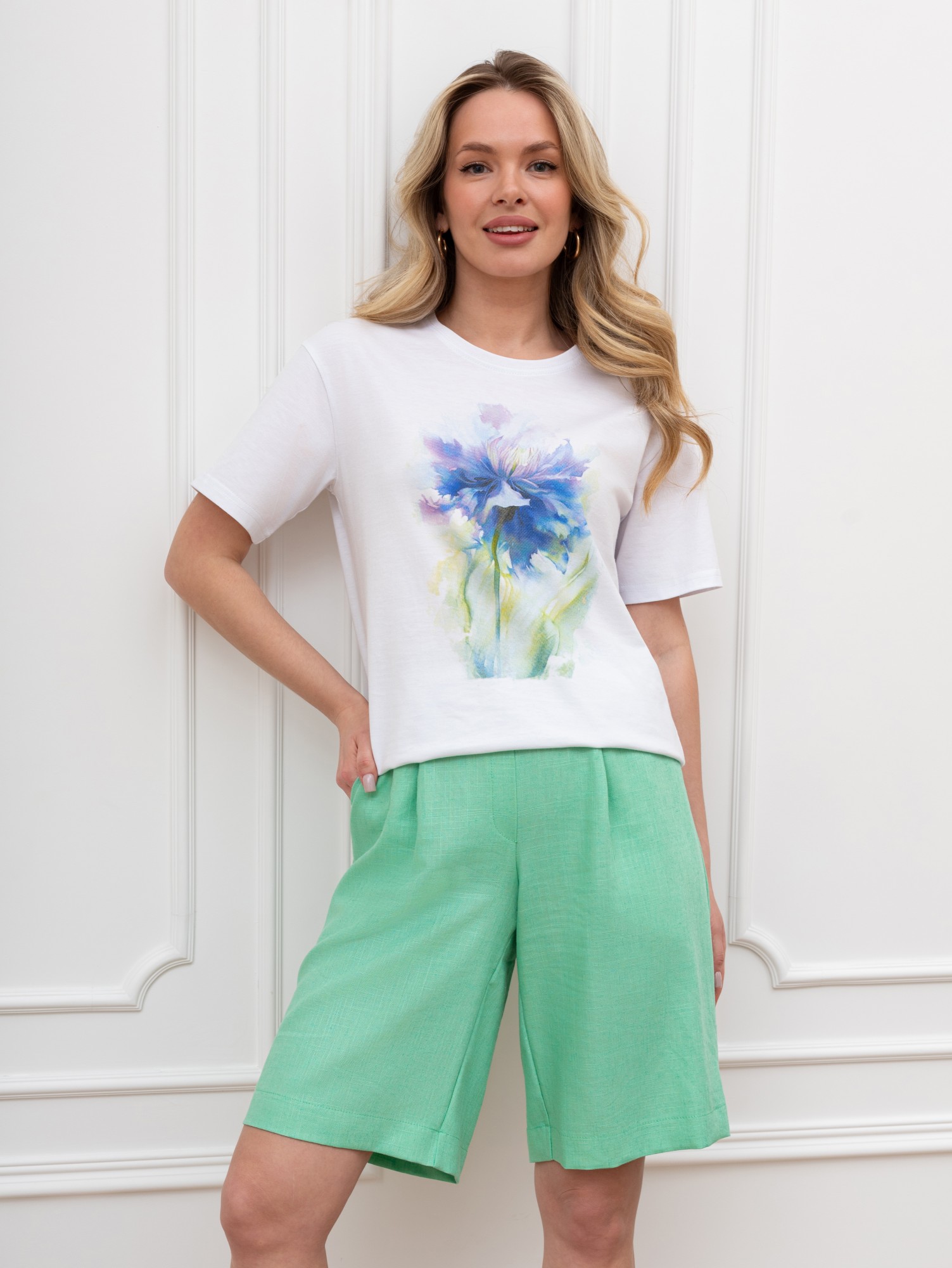 Футболка женская из гладкокрашеного трикотажного полотна «кулирка», классического кроя, с горловиной овальной формы, короткими втачными рукавами. На полочке выполнена печать в технике «шелкографии», горловина обработана втачной планкой с отделочной строчкой по шву притачивания.