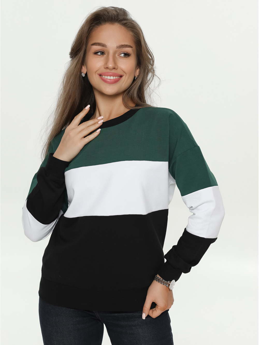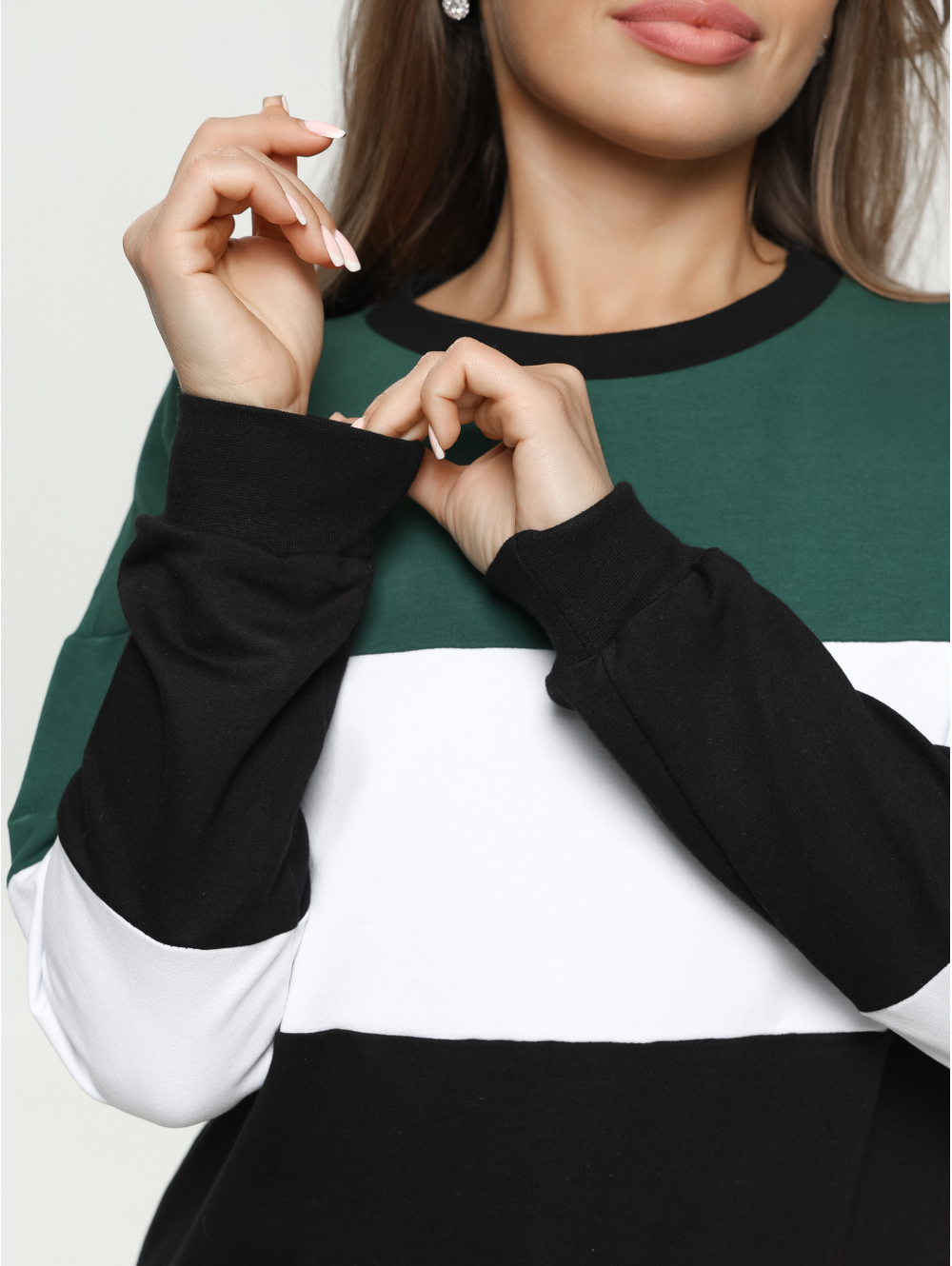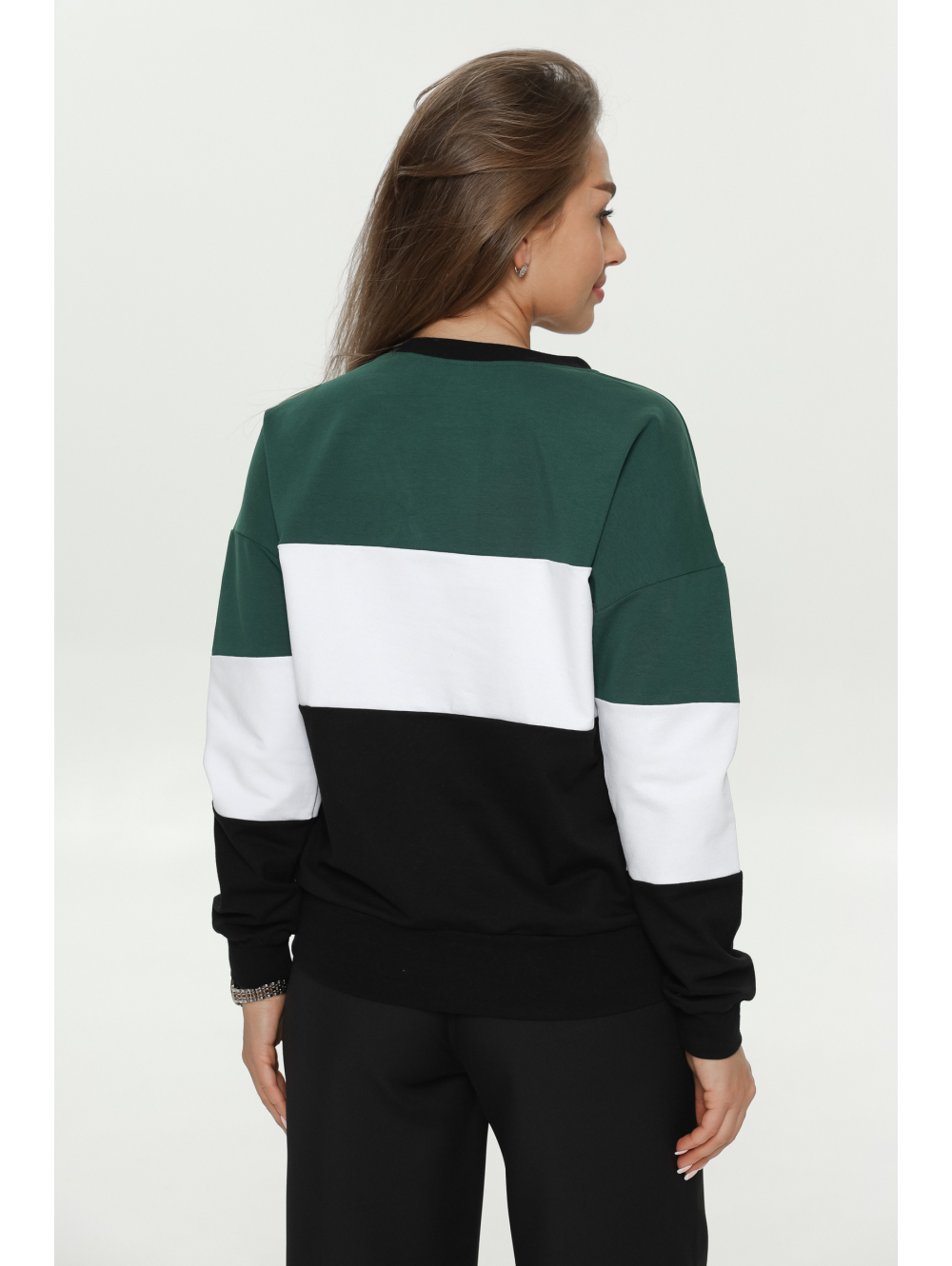 Удобный крой, не сковывающий движений, отсутствие пуговиц, молний, шнуровок. Горловина кофты круглая, рукава и низ изделия на манжете из рибаны.