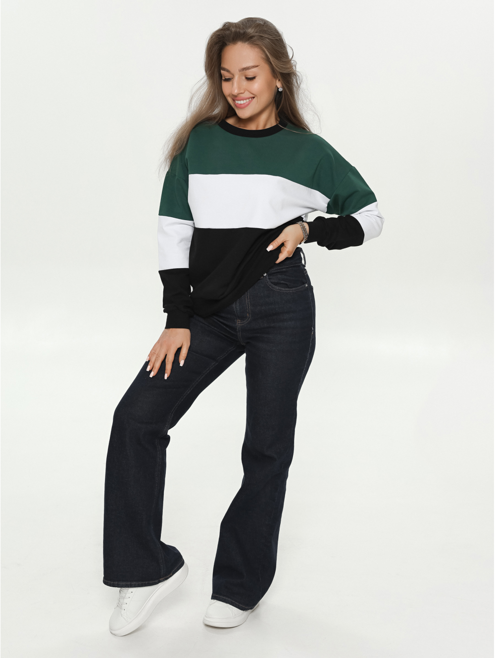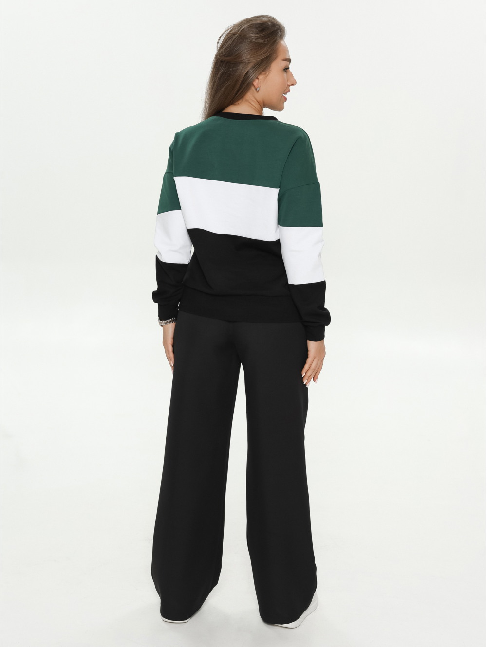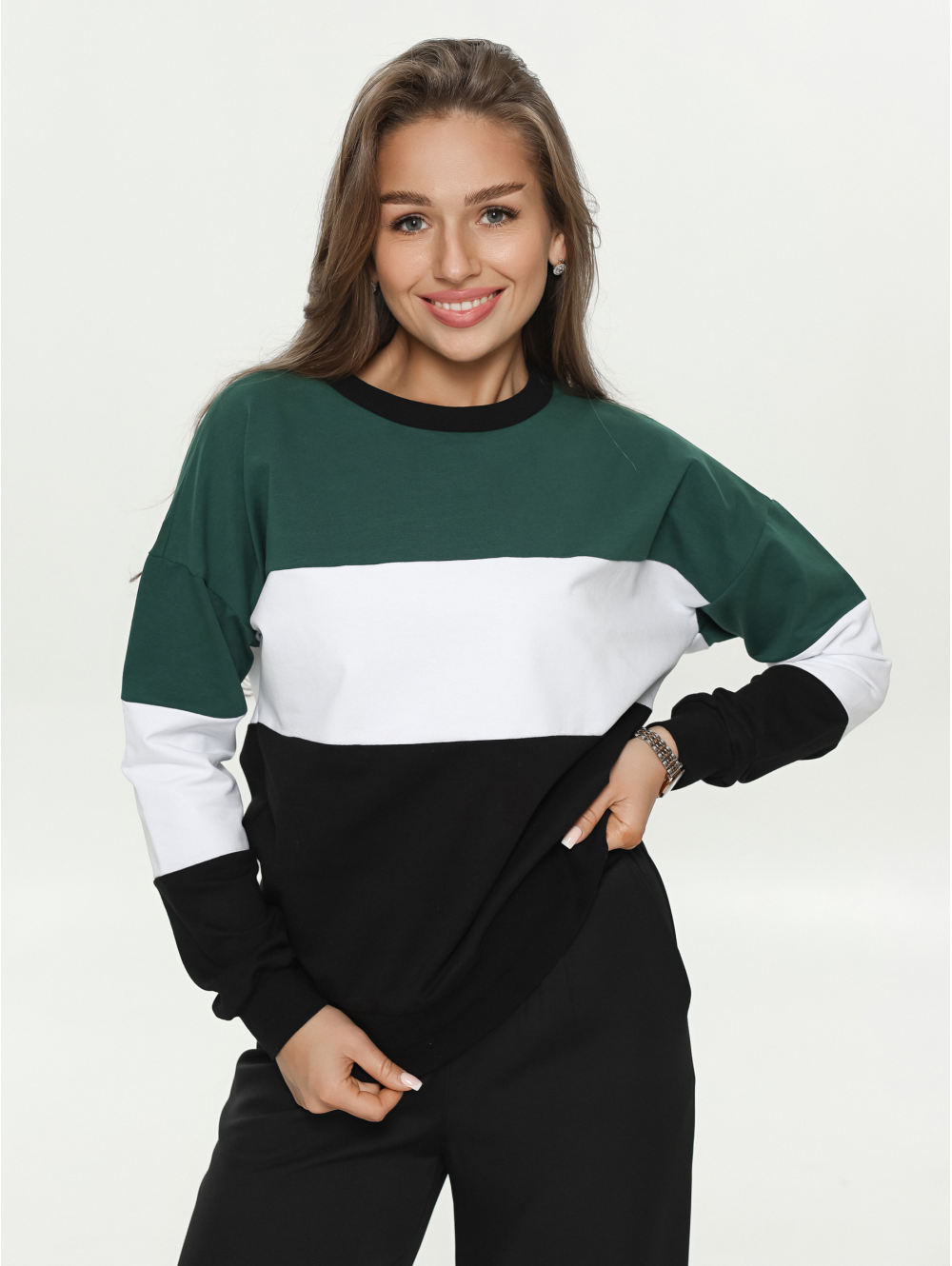 Удобный крой, не сковывающий движений, отсутствие пуговиц, молний, шнуровок. Горловина кофты круглая, рукава и низ изделия на манжете из рибаны.