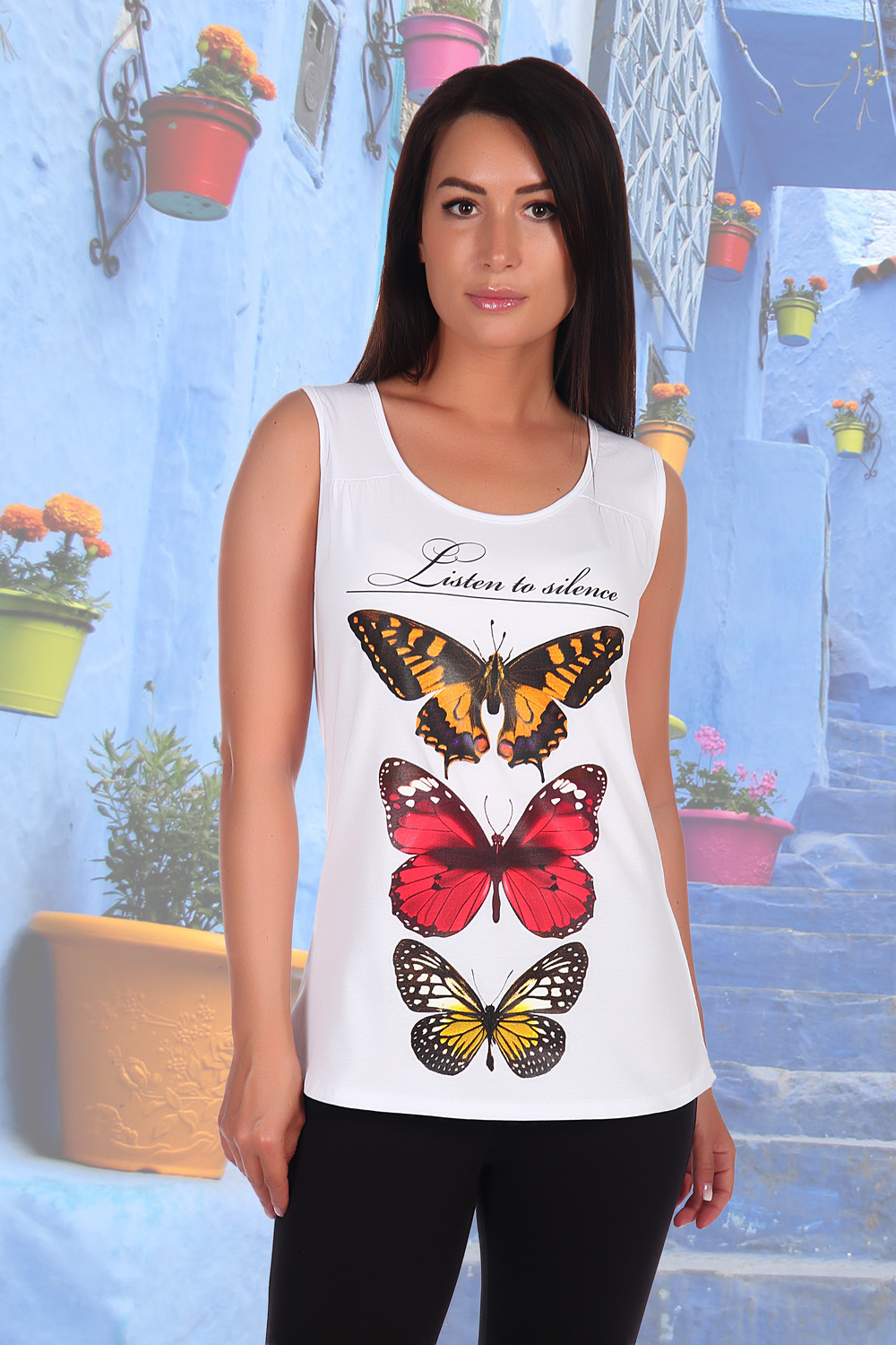Майка женская с красивым принтом бабочки и перепадом длины