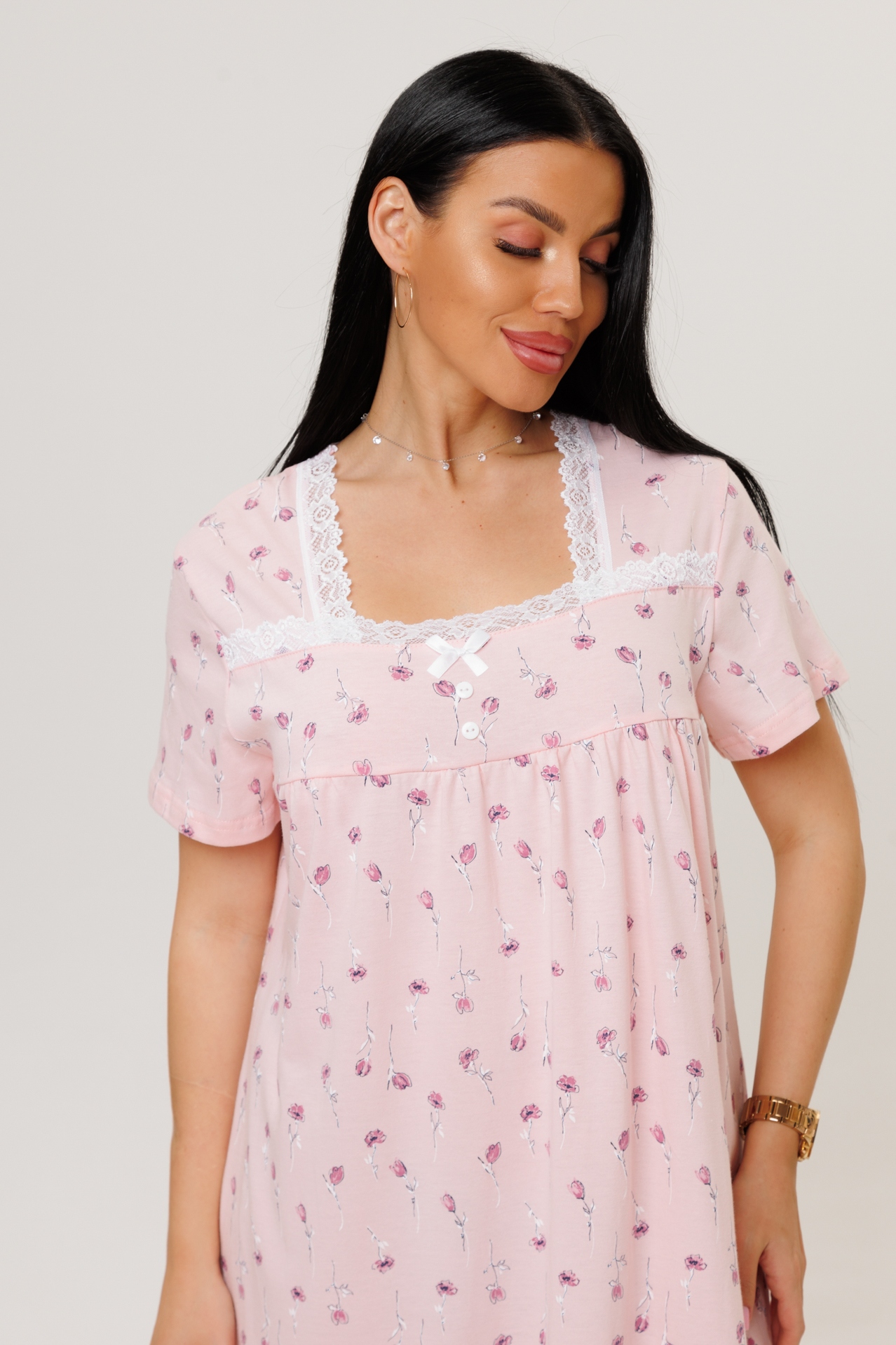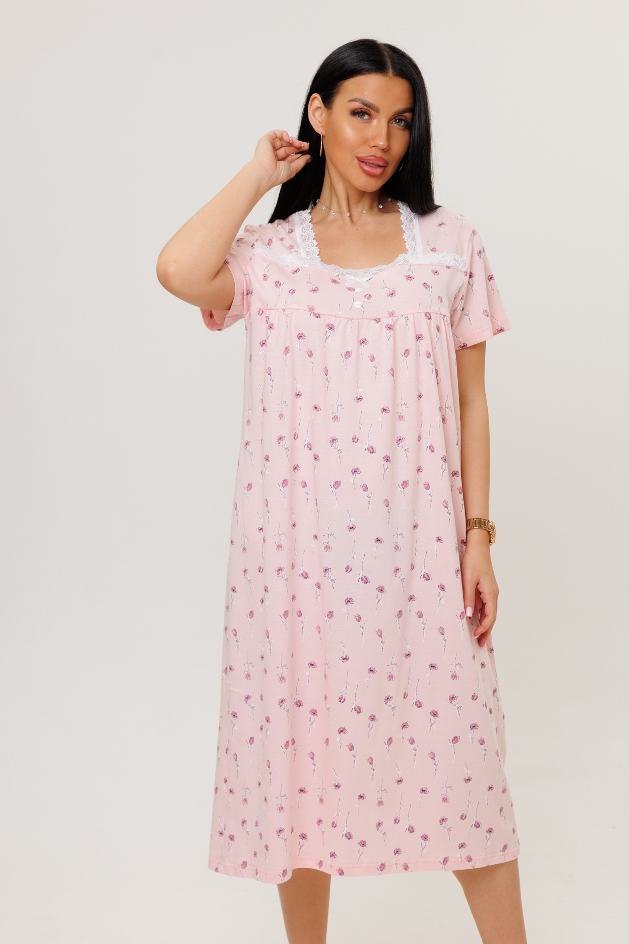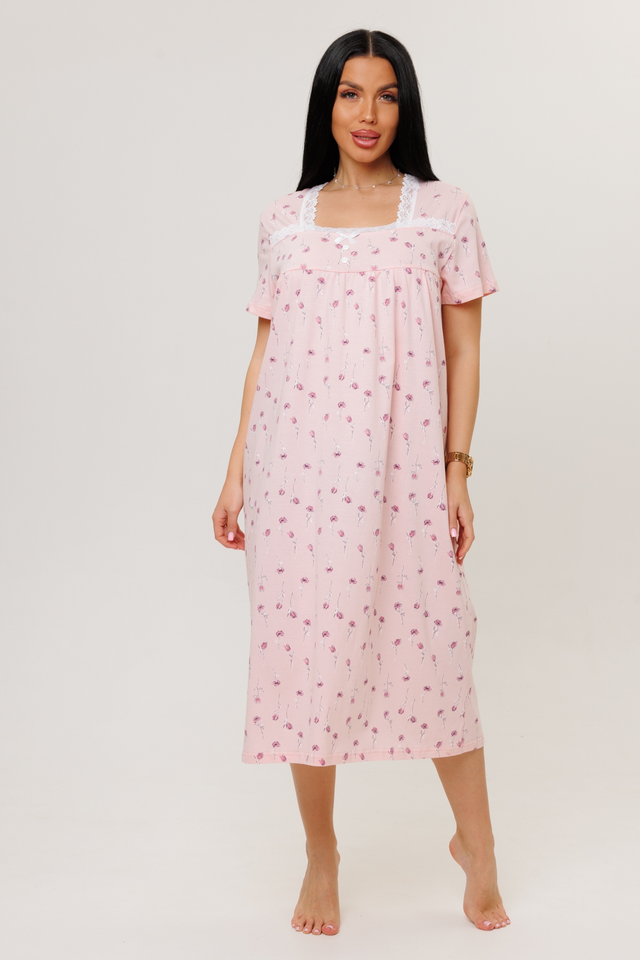 Женская сорочка из кулирки с короткими рукавами — это трикотажная одежда для сна или домашнего использования, изготовленная из тонкого хлопкового полотна. Кулирка — мягкое и гигроскопичное полотно, которое хорошо пропускает воздух и не вызывает аллергии.
