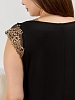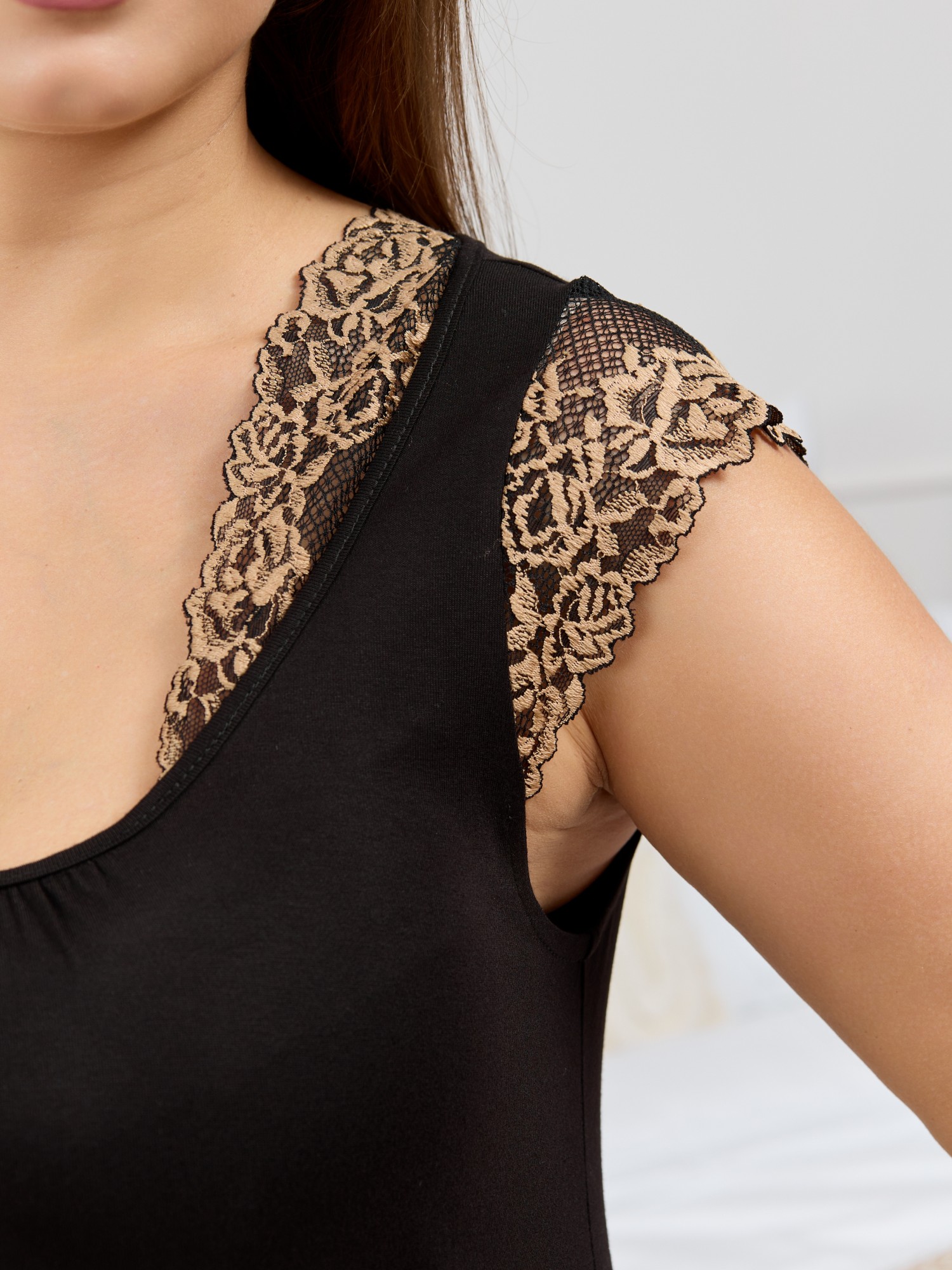 Сорочка женская из гладкокрашеного вискозного трикотажного полотна, свободного покроя, слегка расширенная к низу, с втачными рукавами - «крылышками», выполненными из кружева и втачанными в верхние части пройм. Расширенная иуглубленная горловина с кружевными отделочными деталями и сборкой по центру, окантована основным материалом.