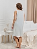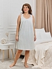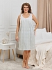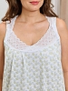 Сорочка женская из трикотажного полотна «кулирка» слегка расширенная книзу, без рукавов. Кружевные детали кокетки на полочке образуют V-ный вырез горловины. На нижней части полочки по шву притачивания кружевной кокетки заложены симметричные складки, проймы окантованы основным материалом.