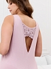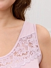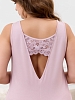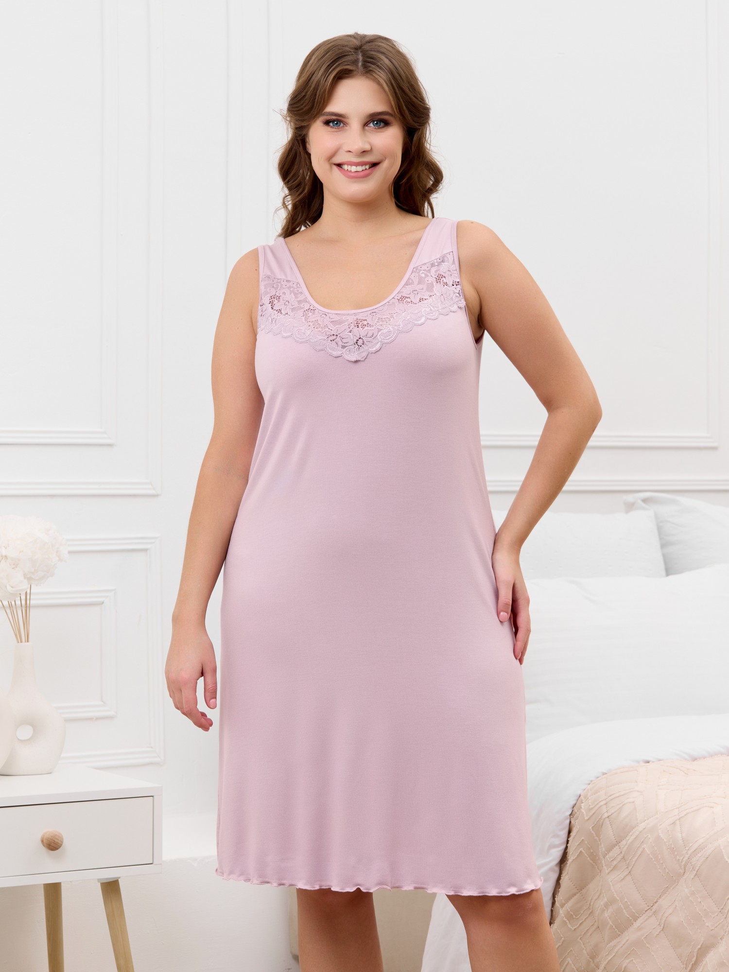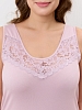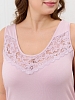 Сорочка женская из гладкокрашенного трикотажного вискозного полотна, слегка расширенная книзу, без рукавов на широких бретелях, с горловиной овальной формы. На полочке V- образная притачная кокетка из кружева, на спинке - углубленный вырез с кружевной поперечной вставкой. Горловина и проймы окантованы основным материалом, низ отделан узкой обметочной строчкой, создающей волнистый край.