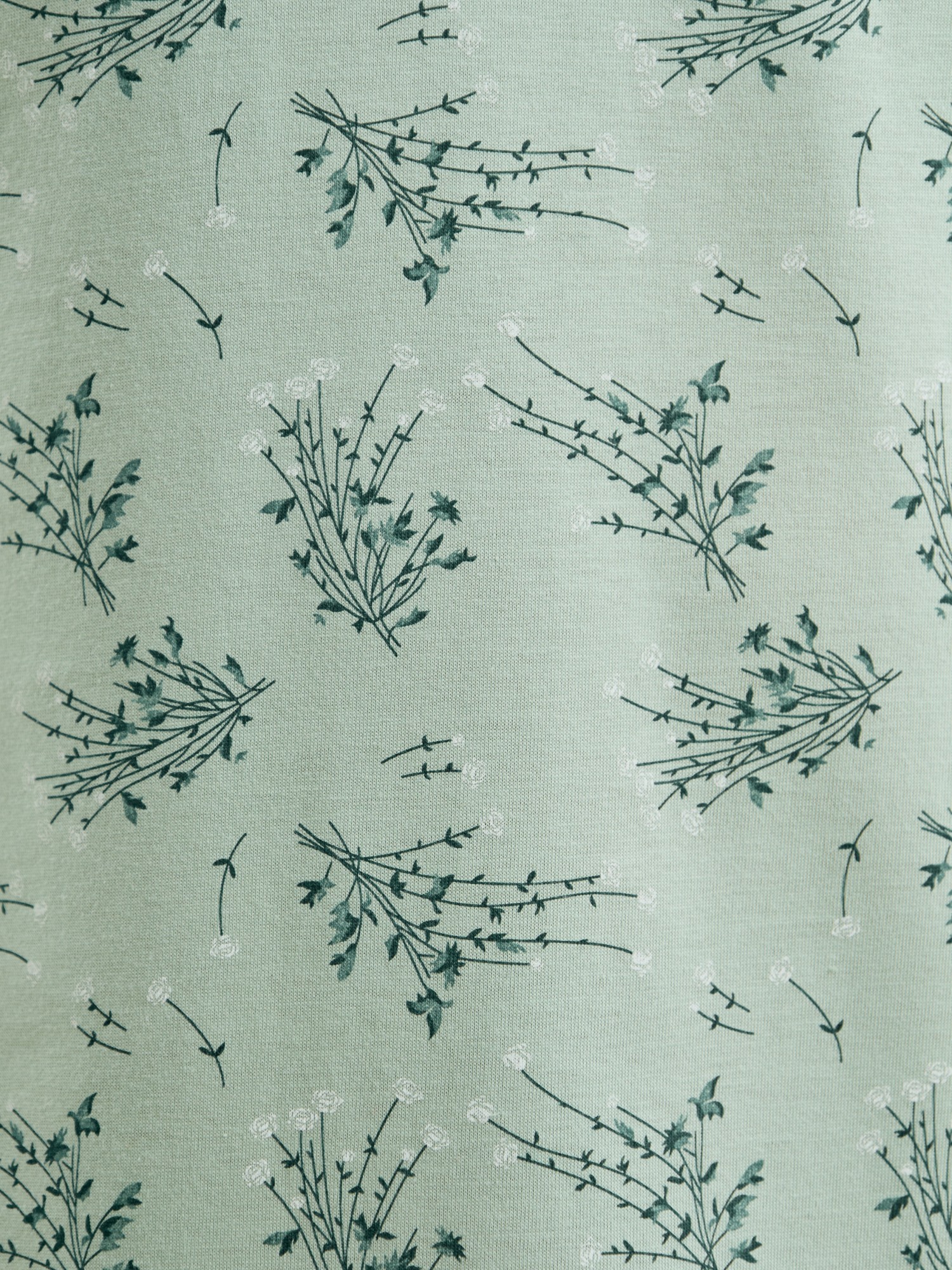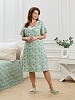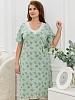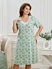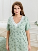Сорочка женская из трикотажного полотна «кулирка» с набивным рисунком, полуприталенного силуэта, слегка расширенная к низу, с короткими втачными рукавами. Горловина V- образной формы, обработана кружевом с фестонным краем, по центру настрочен декоративный бантик из узкой атласной тесьмы.